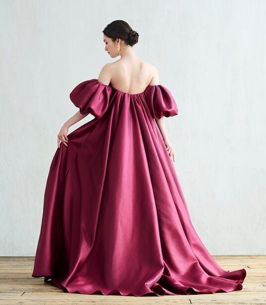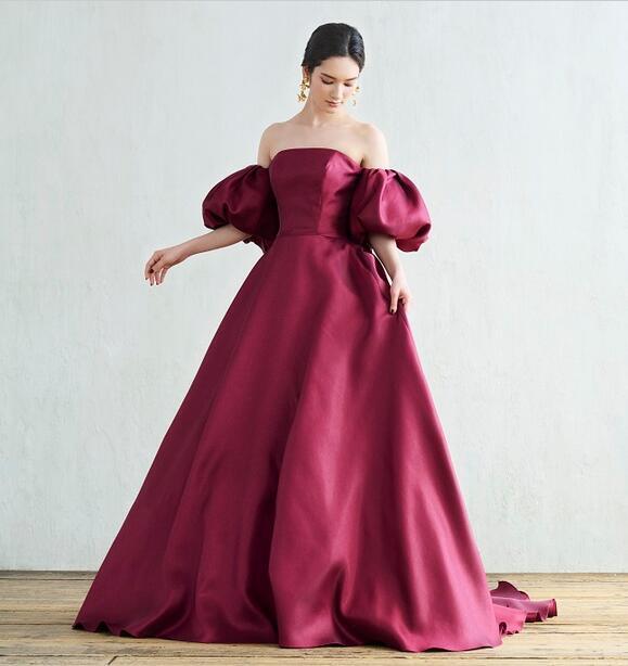 高品質!送料無料!カラードレス ワインレッド ベアトップ 紅色 ローズマダー 真紅/深紅 パフスリーブ マント 取り外し可能 かわいい 高級サテン トレーン オーダードレス ウエディングドレス ハンドメイド エレガント 優雅 花嫁 豪華 ハンドメイド オーダードレス 結婚式/前撮り/二次会/2次会/披露宴/演奏会/音楽会 ガーデンウェディング | David1021k Dress(ダヴィドレス)
