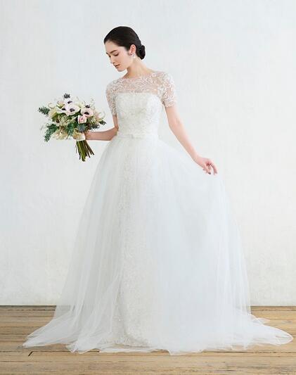 高品質!送料無料!ウエディングドレス 短袖 上品レース オーバースカート ソフトチュール かわいい 3D立体レース刺繍 トレーン 柔らかく重ねたチュールスカート オーダードレス ハンドメイド エレガント 優雅 花嫁 豪華 ハンドメイド オーダードレス 結婚式/前撮り/二次会/2次会/披露宴/演奏会/音楽会 ガーデンウェディング | David1021k Dress(ダヴィドレス)