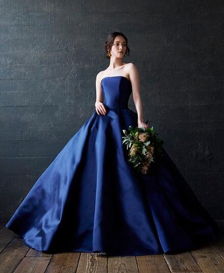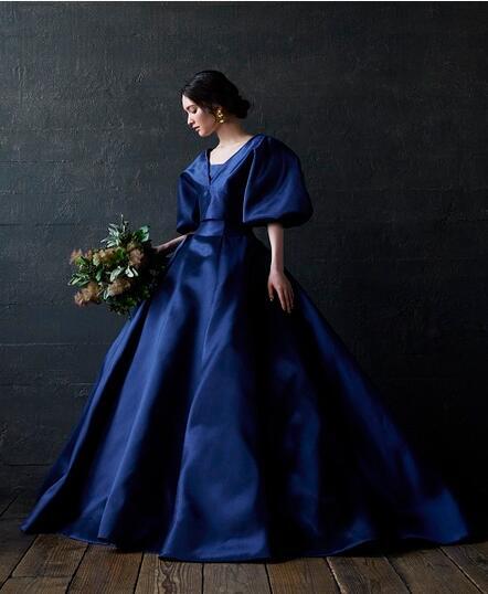 高品質!送料無料!カラードレス ベアトップ ネイビー色 パフスリーブ 2WAY かわいい 高級サテン トレーン オーダードレス ウエディングドレス ハンドメイド エレガント ガーデンウェディング 優雅 花嫁 豪華 セクシー 結婚式/前撮り/二次会/2次会/披露宴/演奏会/音楽会 | David1021k Dress(ダヴィドレス)