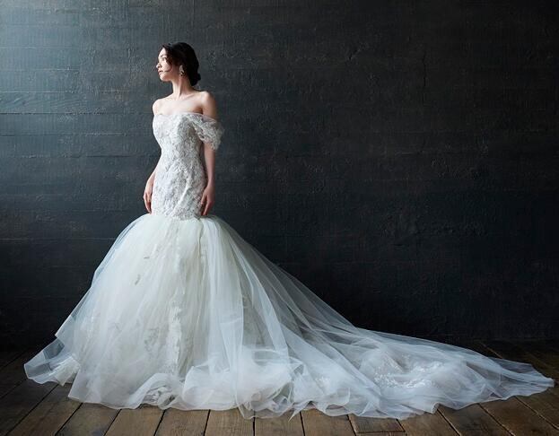 高品質!送料無料!ウエディングドレス オフショルダー マーメイドライン 上品レース 花柄のモチーフ刺繍が美しく かわいい エレガント 優雅 ハンドメイド トレーン オーダードレス ガーデンウェディング 花嫁 豪華 結婚式/前撮り/二次会/2次会/披露宴/演奏会/音楽会 | David1021k Dress(ダヴィドレス)