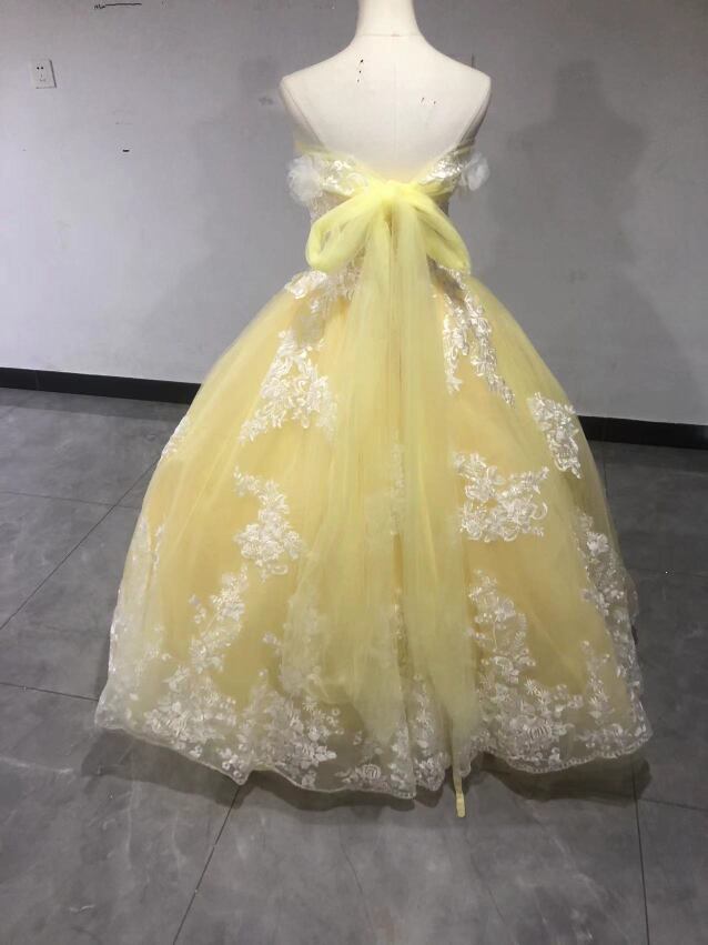 実例写真! イエロー ベアトップ3D立体レース刺繍 カラードレス ソフトチュール前撮り/結婚式花嫁/ウェディングドレス/ブライズメイド/お呼ばれ//合コン/デート/謝恩会 | David1021k Dress(ダヴィドレス)