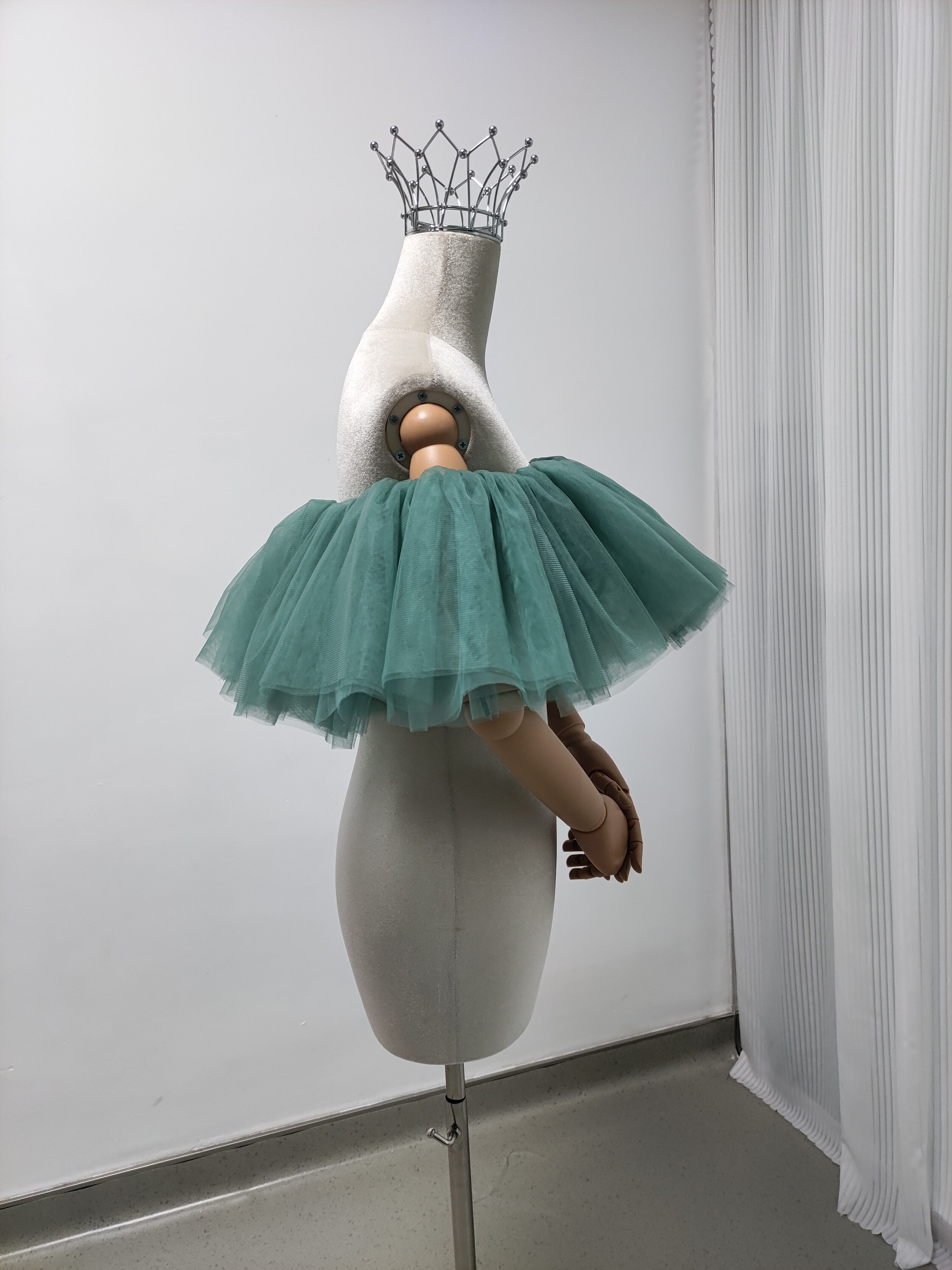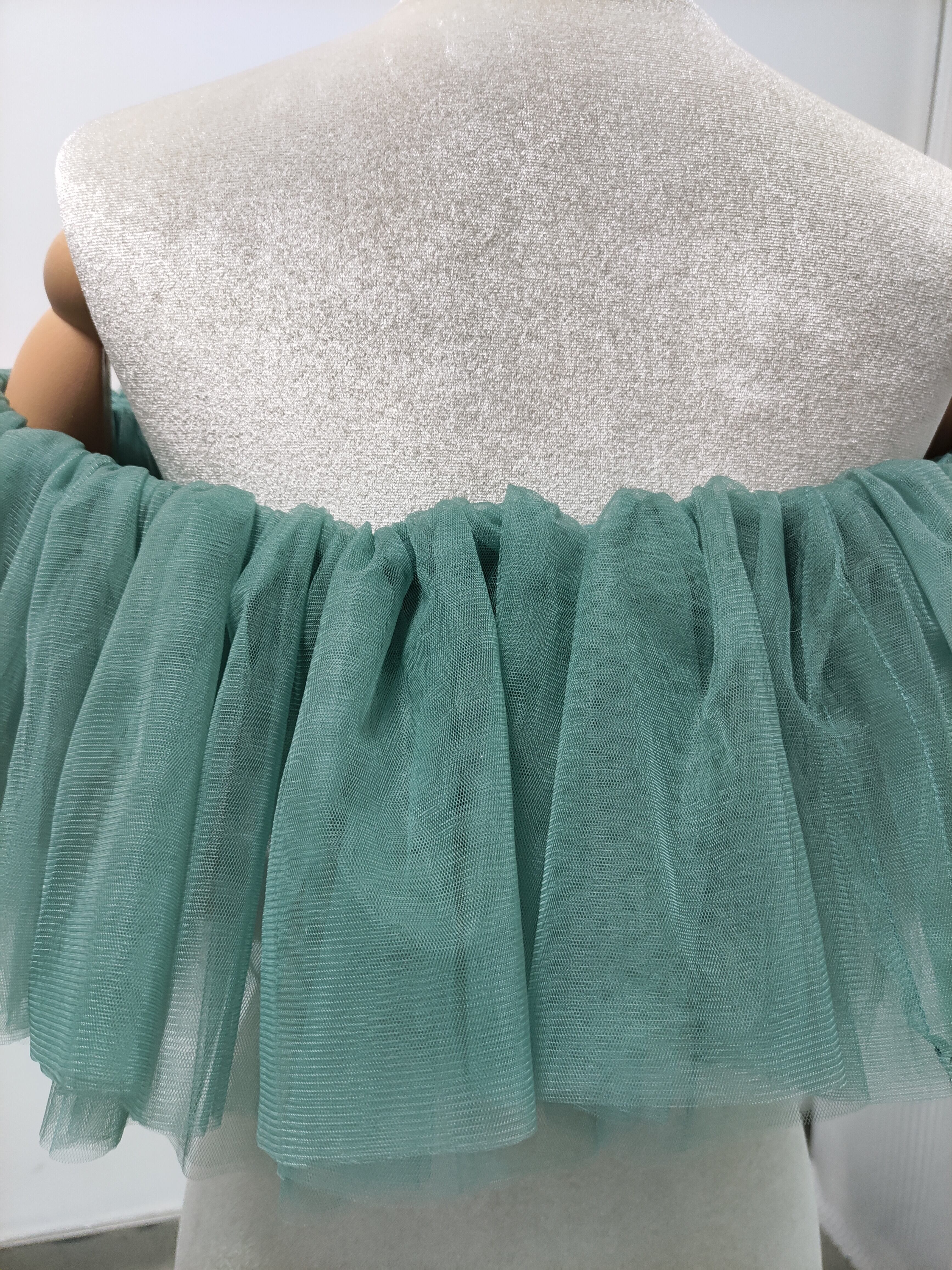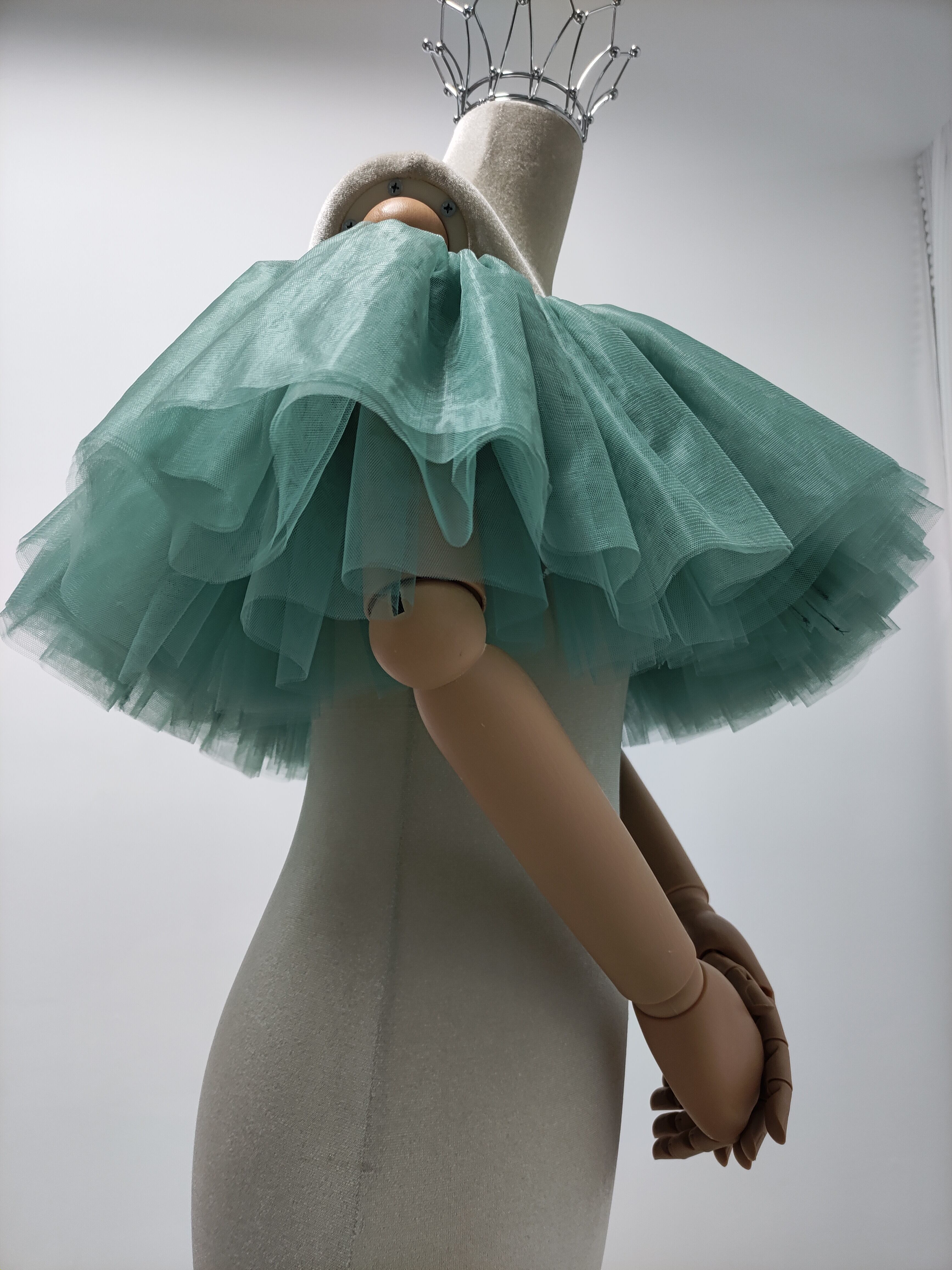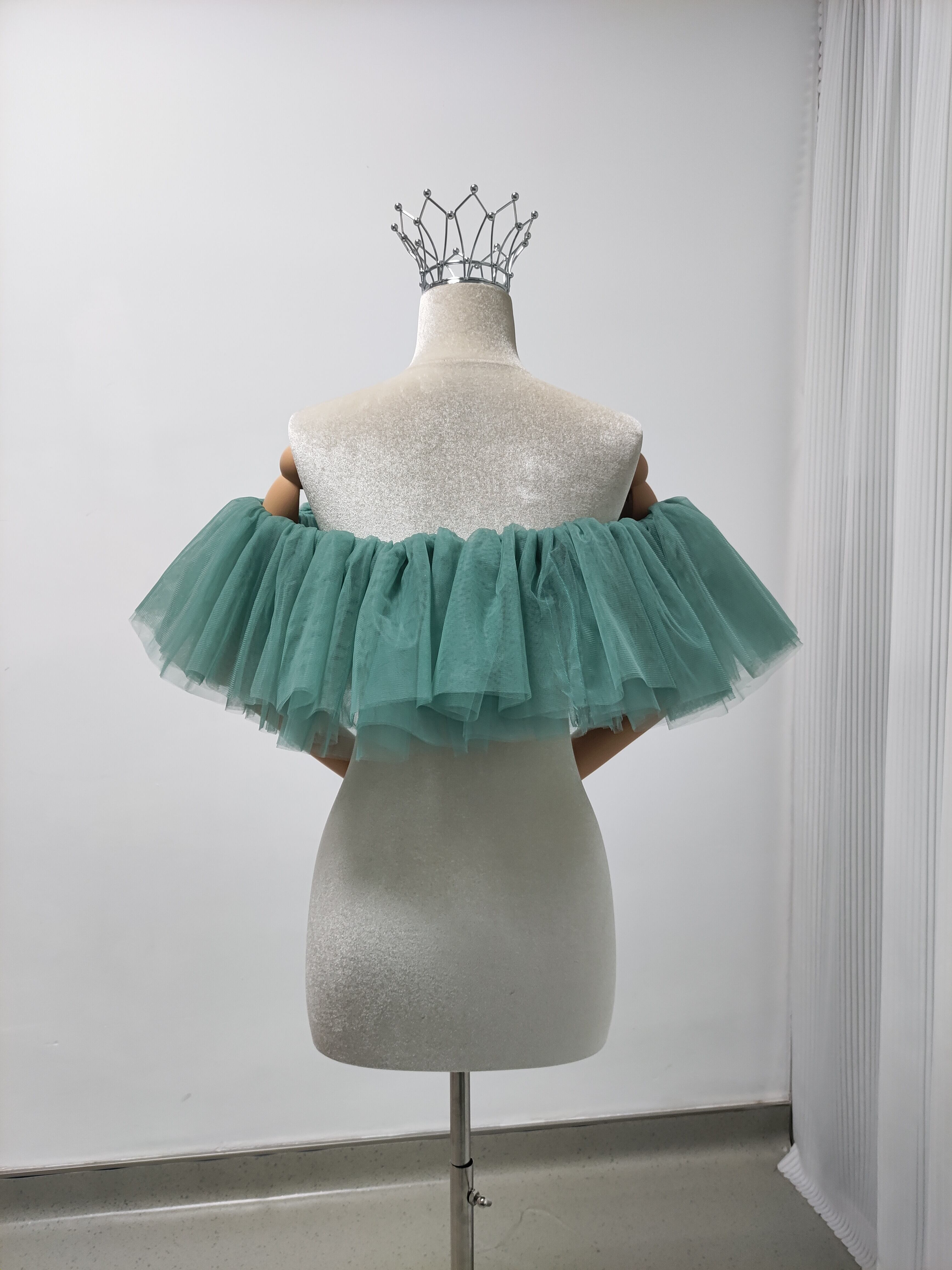 送料無料!グリーン エレガント ポンチョ ソフトチュール ラッフルフリル  ふわふわ取り外しオフショルダー