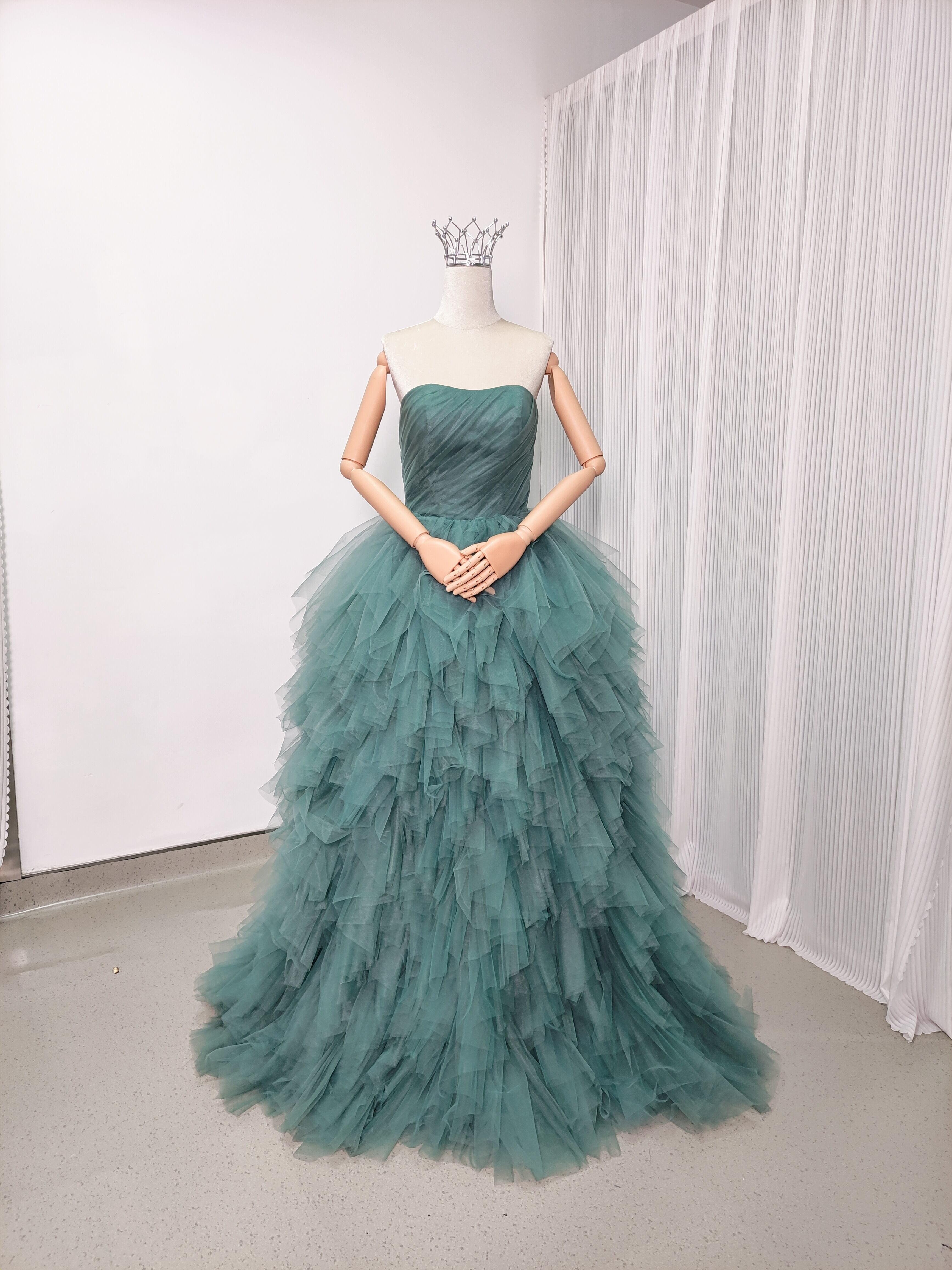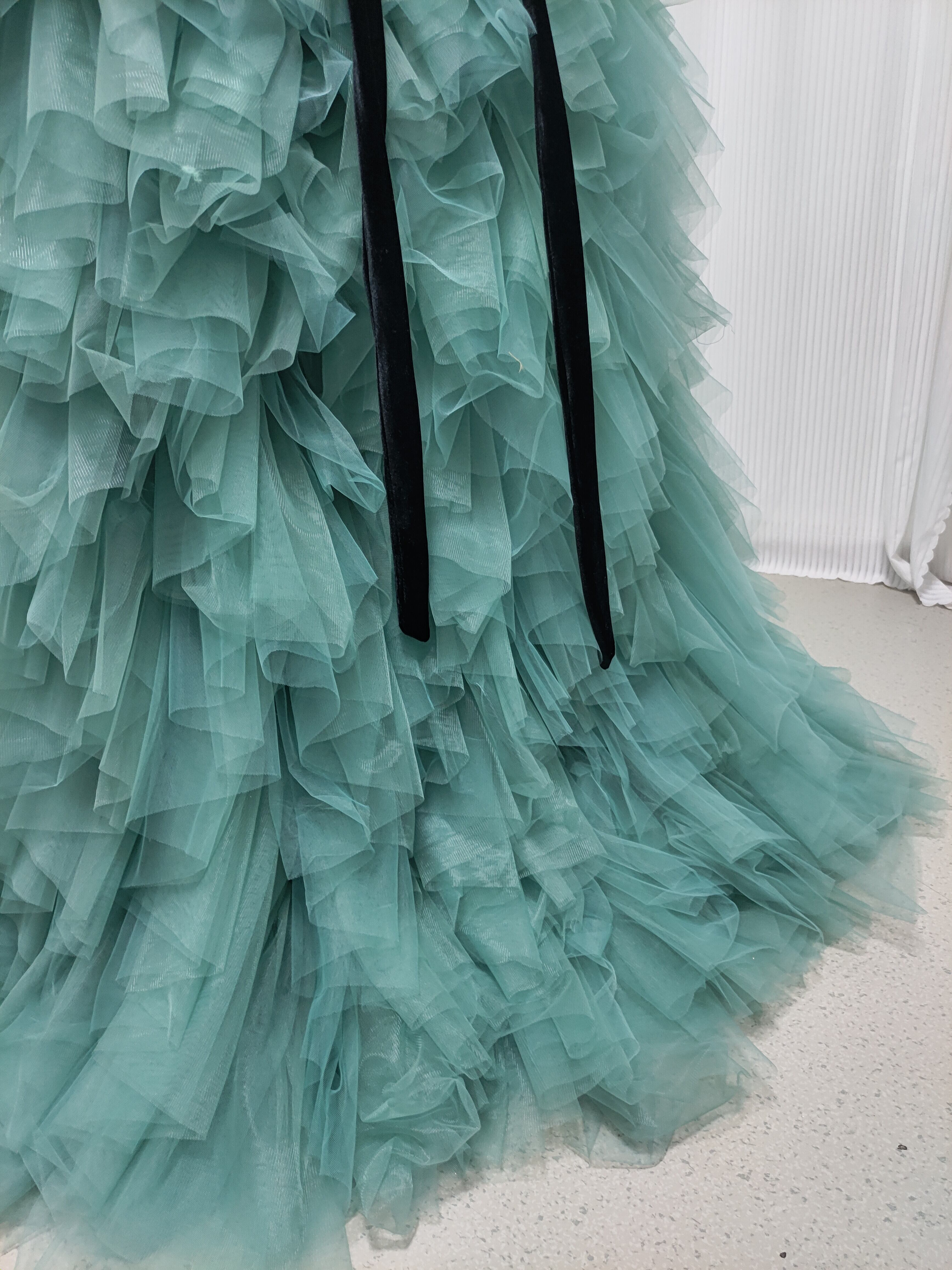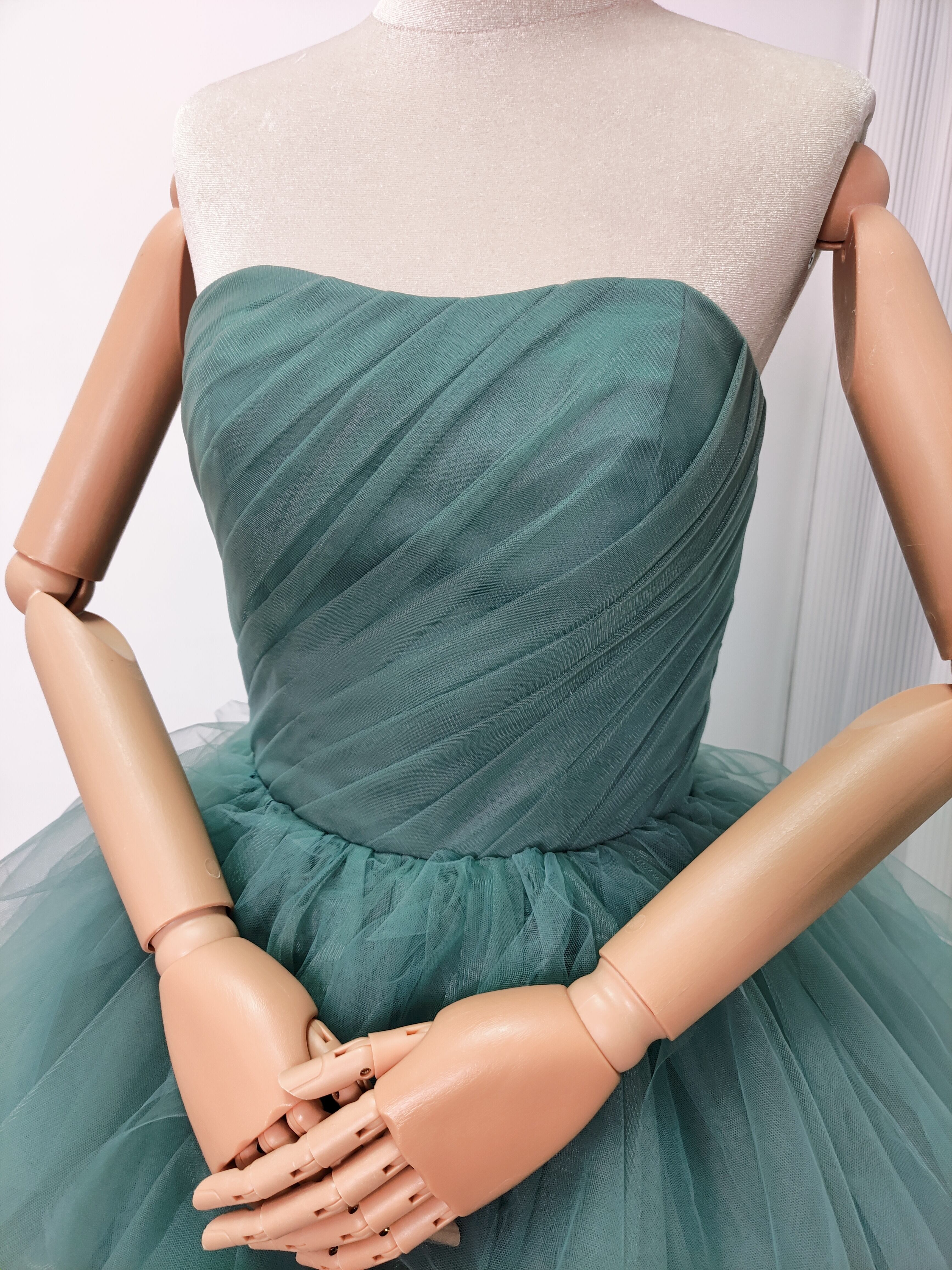 グリーン オフショルダー カラードレス ソフトチュール 重ねたチュールスカート華やかなトレボリュームドレス/前撮り/結婚