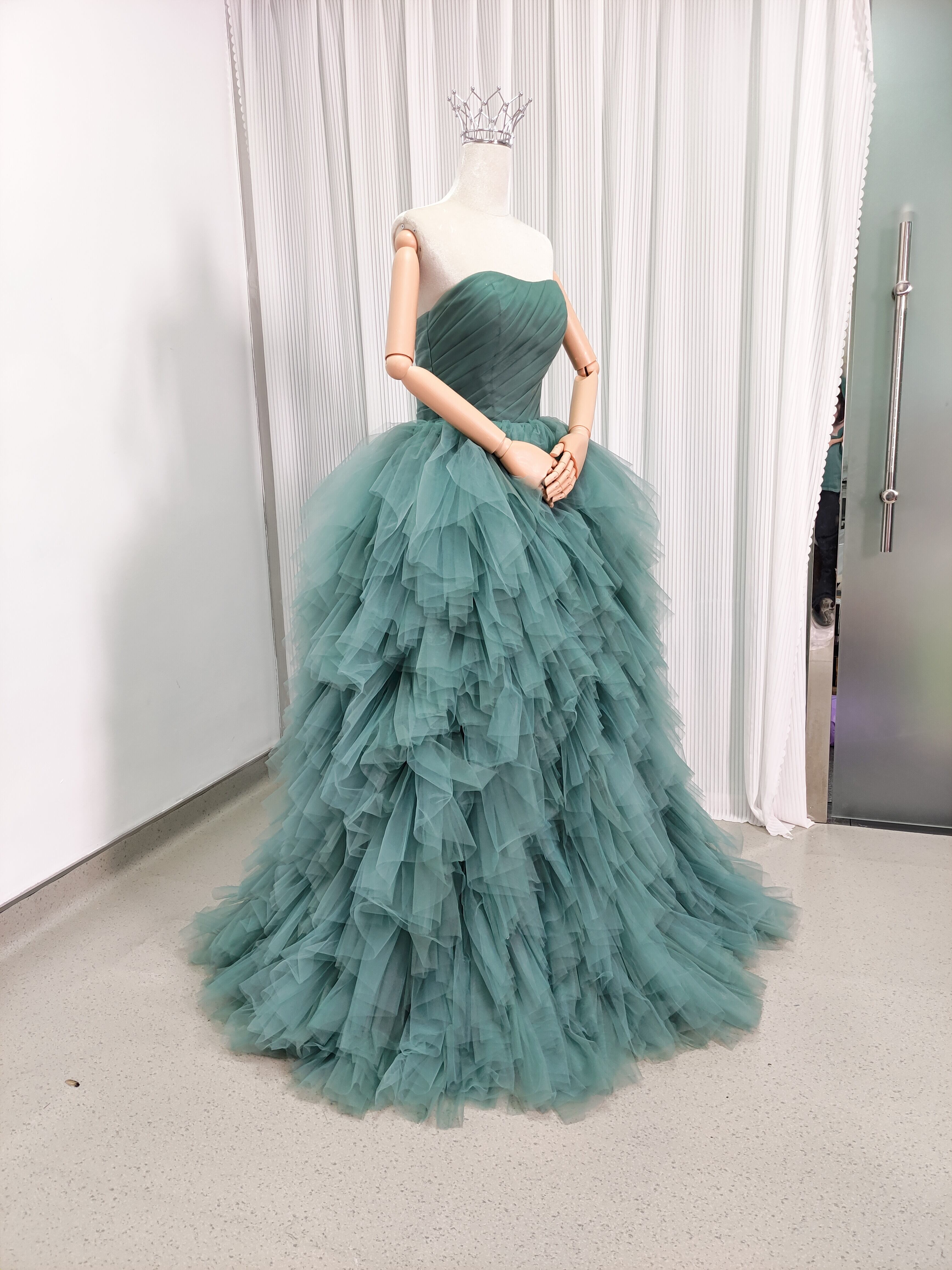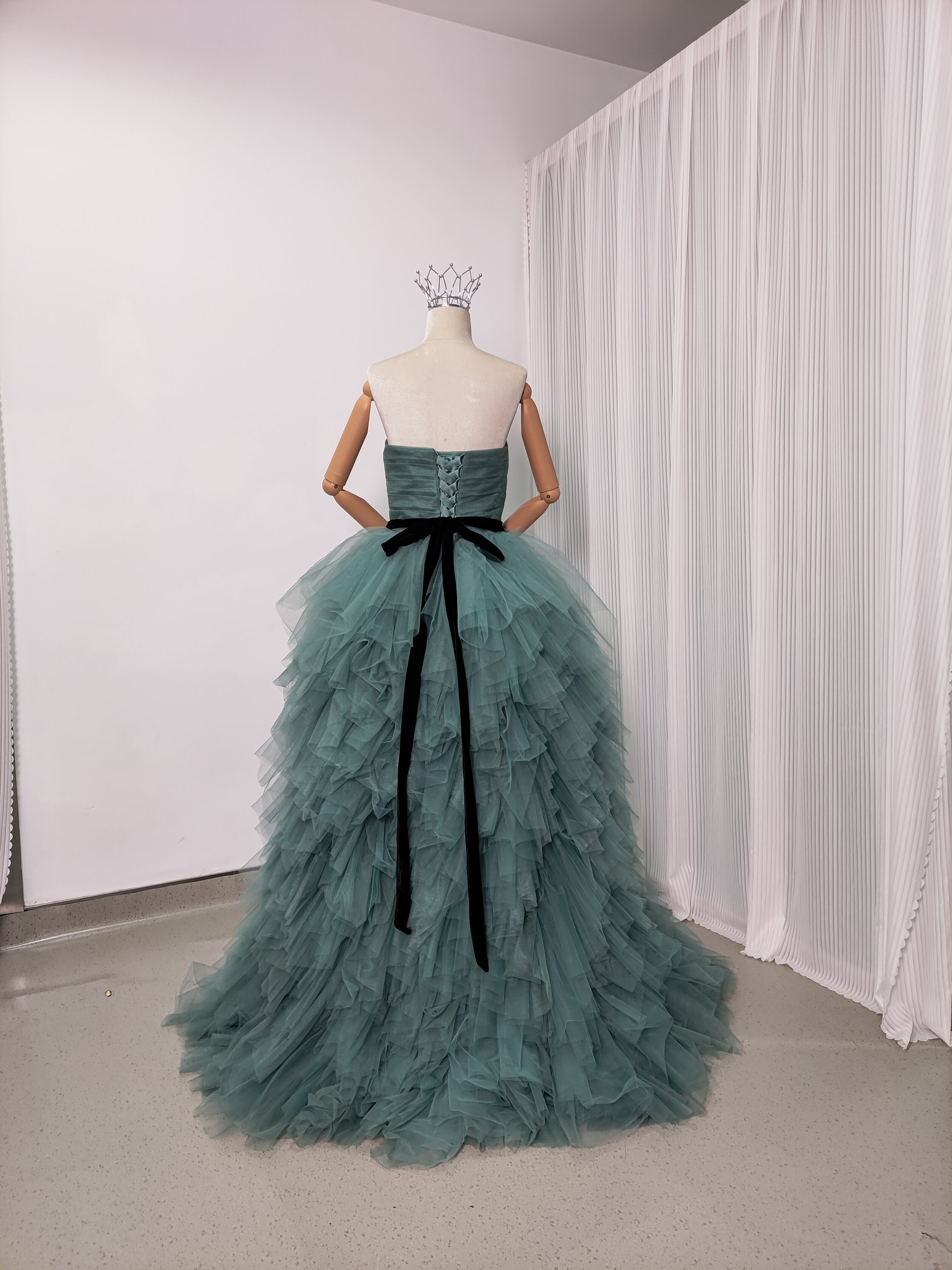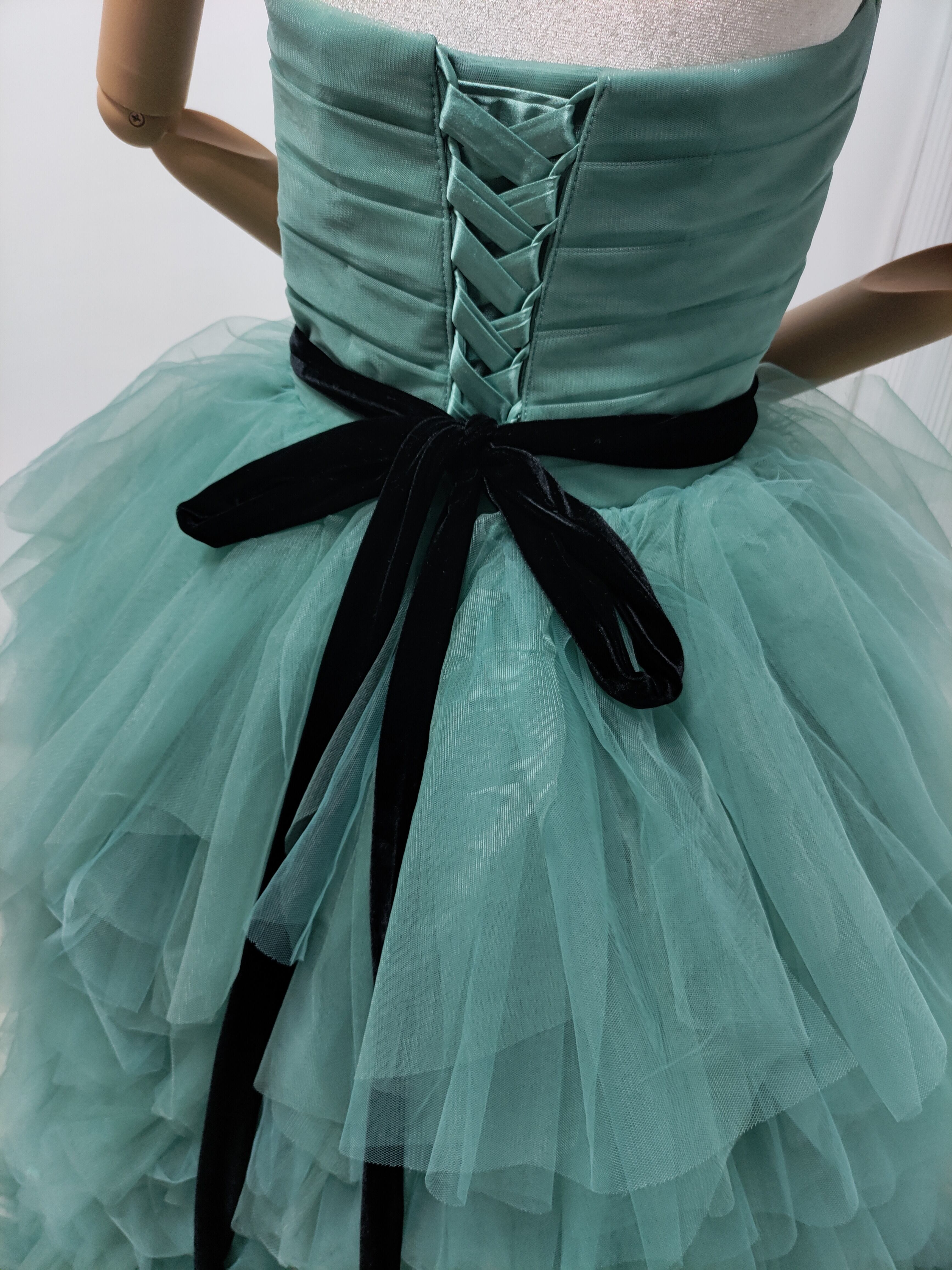 グリーン オフショルダー カラードレス ソフトチュール 重ねたチュールスカート華やかなトレボリュームドレス/前撮り/結婚