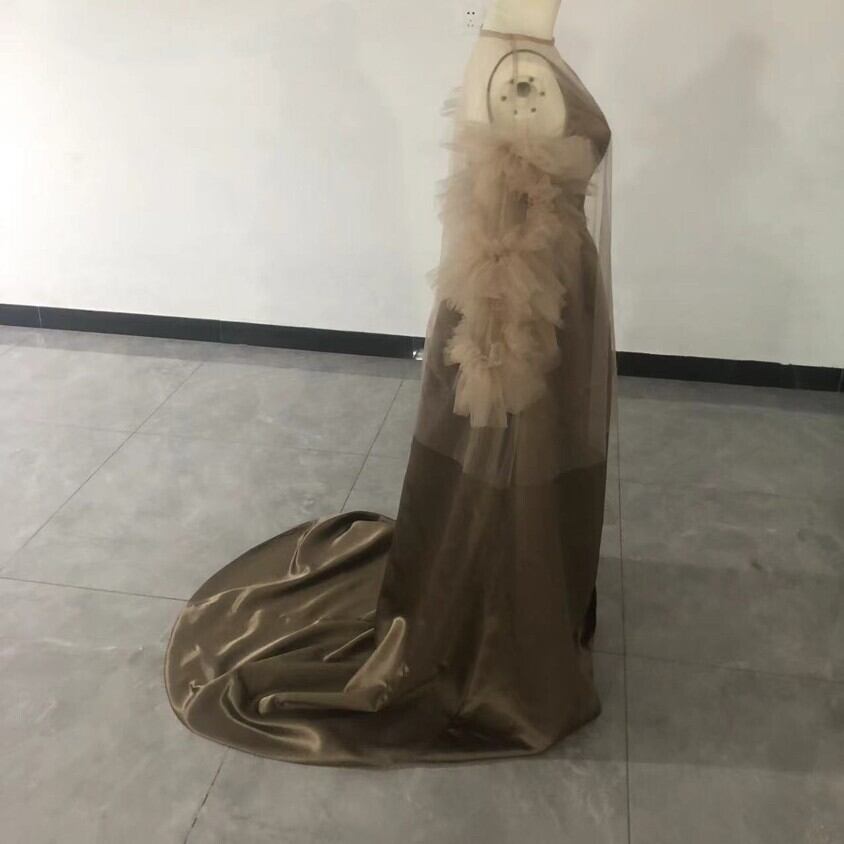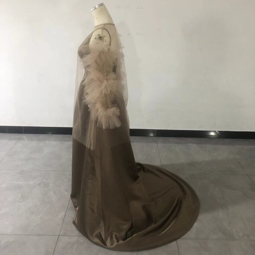 抜群のおしゃれ見えパーティードレス ブラウン トレーン シアーな美しさ ポンチョ + ソフトチュール ポンチョ演奏会