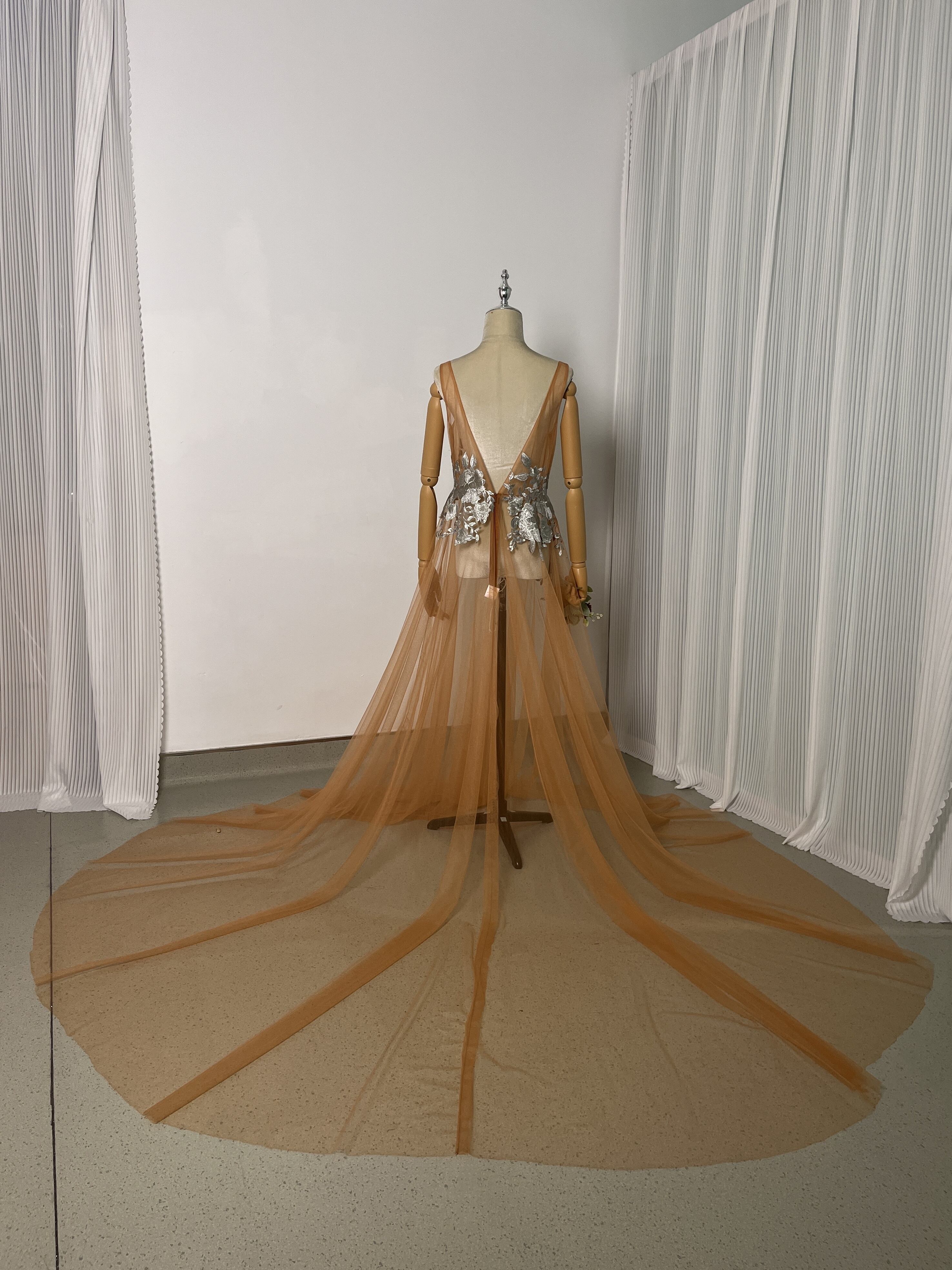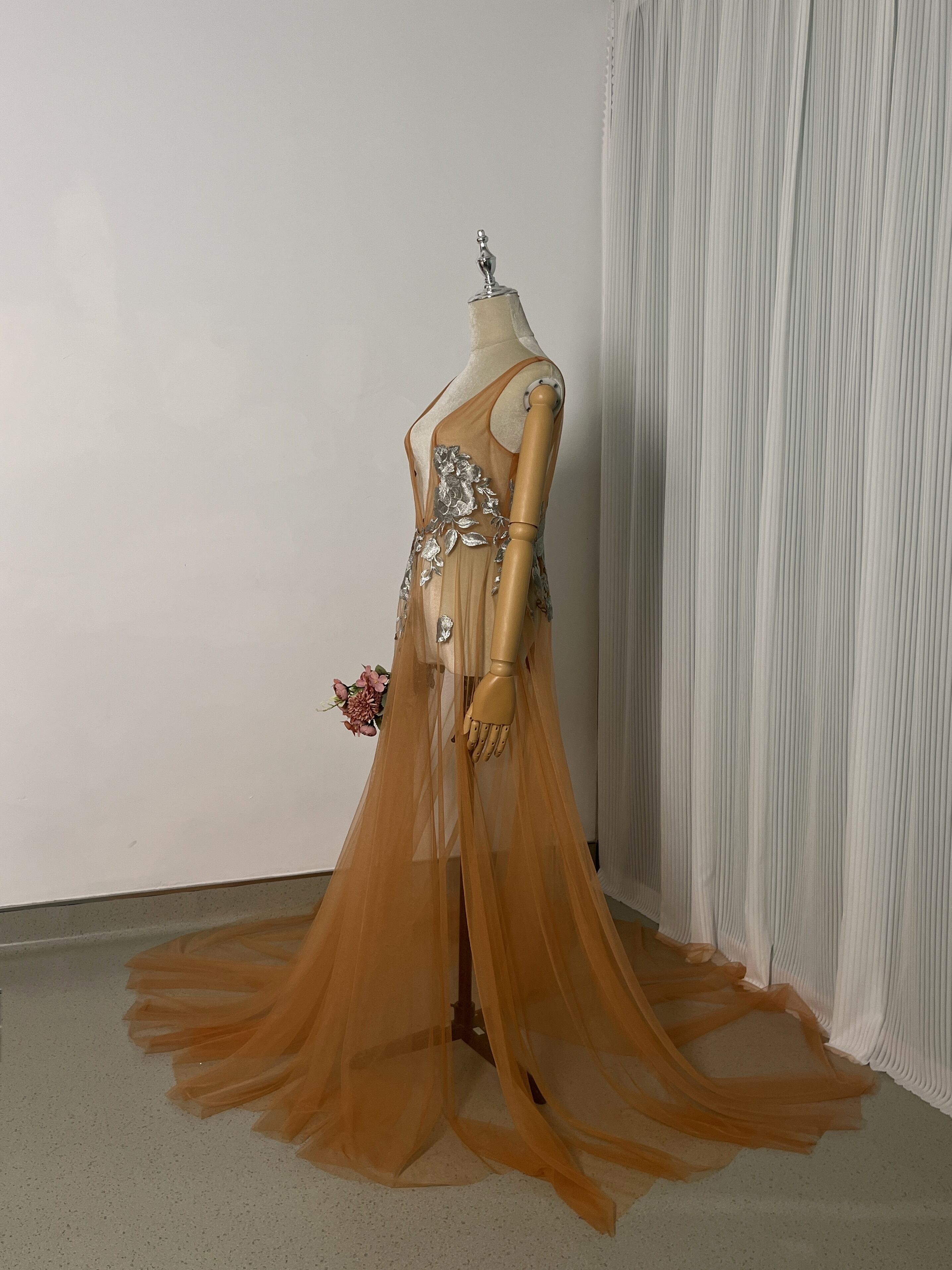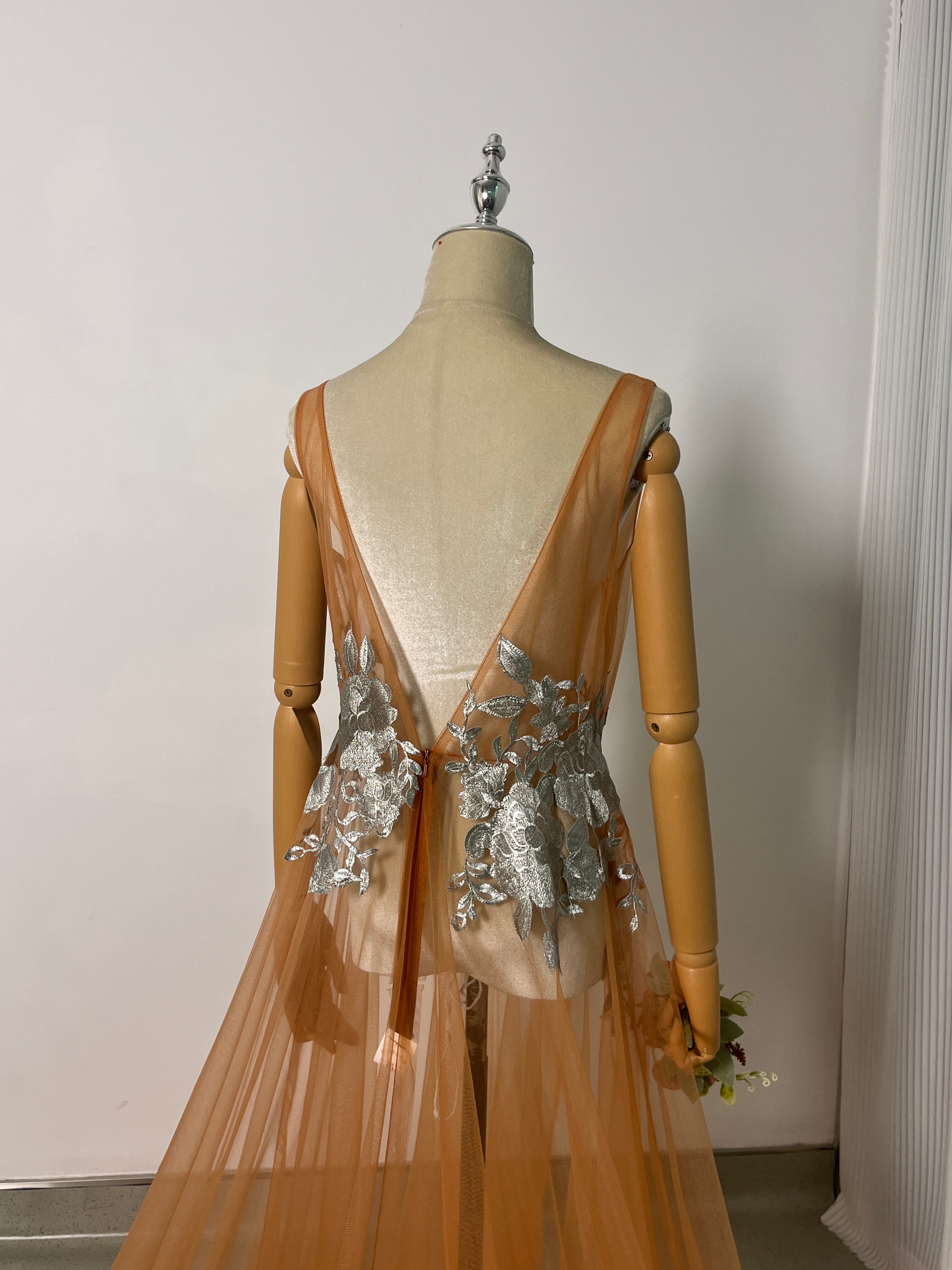 人気上昇!3D立体レース刺繍 オレンジ カラードレス ソフトチュール オーバースカート華やかなトレーン 前撮り/結婚式花嫁/ウェディングドレス/ブライズメイド/お呼ばれ//合コン/デート/謝恩会 | David1021k Dress(ダヴィドレス)