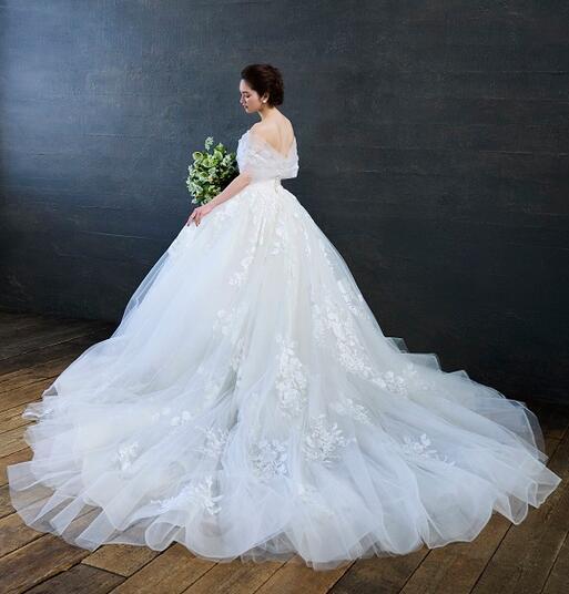 高品質!送料無料!ウエディングドレス オフショルダー 上品レース 花柄のモチーフ刺繍が美しく かわいい エレガント 優雅 ハンドメイド トレーン オーダードレス プリンセスライン ガーデンウェディング 花嫁 豪華 結婚式/前撮り/二次会/2次会/披露宴/演奏会/音楽会 | David1021k Dress(ダヴィドレス)