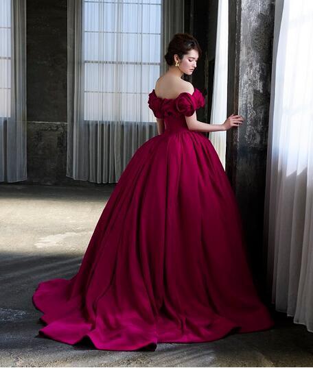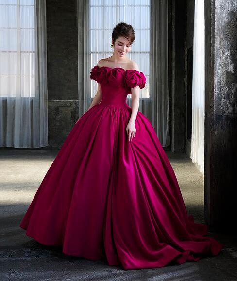 高品質!送料無料!カラードレス ベアトップ ローズレッド バラ色 薔薇色 オフショルダー 立体的な花 2WAY かわいい 高級サテン トレーン オーダードレス ウエディングドレス 二次会/2次会/披露宴/演奏会/音楽会
