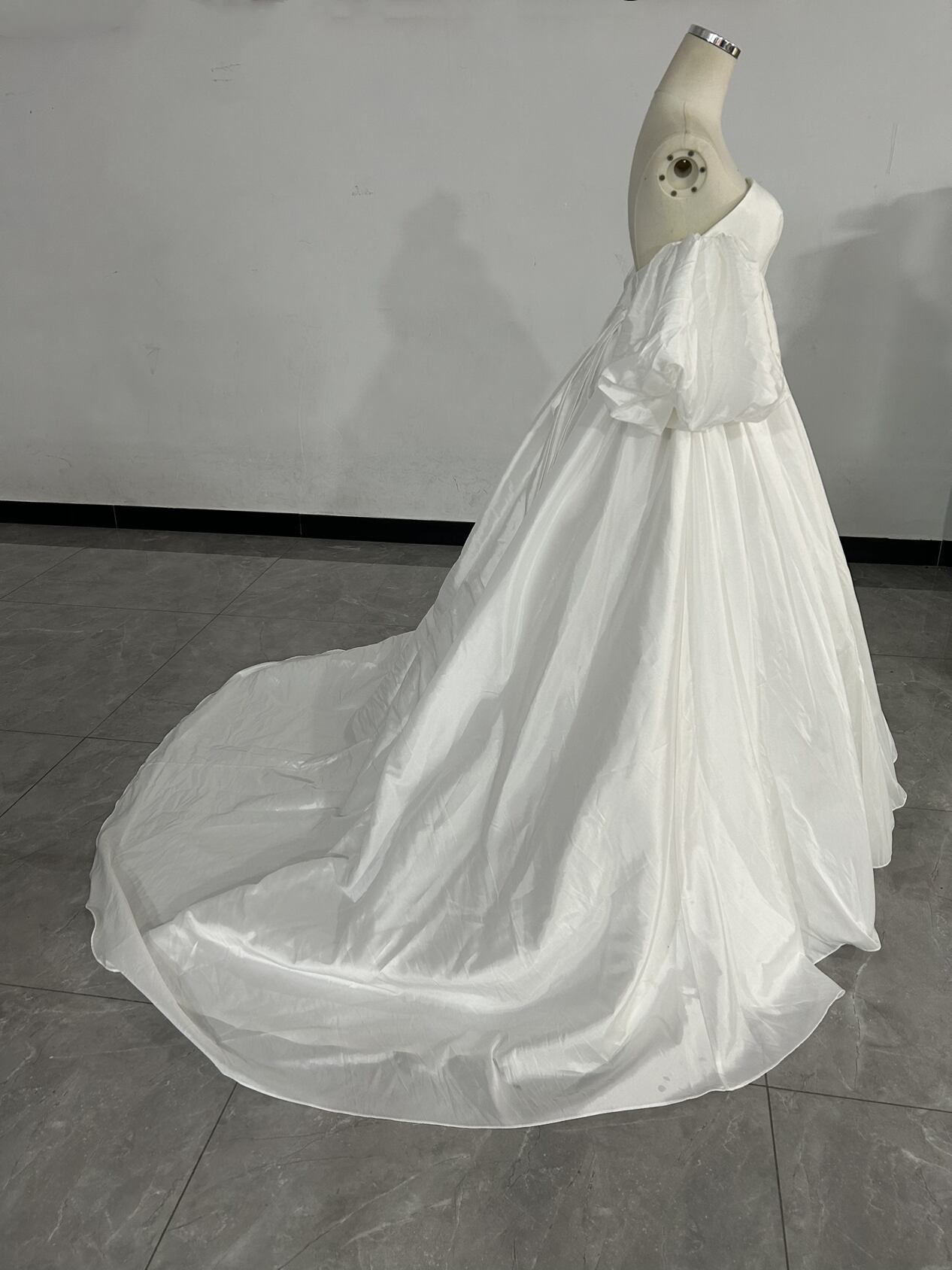 実例写真!高品質!ウエディングドレス ベアトップ パフスリーブ シルクタフタ 花嫁 華やかなトレーン 高級サテン 結婚式/前撮り/音楽会