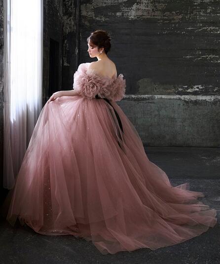 高品質!カラードレス くすみピンク オフショルダー キラキララメ生地 エレガント オーダードレス ハンドメイド ソフトチュール 花嫁 演奏会/音楽会 パーティードレス | David1021k Dress(ダヴィドレス)