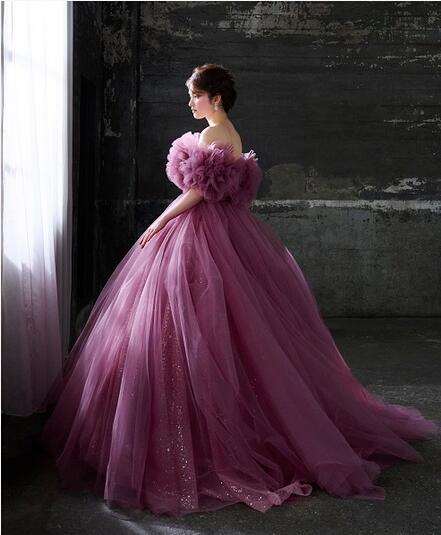 高品質!送料無料!カラードレス モーブ色 殷紅 パープル/紫 オフショルダー ラメ生地 キラキラ かわいい エレガント 優雅 オーダードレス ハンドメイド ソフトチュール 花嫁 トレーン 結婚式/前撮り/二次会/2次会/披露宴/演奏会/音楽会 合コン パーティードレス | David1021k Dress(ダヴィドレス)