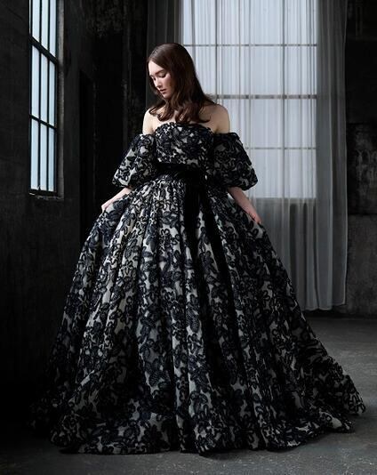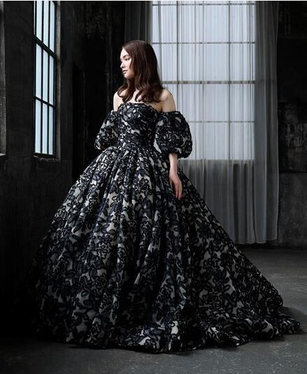 高品質!送料無料!カラードレス 黒/ブラック パフスリーブ かわいい エレガント 優雅 オーダードレス ハンドメイド ソフトチュール 花柄のモチーフ刺繍が美しく 花嫁 トレーン 結婚式/前撮り/二次会/2次会/披露宴/演奏会/音楽会 合コン パーティードレス | David1021k Dress(ダヴィドレス)