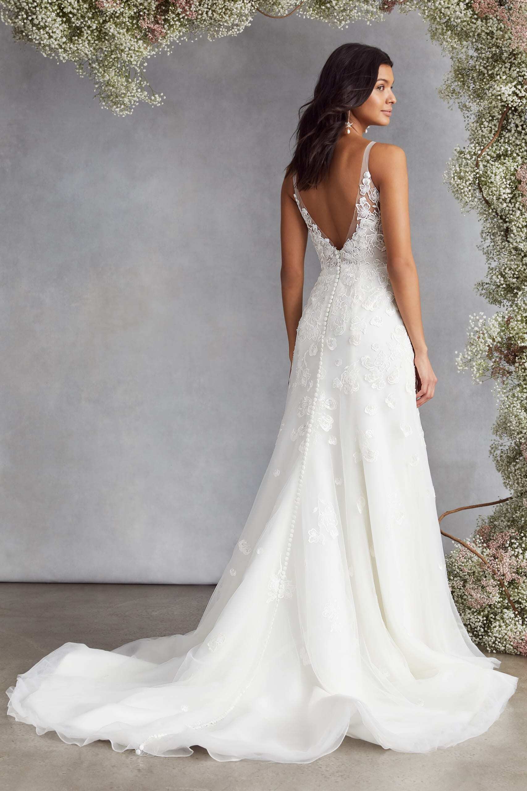 高品質!送料無料!ウエディングドレス キャミソール 上品レース 高みせ マーメイドライン ソフトチュール 咲き誇る透け花レース かわいい エレガント 優雅 ハンドメイド トレーン オーダードレス ガーデンウェディング Vネック 背中見せ/バックレス 花嫁 豪華 結婚式/前撮り/二次会/2次会/披露宴/演奏会/音楽会 | David1021k Dress(ダヴィドレス)