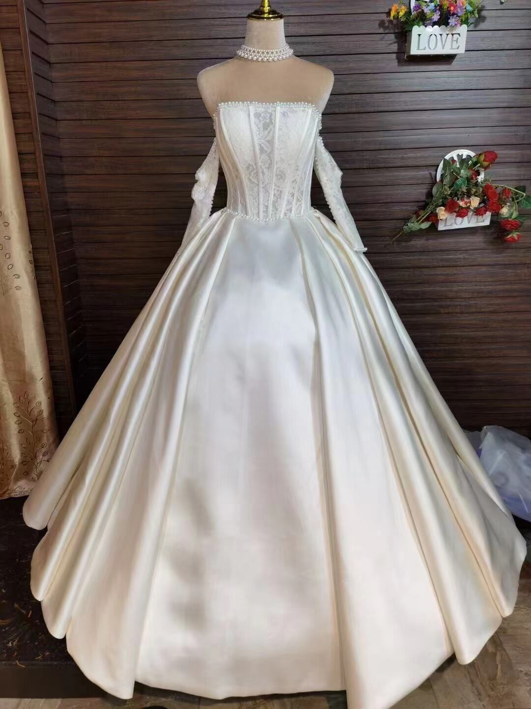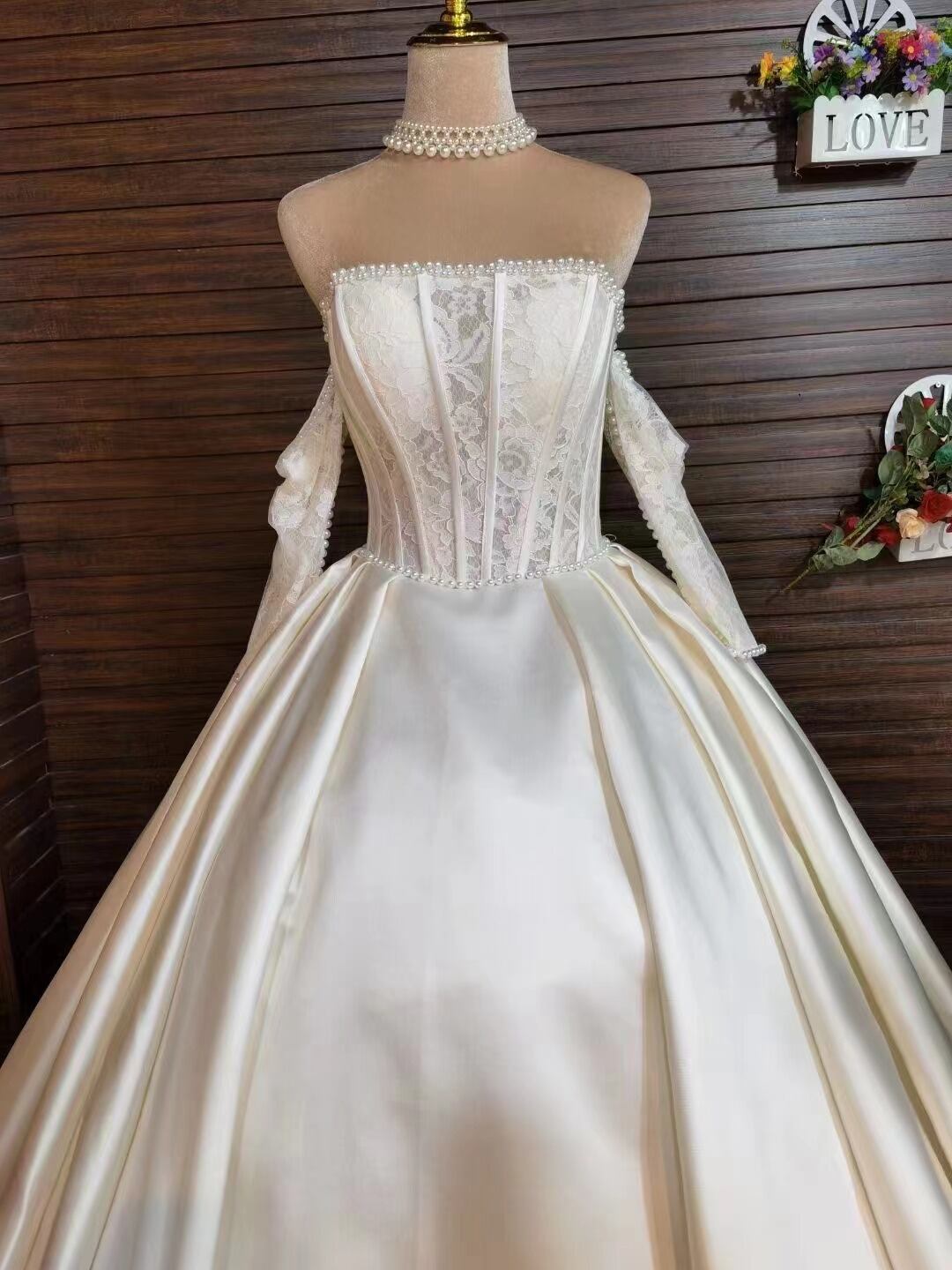 送料無料!高品質ベアトップ パール 3D立体レース刺繍 七分袖丈 ウエディングドレス 華やかなトレーン 高級サテン 結婚式/前撮り/音楽会