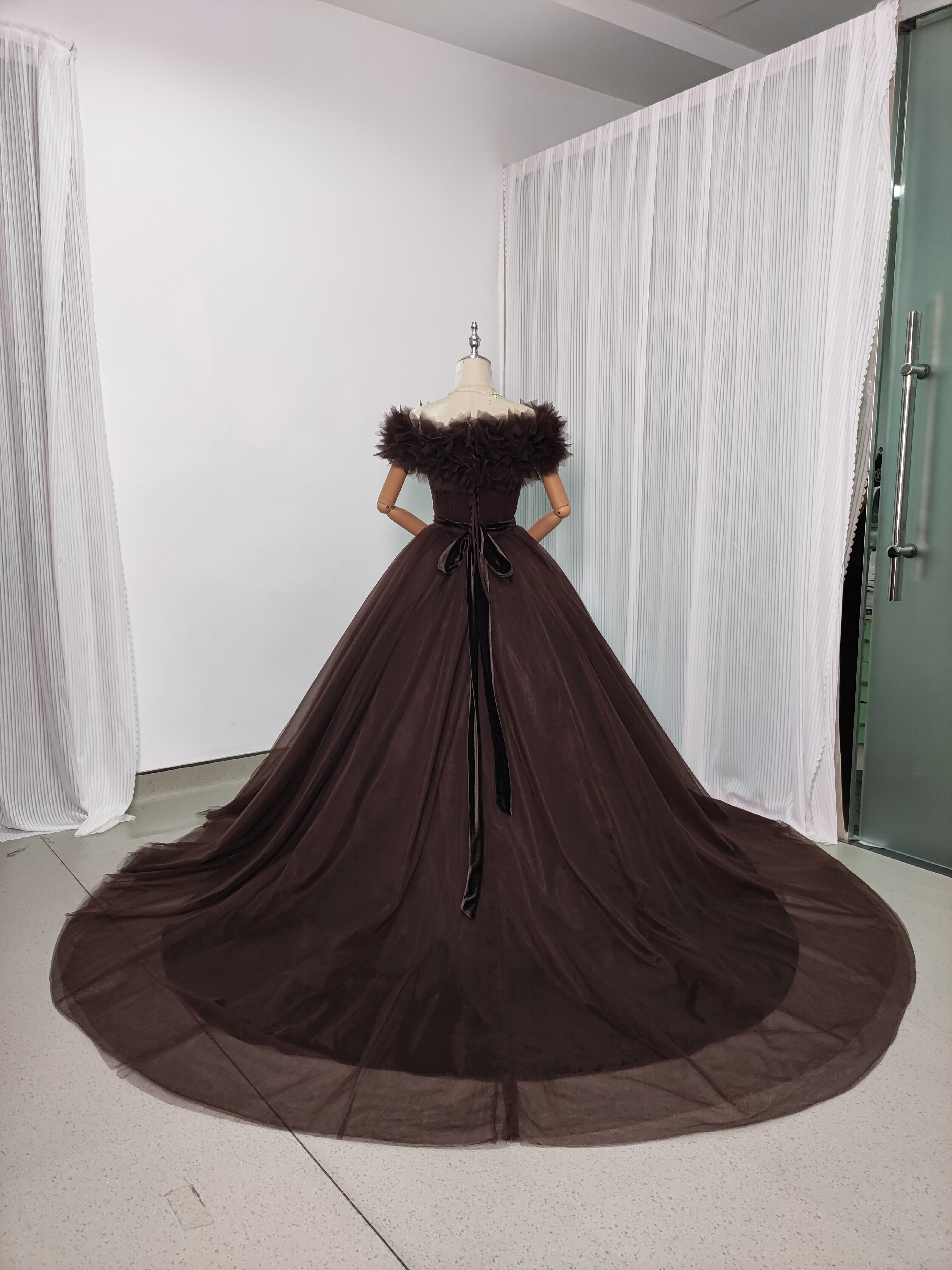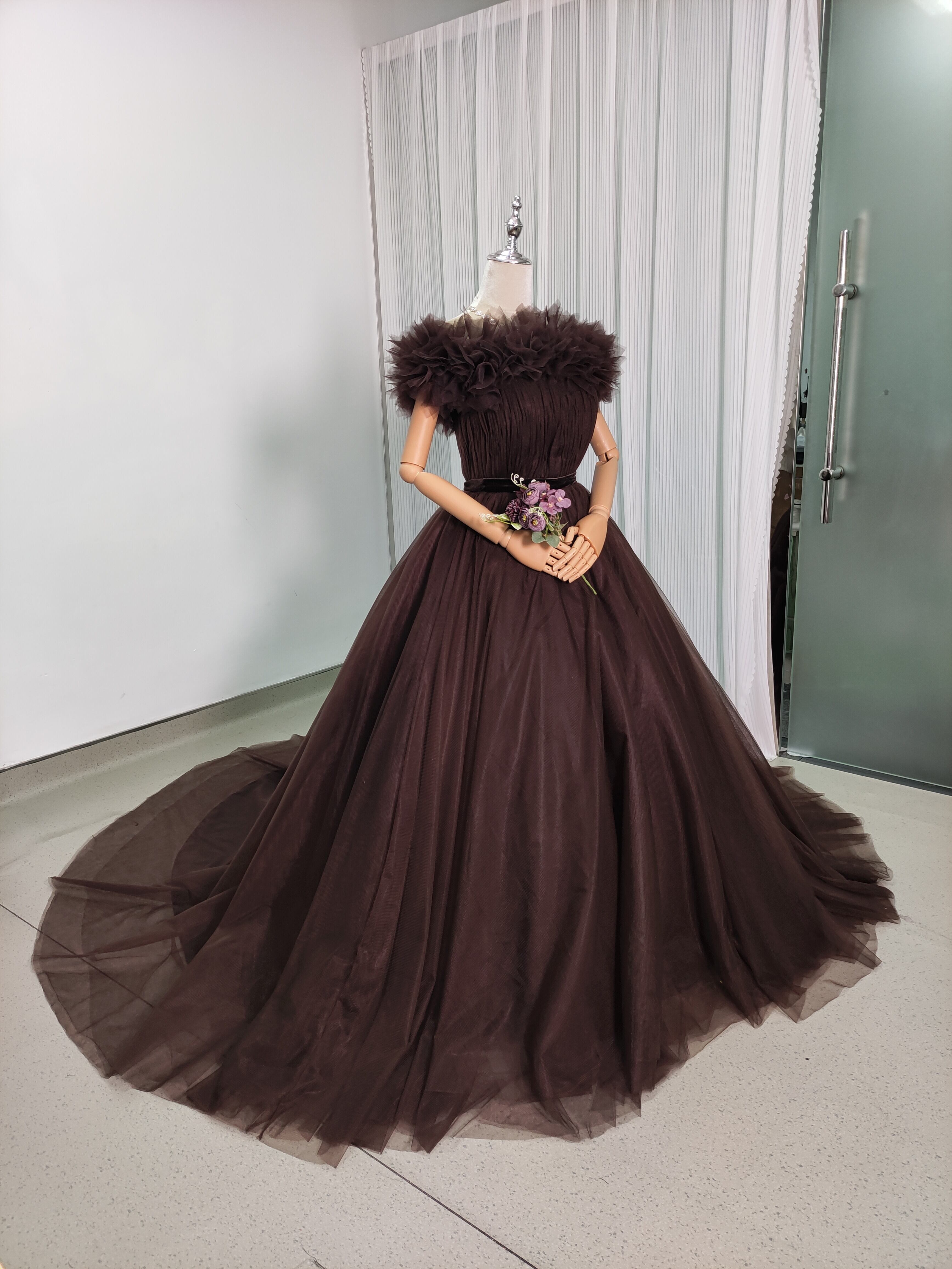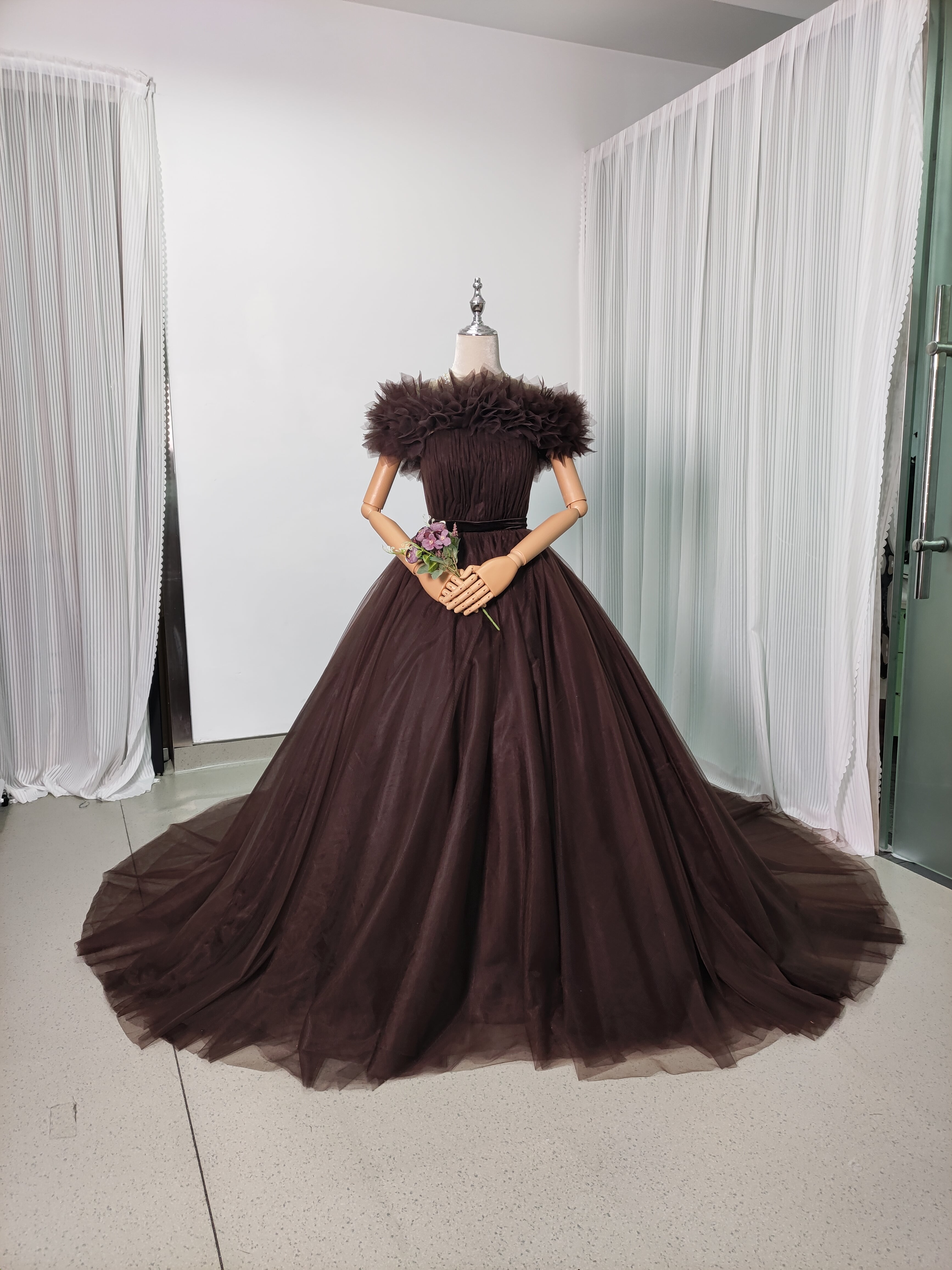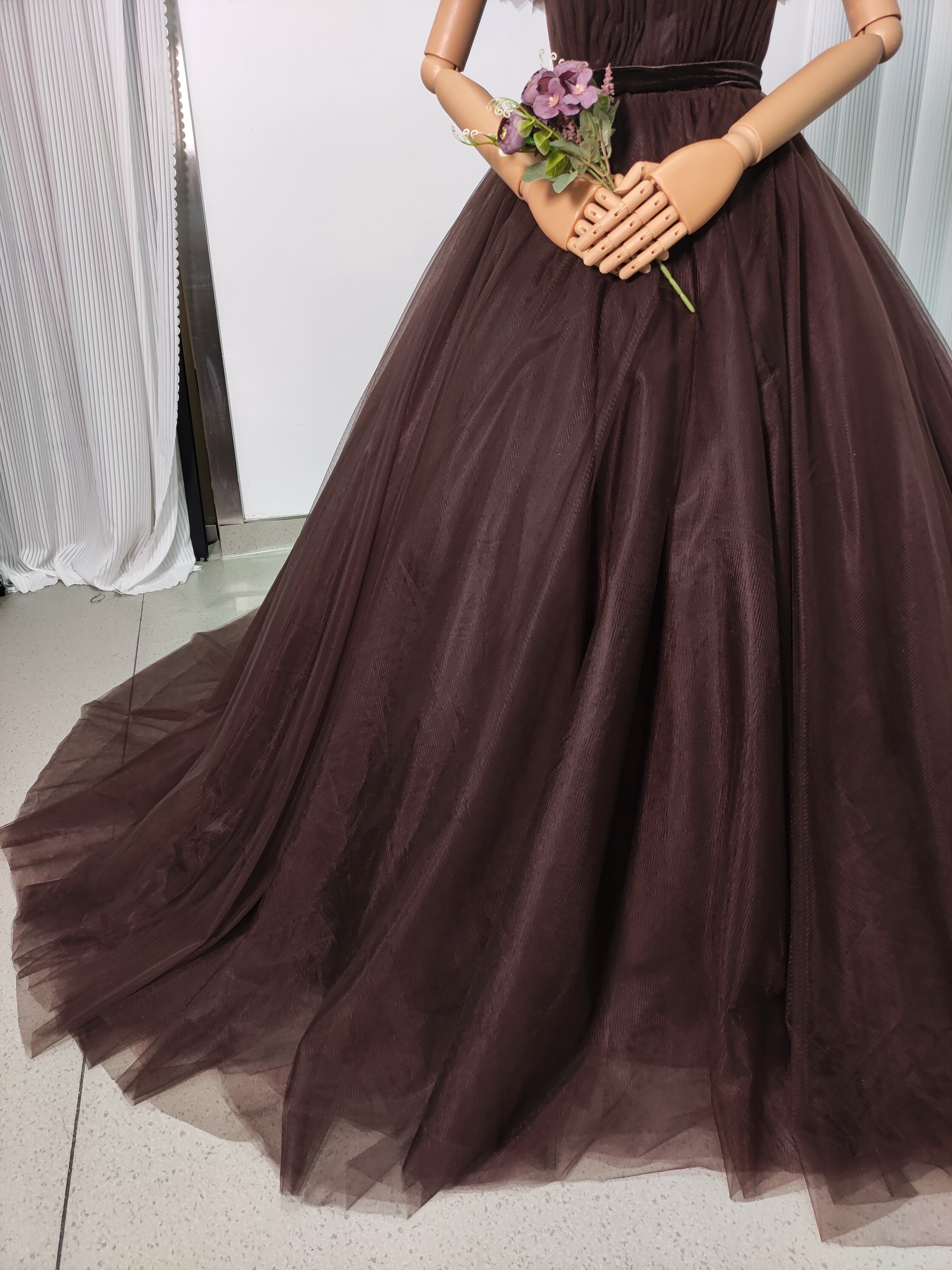 送料無料!高品質コーヒーの色 オフショルダー カラードレス 華やかなトレーン ソフトチュール 結婚式/前撮り/音楽会