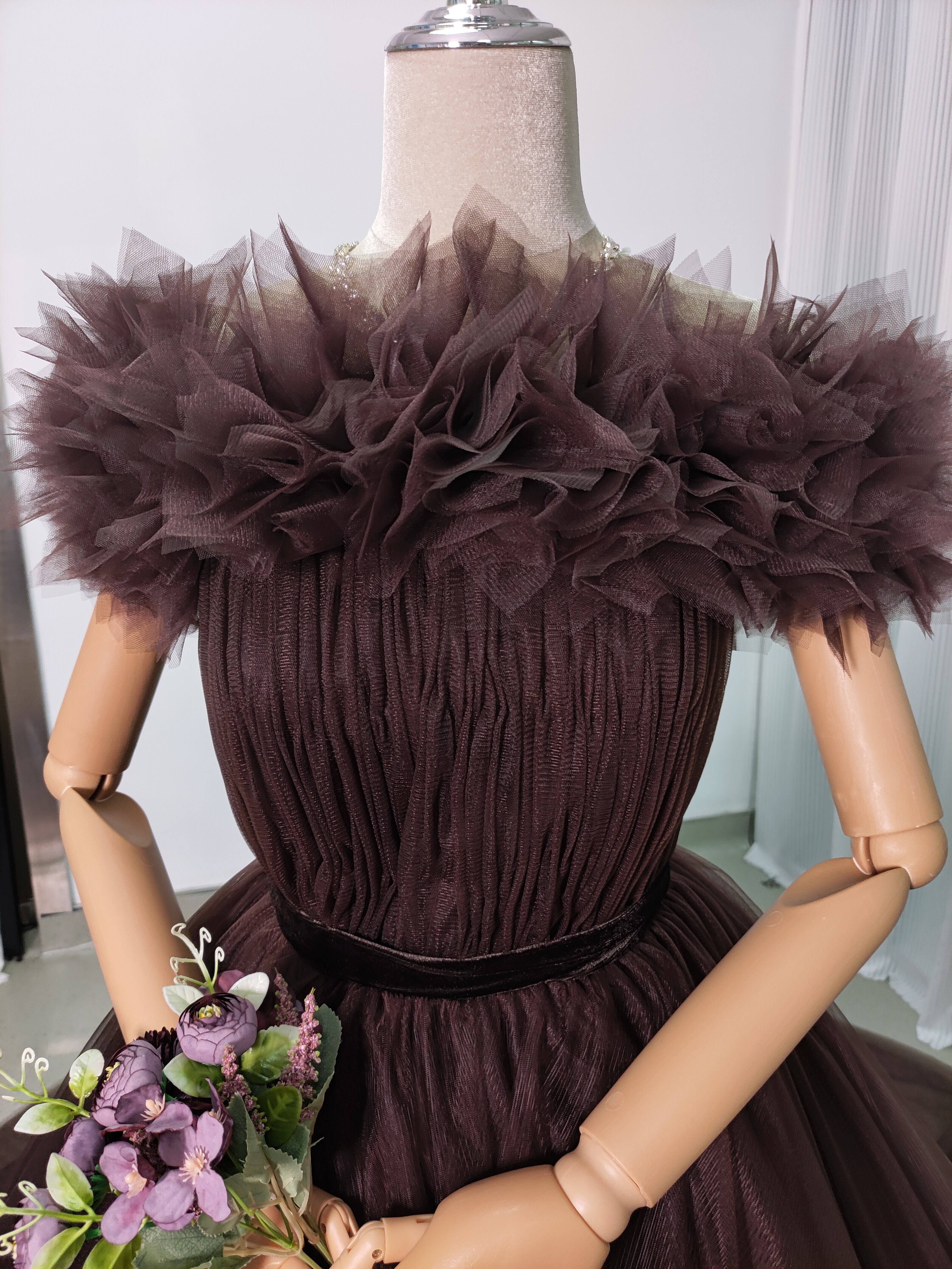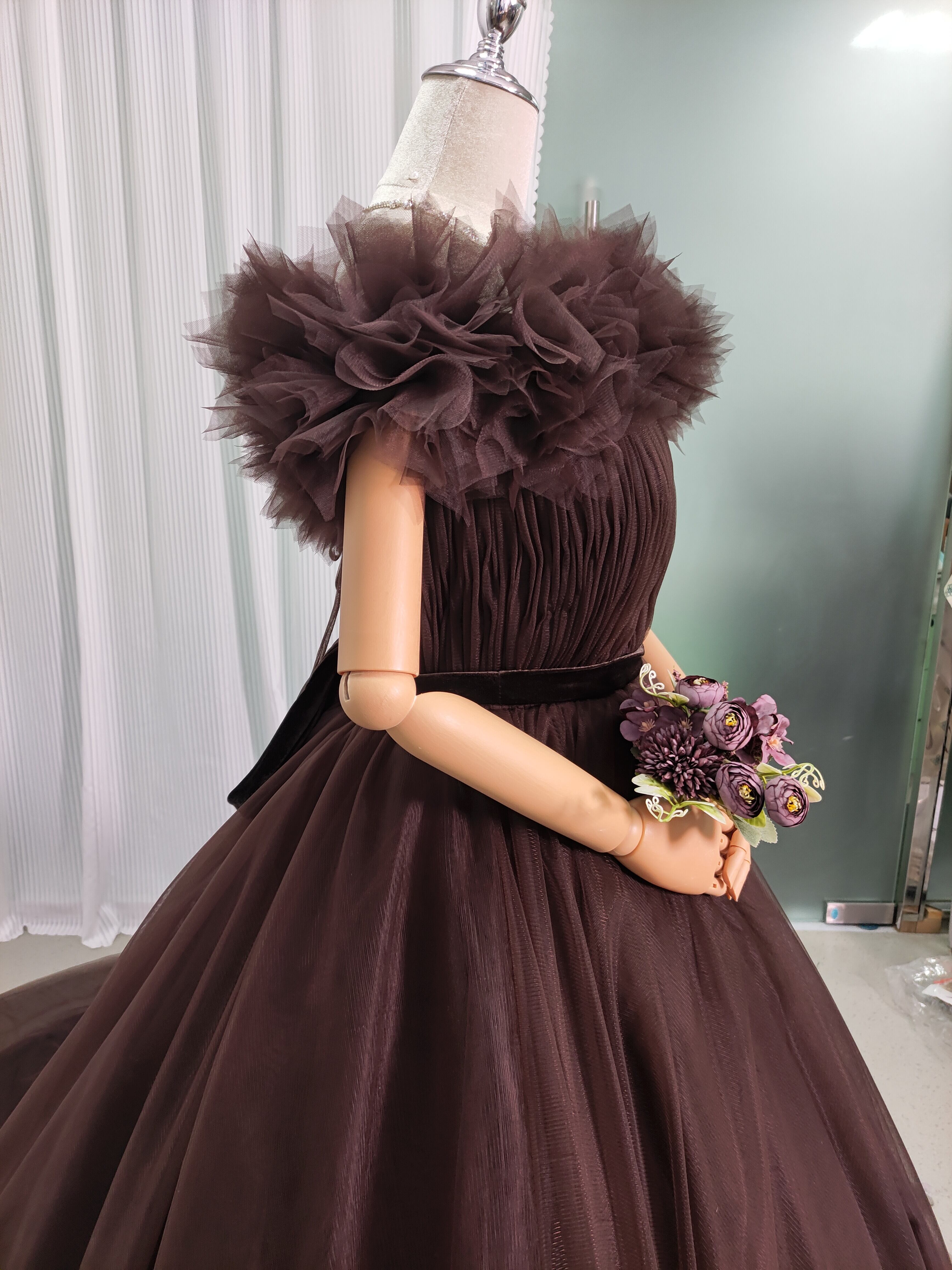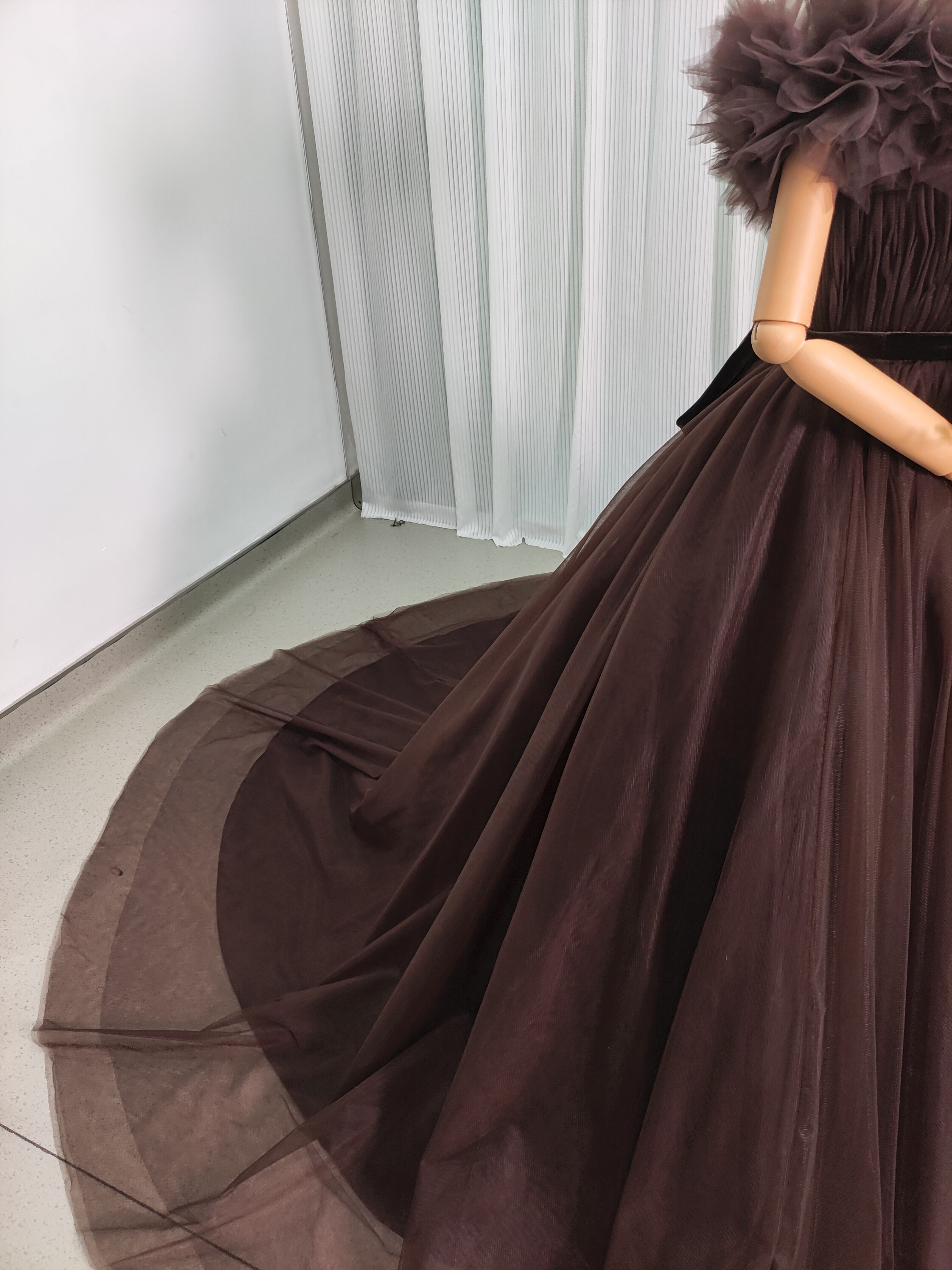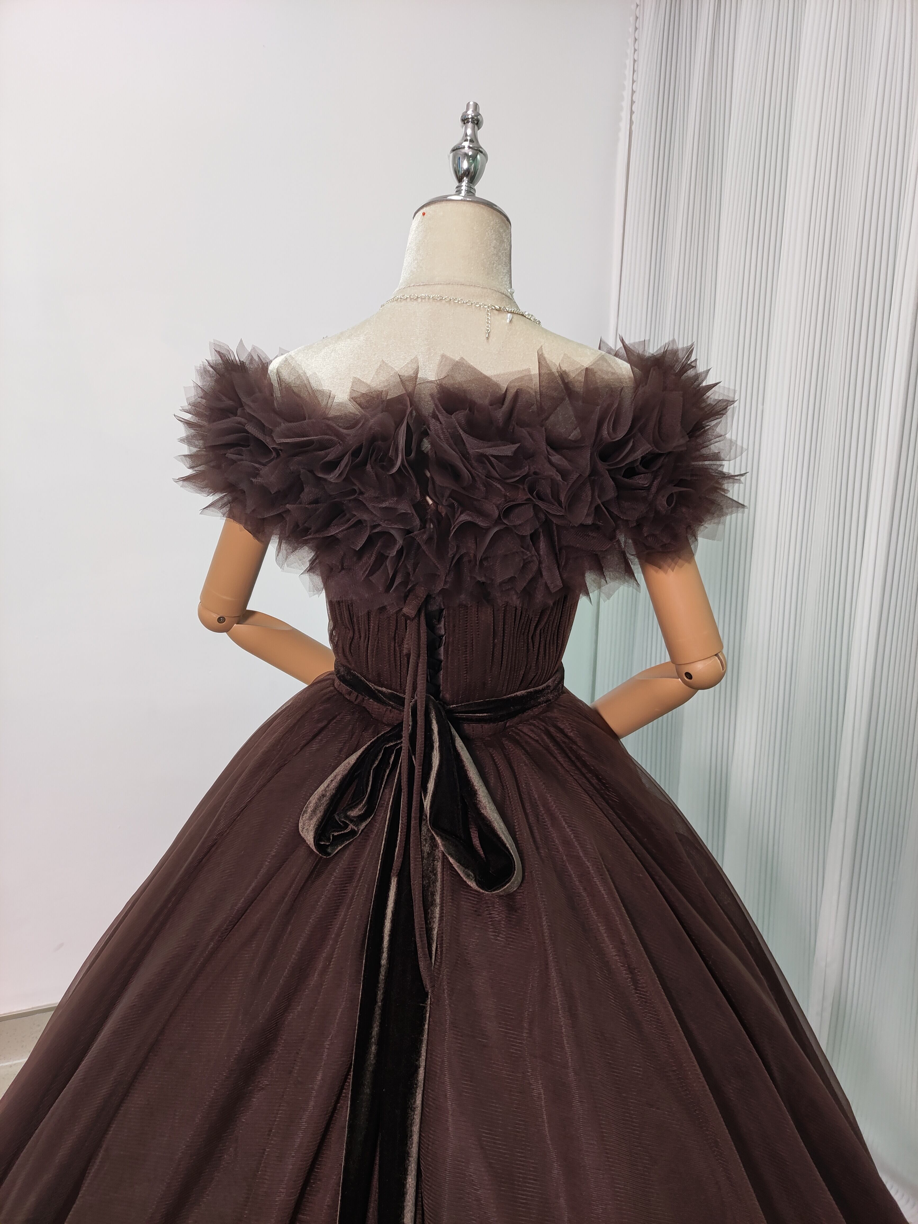 送料無料!高品質コーヒーの色 オフショルダー カラードレス 華やかなトレーン ソフトチュール 結婚式/前撮り/音楽会