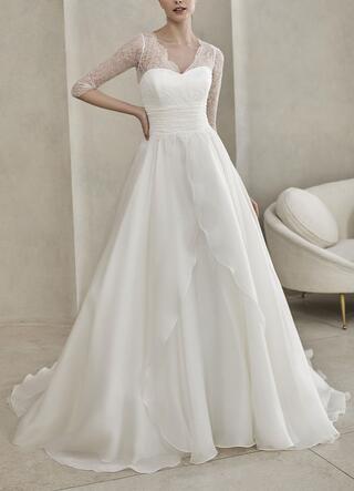 高品質!送料無料!ウエディングドレス 七分袖丈 上品レース 高みせ Aライン かわいい エレガント 優雅 ハンドメイド トレーン オーダードレス ガーデンウェディング Vネック 背中見せ/バックレス 花嫁 豪華 結婚式/前撮り/二次会/2次会/披露宴/演奏会/音楽会 | David1021k Dress(ダヴィドレス)