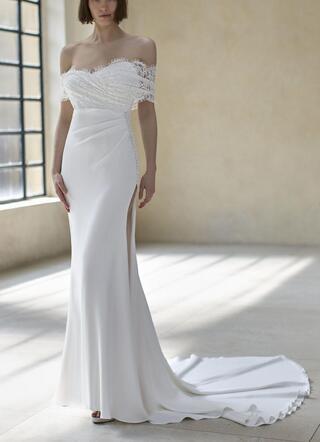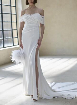 高品質!送料無料!ウエディングドレス オフショルダー ベアトップ 上品レース 高みせ マーメイドライン スリット セクシー かわいい エレガント 優雅 ハンドメイド トレーン オーダードレス ガーデンウェディング Vネック 背中見せ/バックレス 花嫁 豪華 結婚式/前撮り/二次会/2次会/披露宴/演奏会/音楽会 | David1021k Dress(ダヴィドレス)