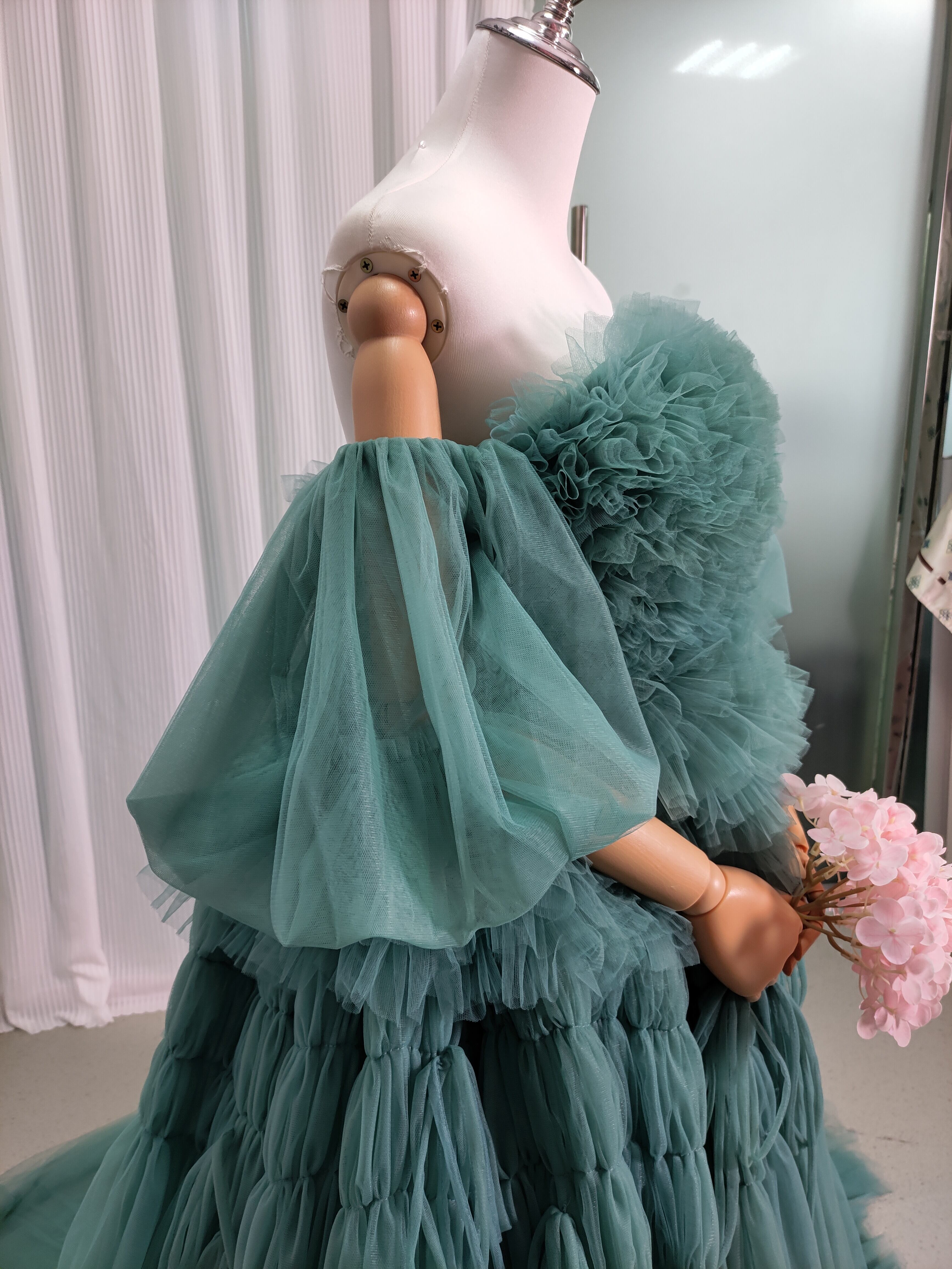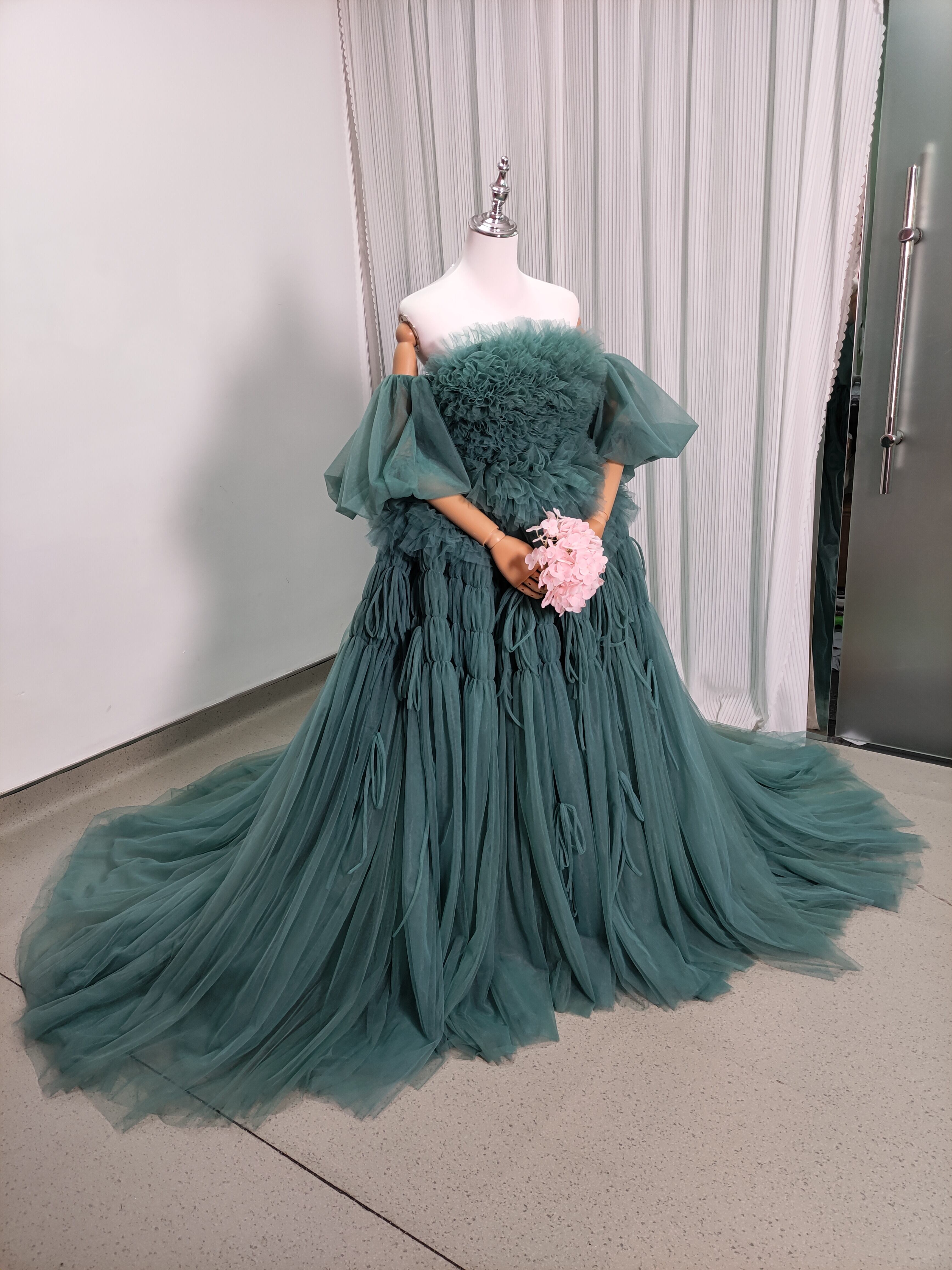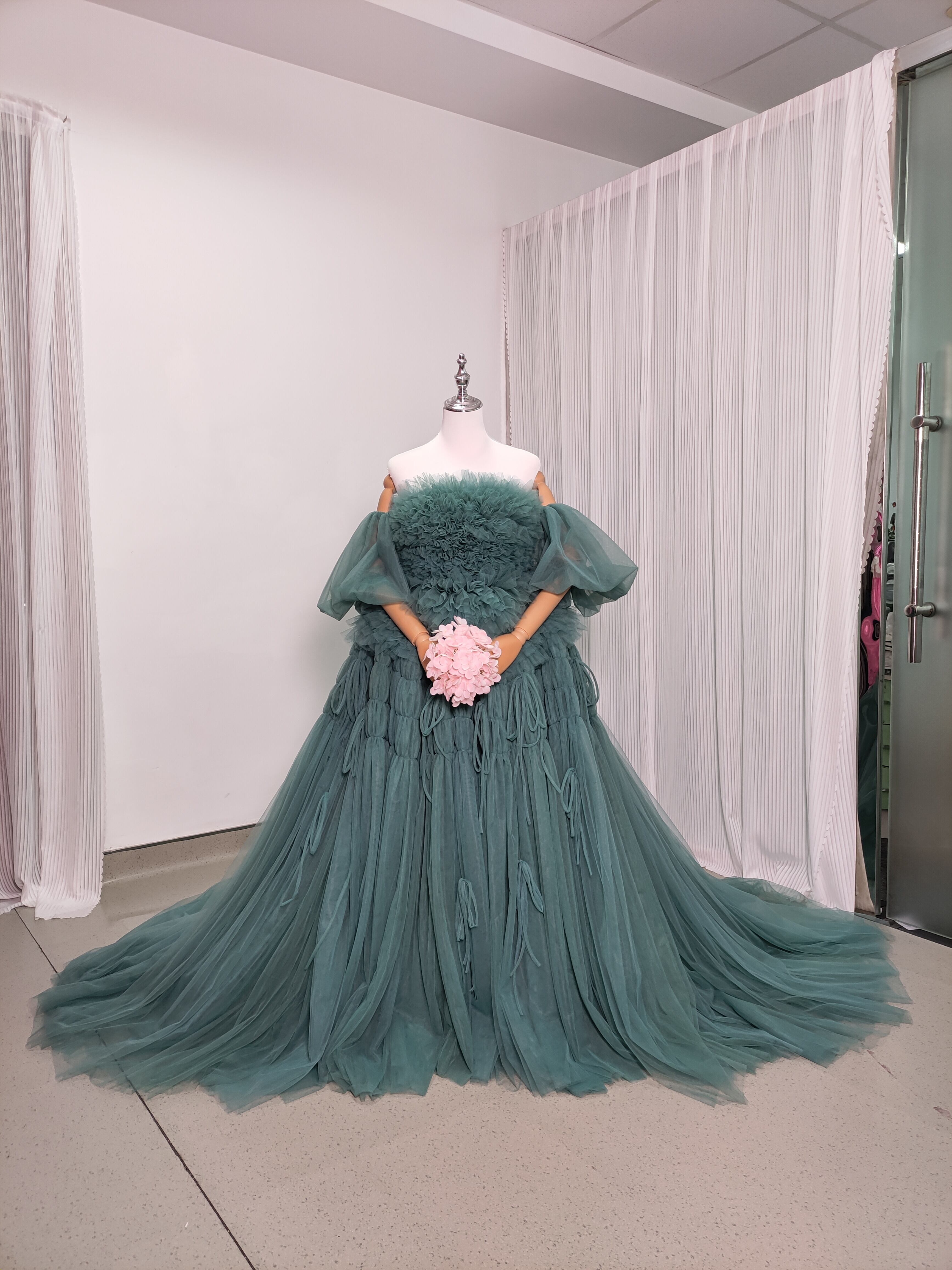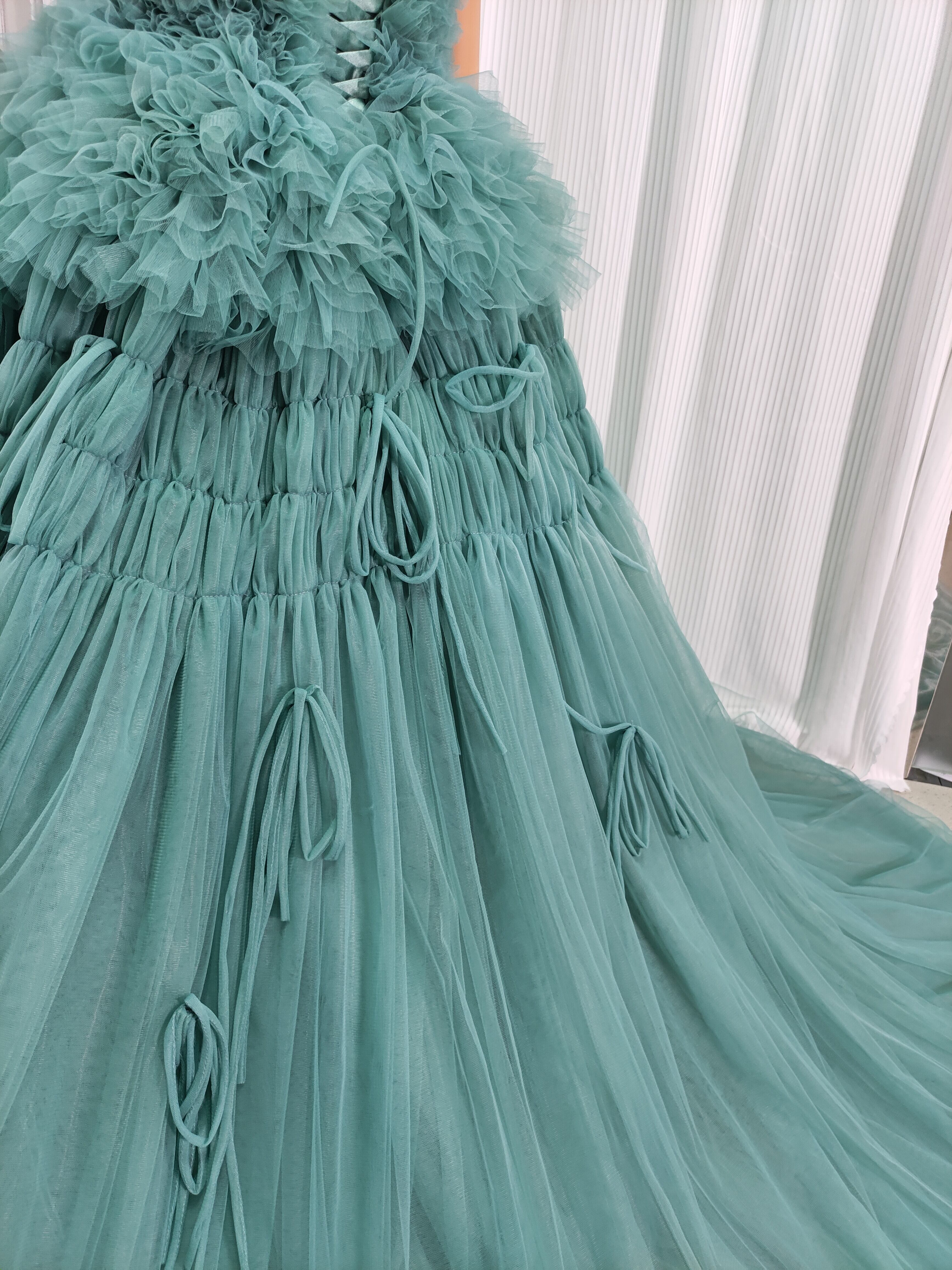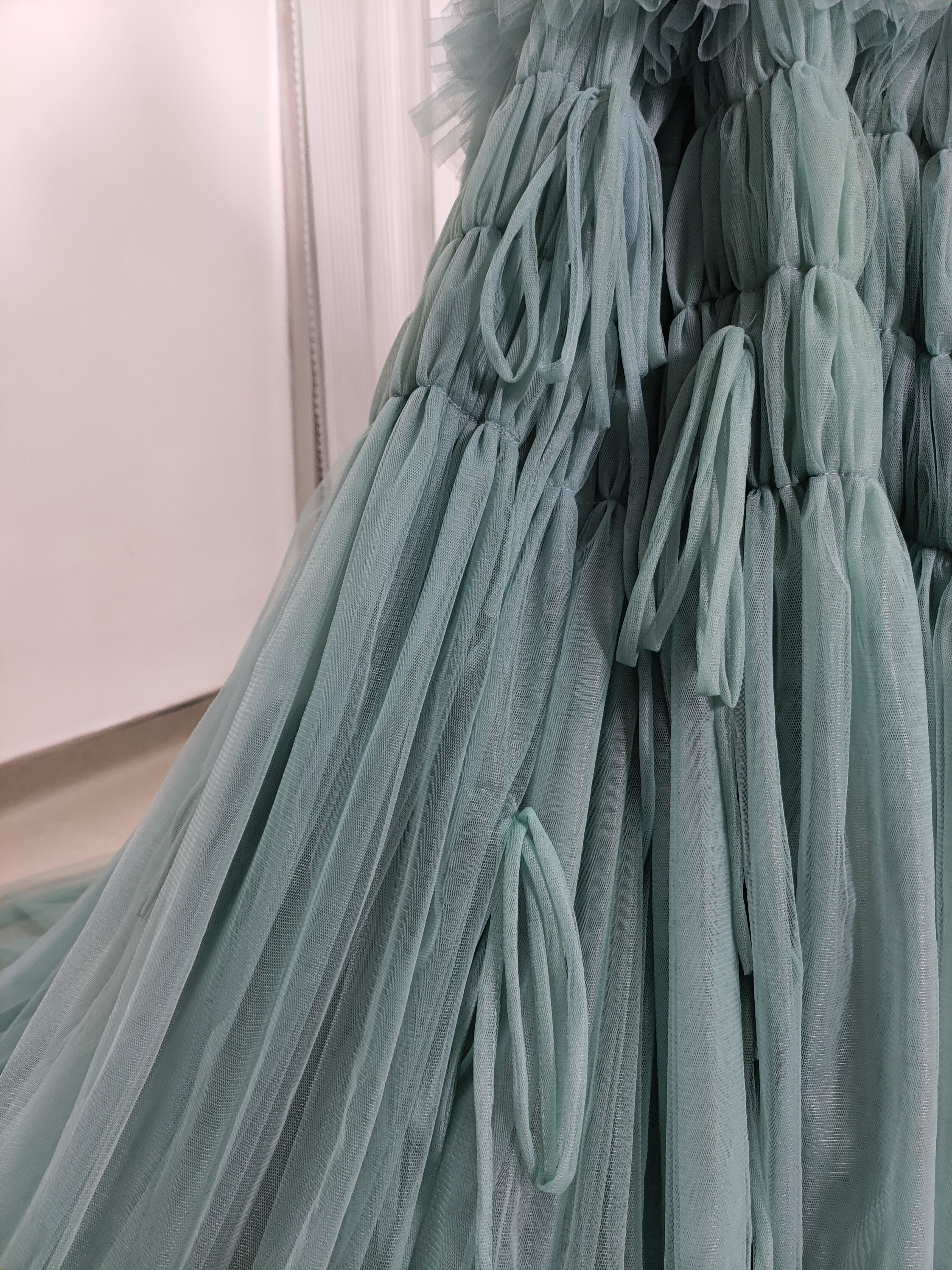 送料無料!ミントグリーンエンパイアラインカラードレス ソフトチュール もこもこドレス ボリュームたっぷり 前撮り/結