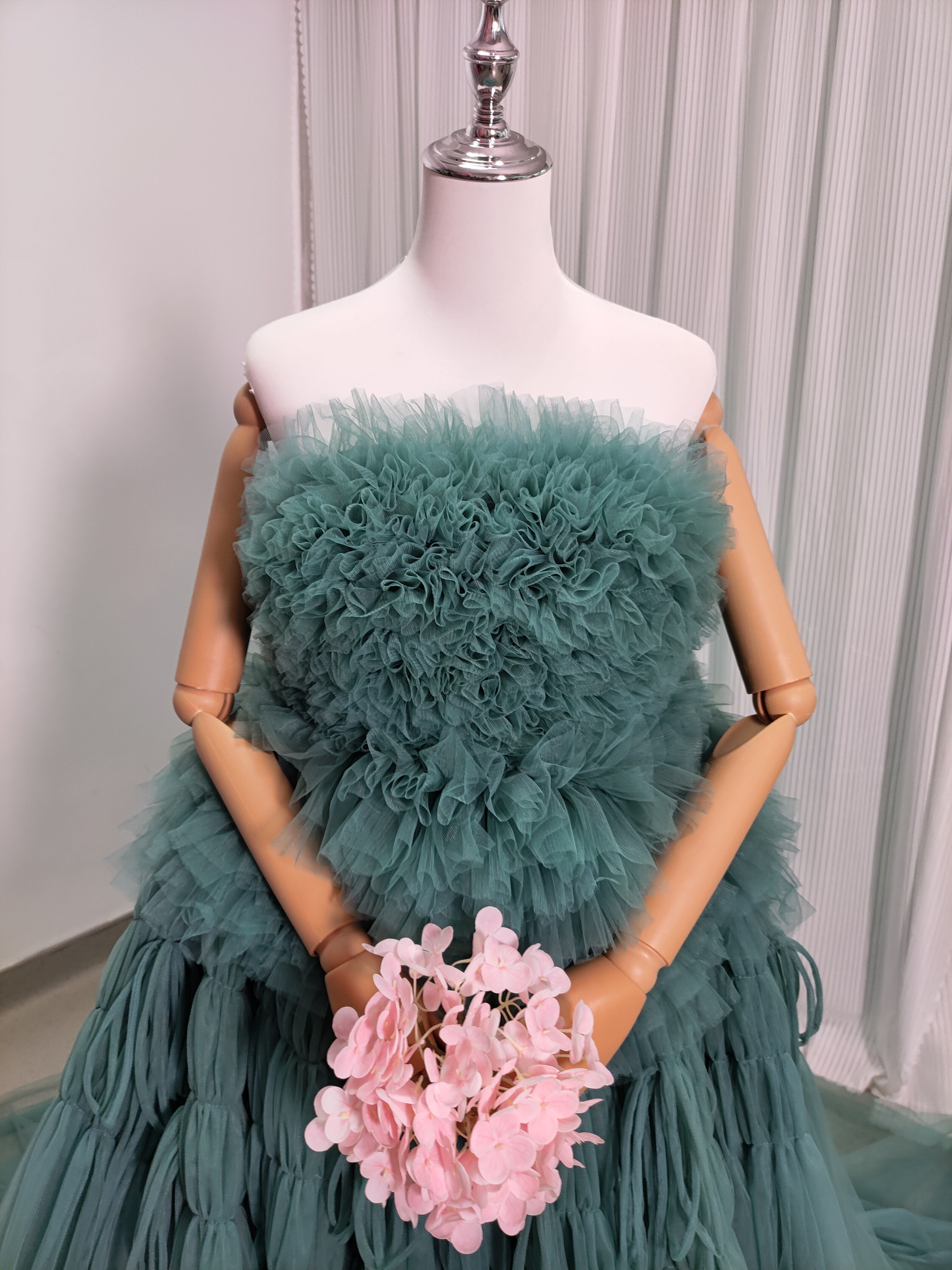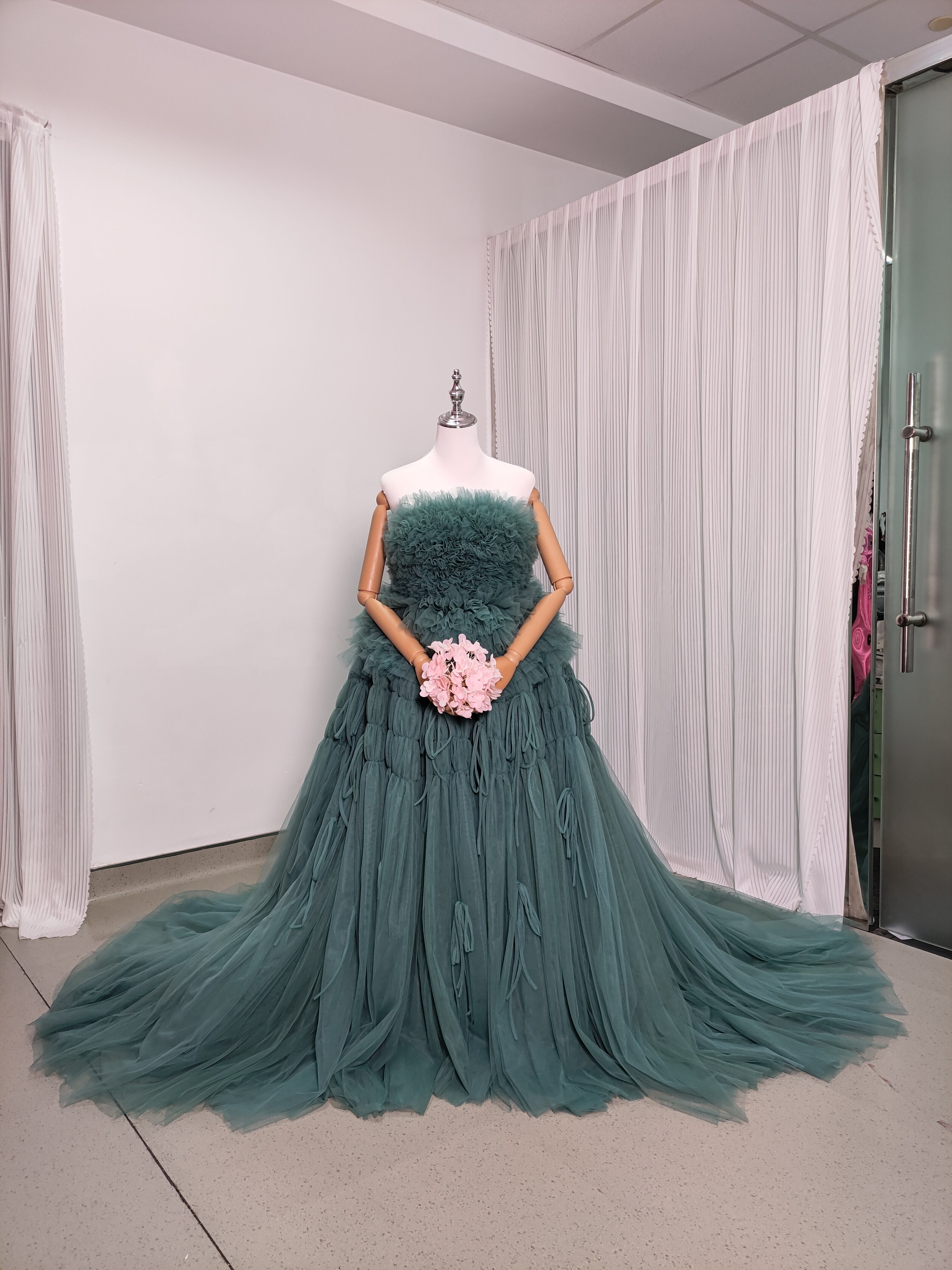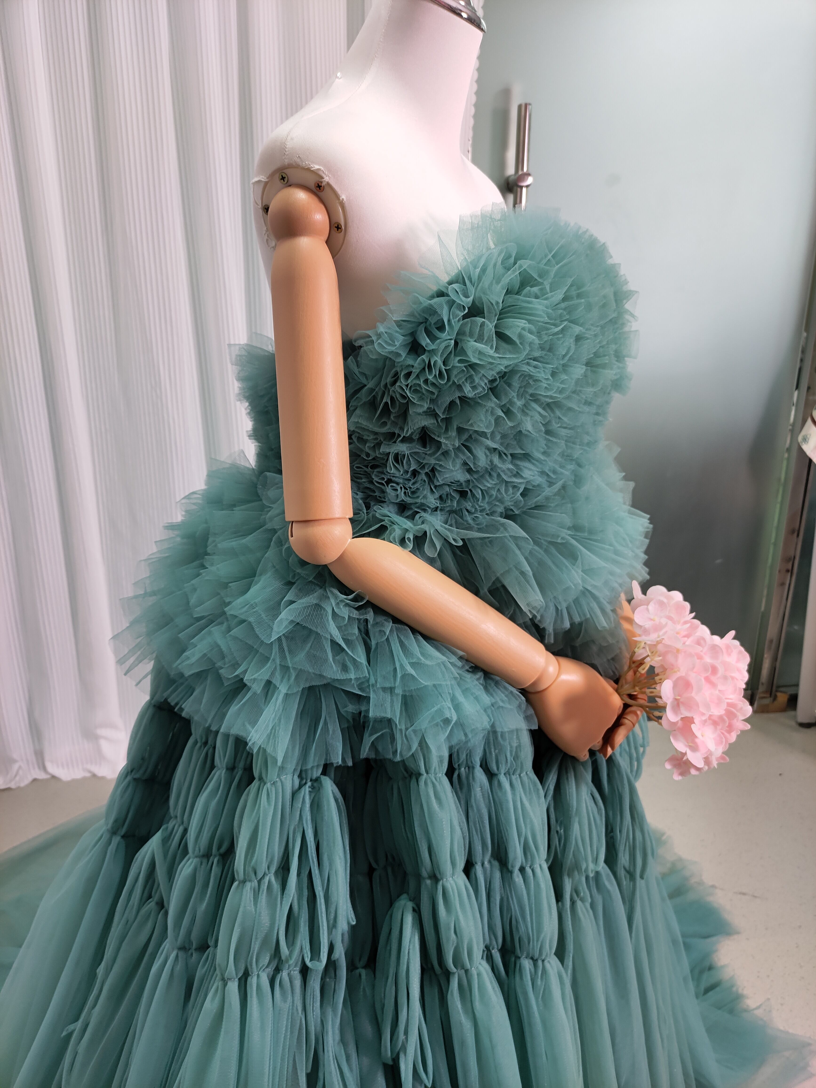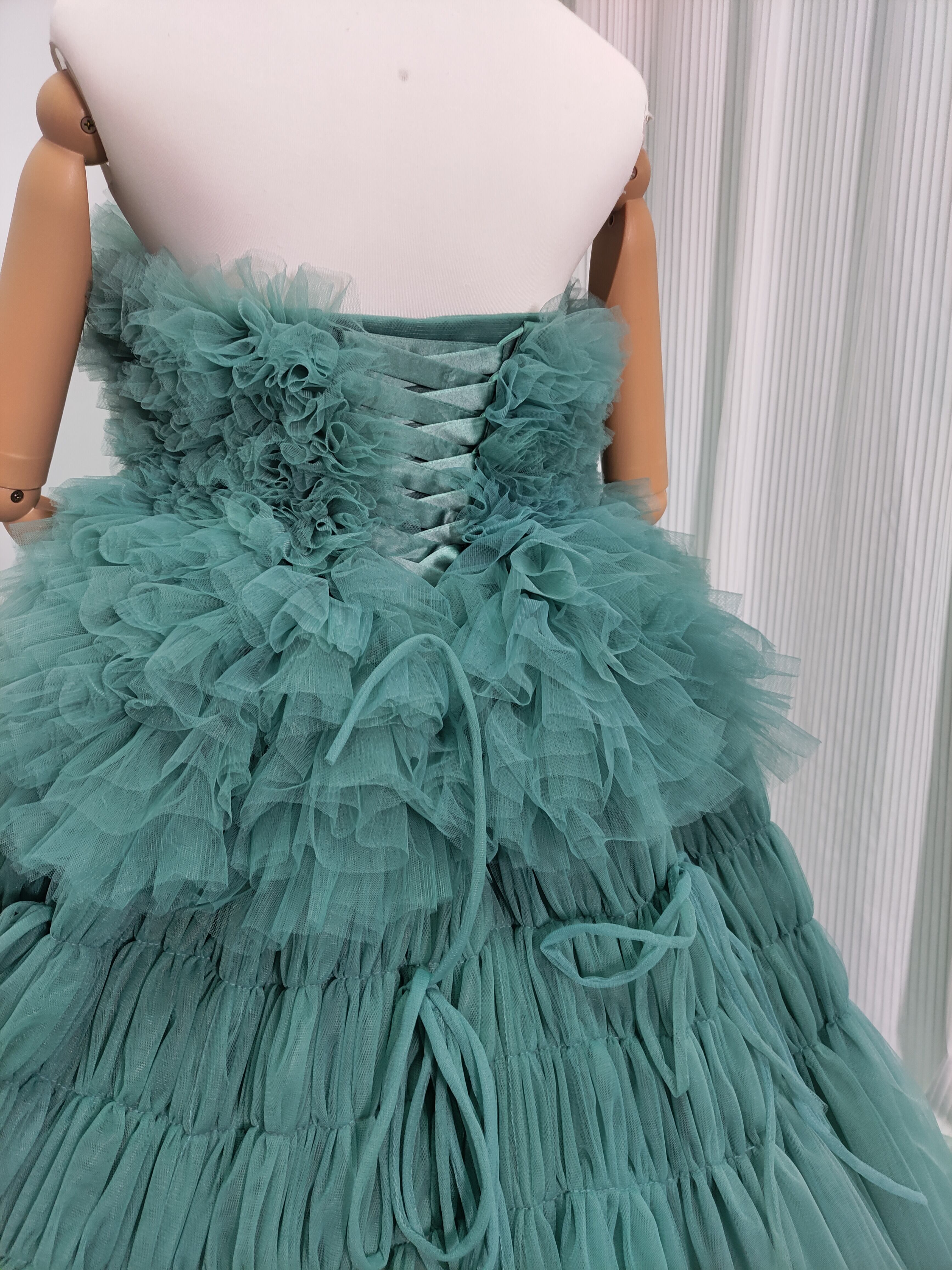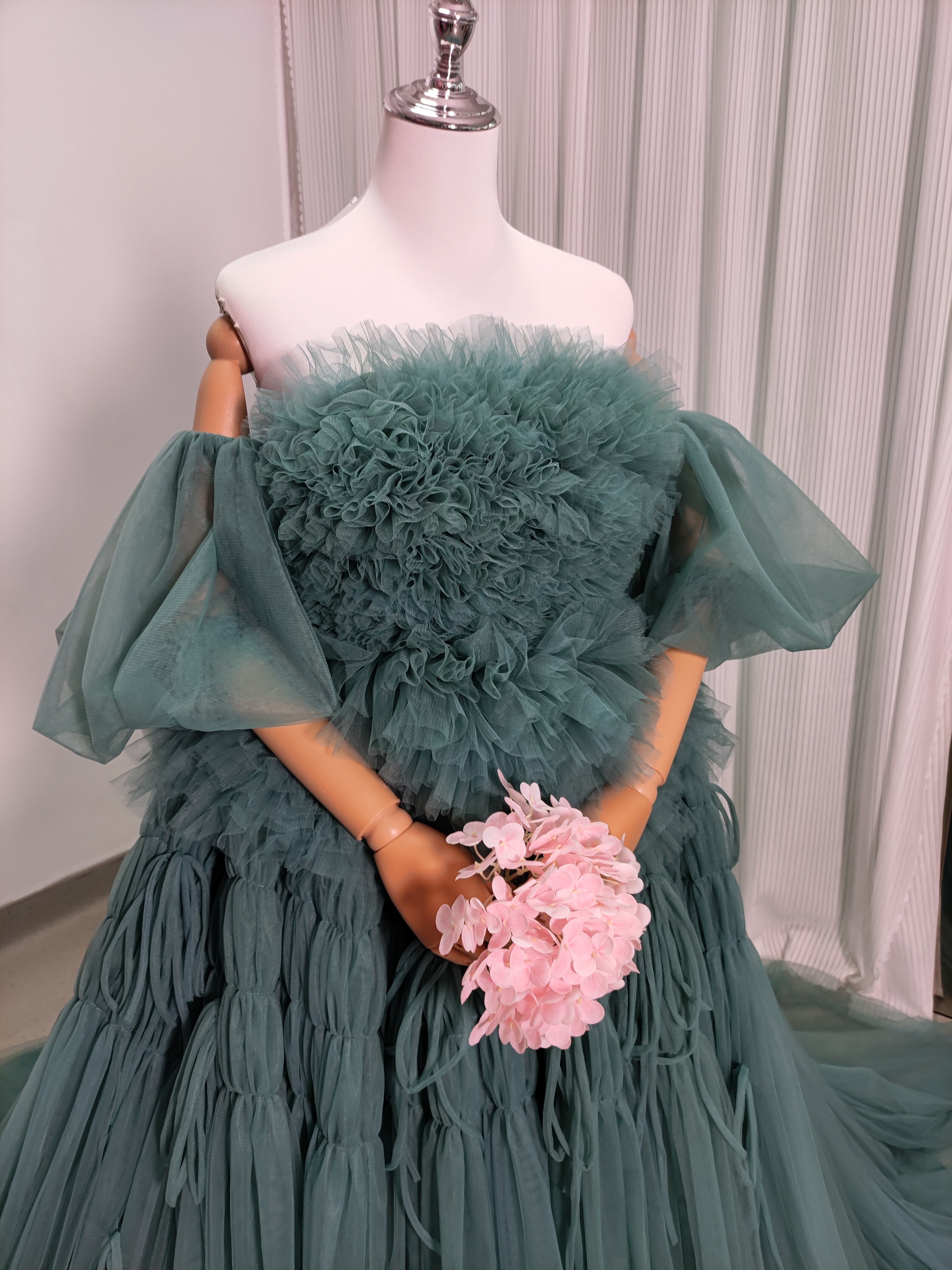送料無料!ミントグリーンエンパイアラインカラードレス ソフトチュール もこもこドレス ボリュームたっぷり 前撮り/結
