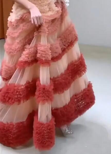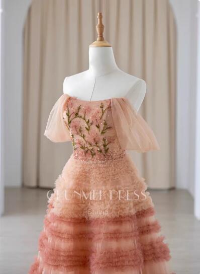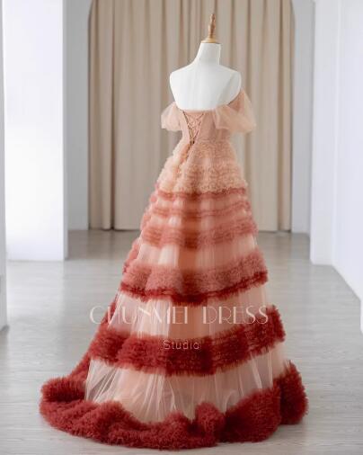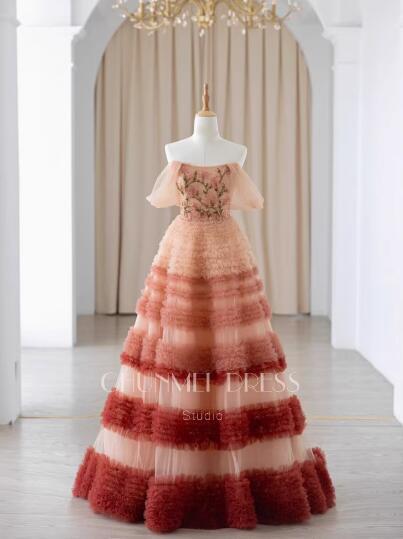 高品質!送料無料!カラードレス オフショルダー レッド/ピンク グラデーション かわいい エレガント 優雅 オーダードレス もふもふ ハンドメイド 花嫁 トレーン ミディアムドレス セレモニー パーティードレス 演奏ドレス ステージ ピアノ 夜会服 イブニングドレス 合コン ブライズメイド 誕生日プレゼント | David1021k Dress(ダヴィドレス)