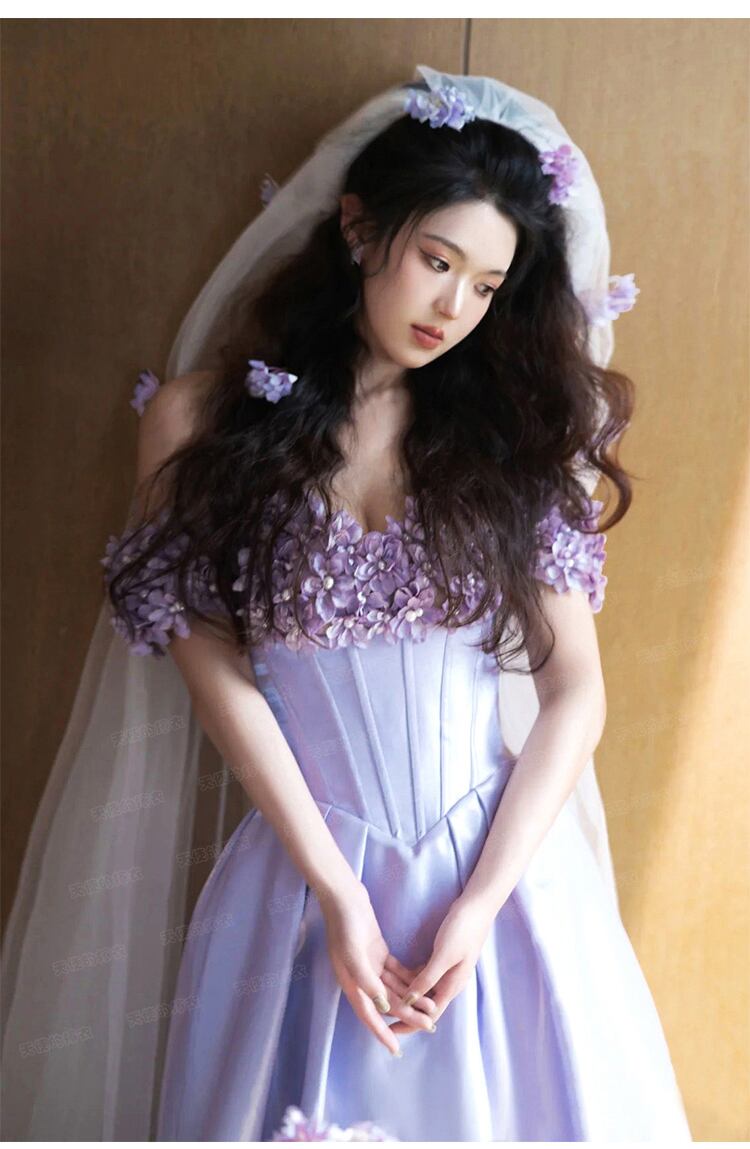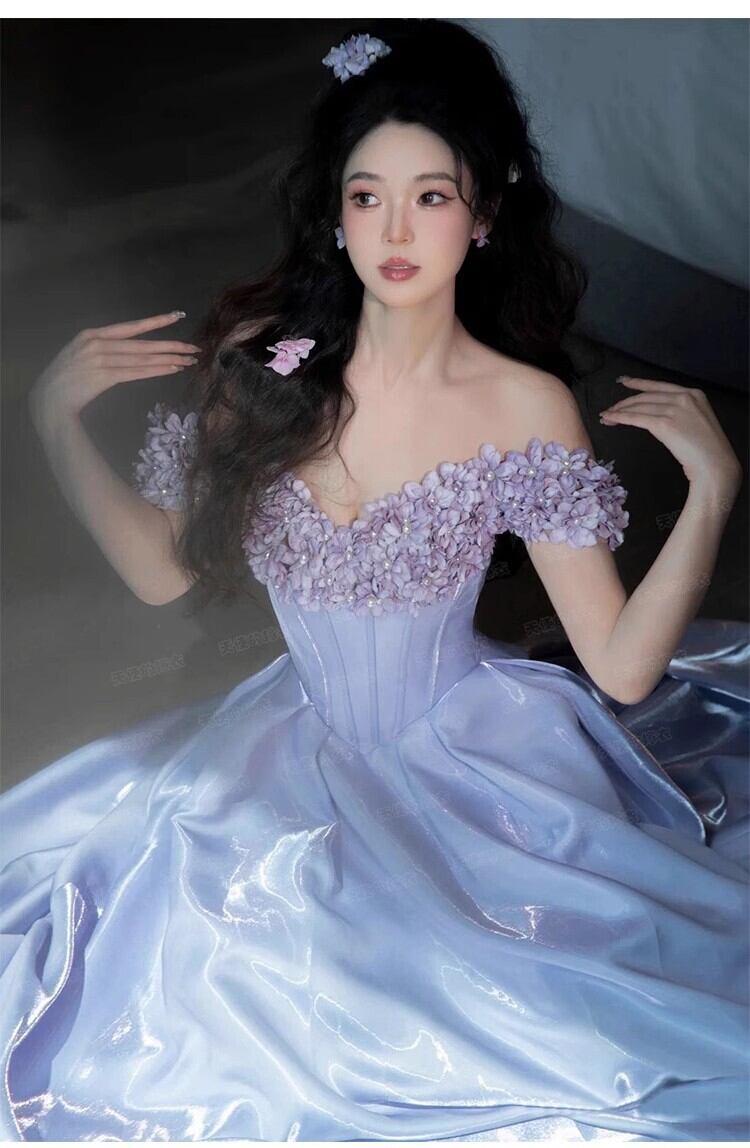 高品質!送料無料!カラードレス オフショルダー ラベンダー色 パープル/紫 かわいい エレガント 優雅 オーダードレス ハンドメイド 花嫁 結婚式/前撮り/二次会/2次会/披露宴/演奏会/音楽会 合コン パーティードレス | David1021k Dress(ダヴィドレス)