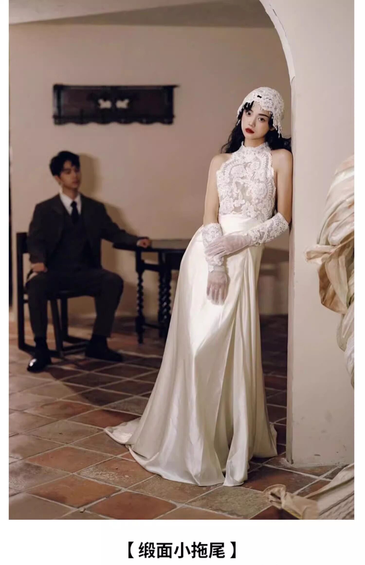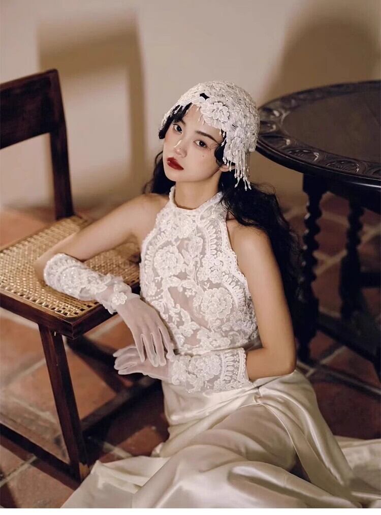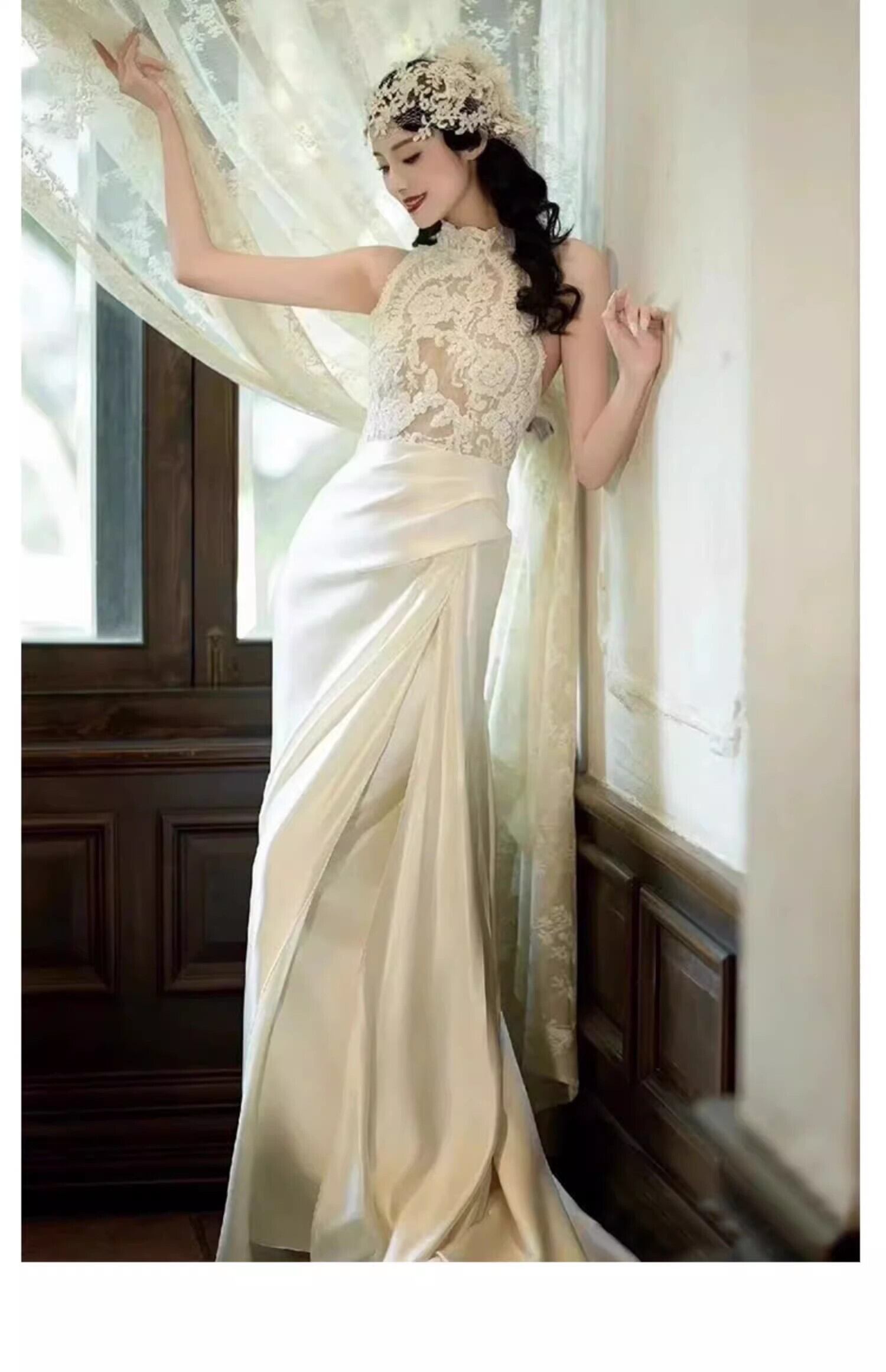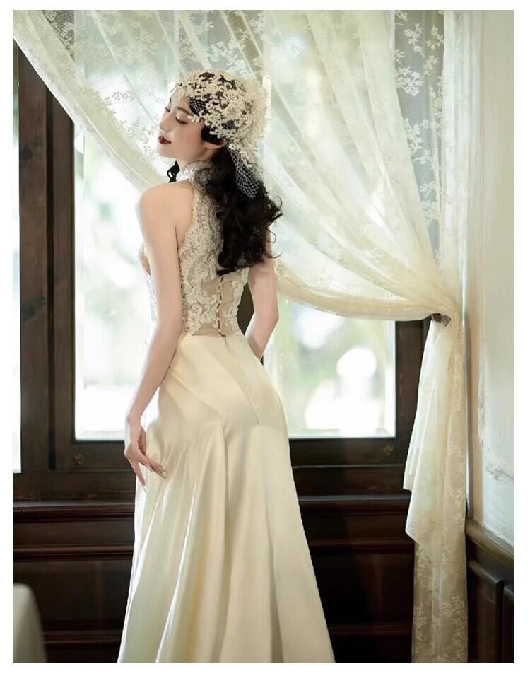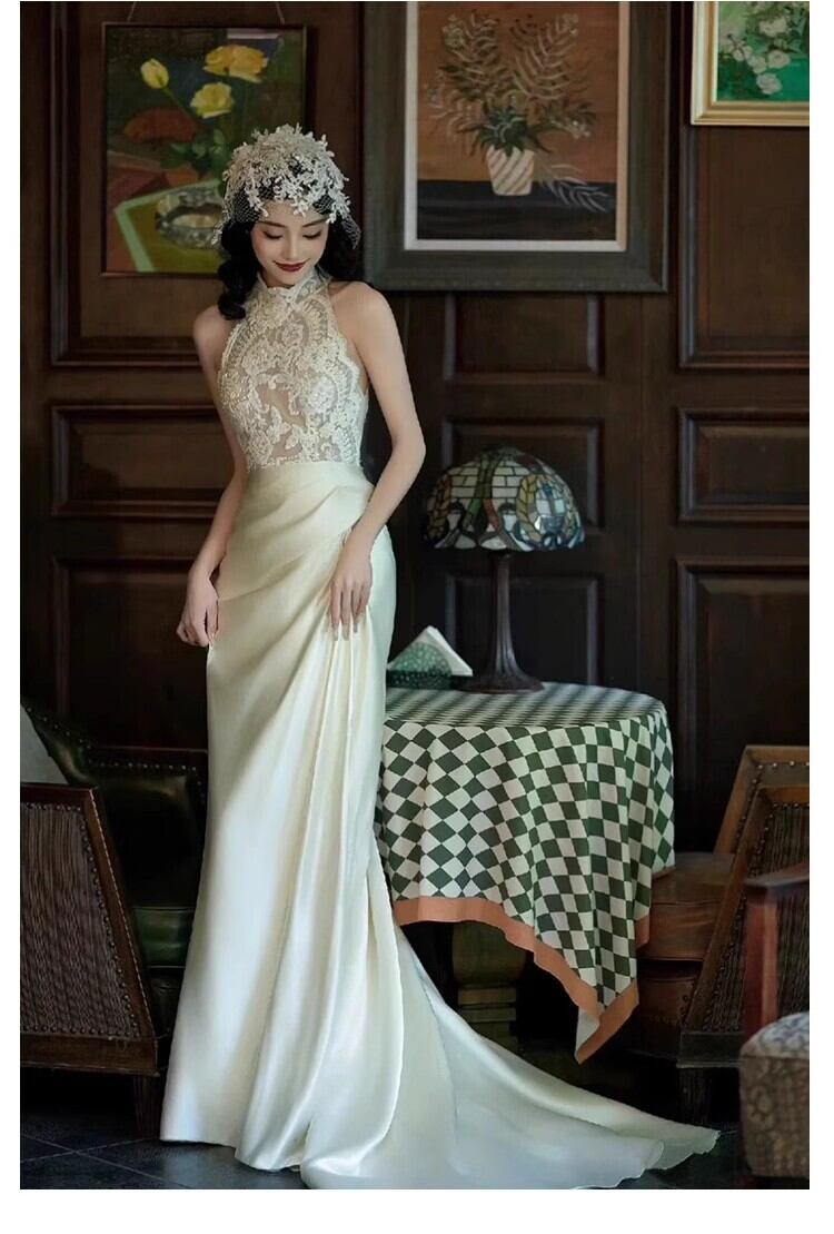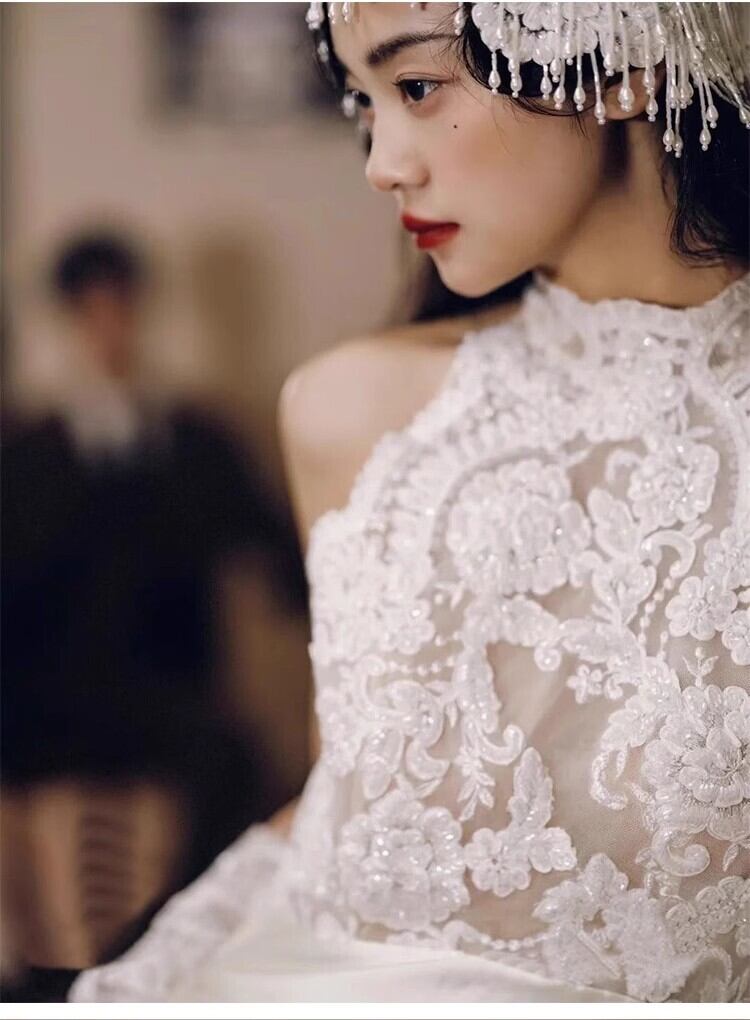 高品質!送料無料!ウエディングドレス 上品レース ホルターネック ノースリーブ かわいい エレガント 優雅 ハンドメイド 華やかなトレーン オーダードレス ガーデンウェディング 花嫁 豪華 結婚式/前撮り/二次会/2次会/披露宴/演奏会/音楽会 | David1021k Dress(ダヴィドレス)