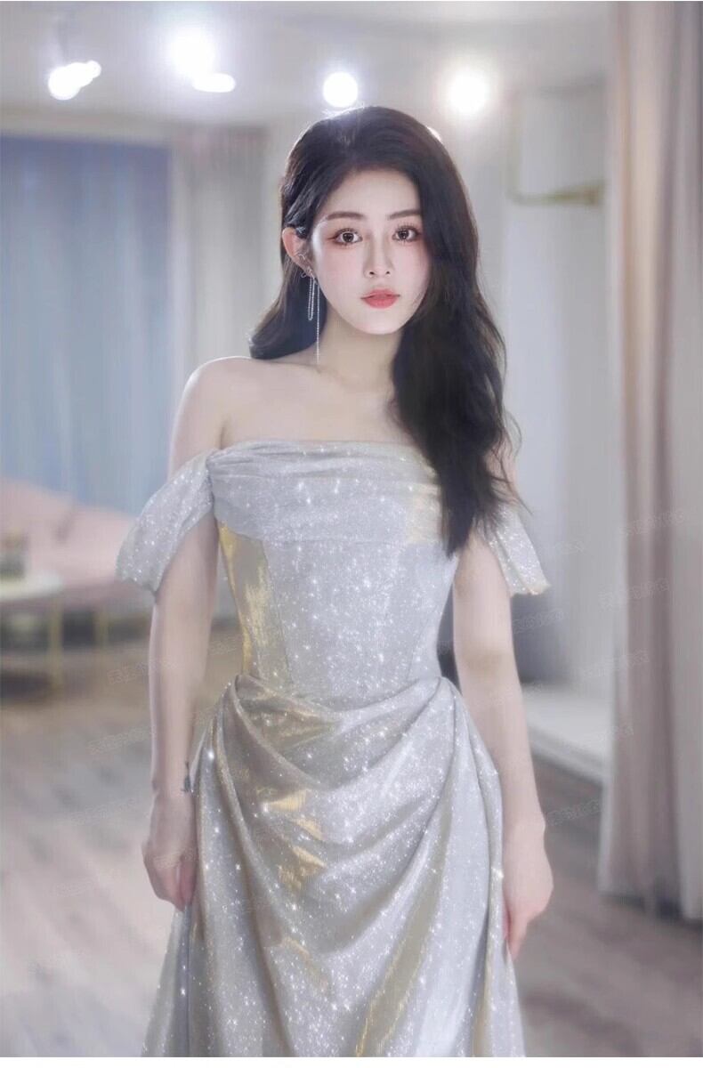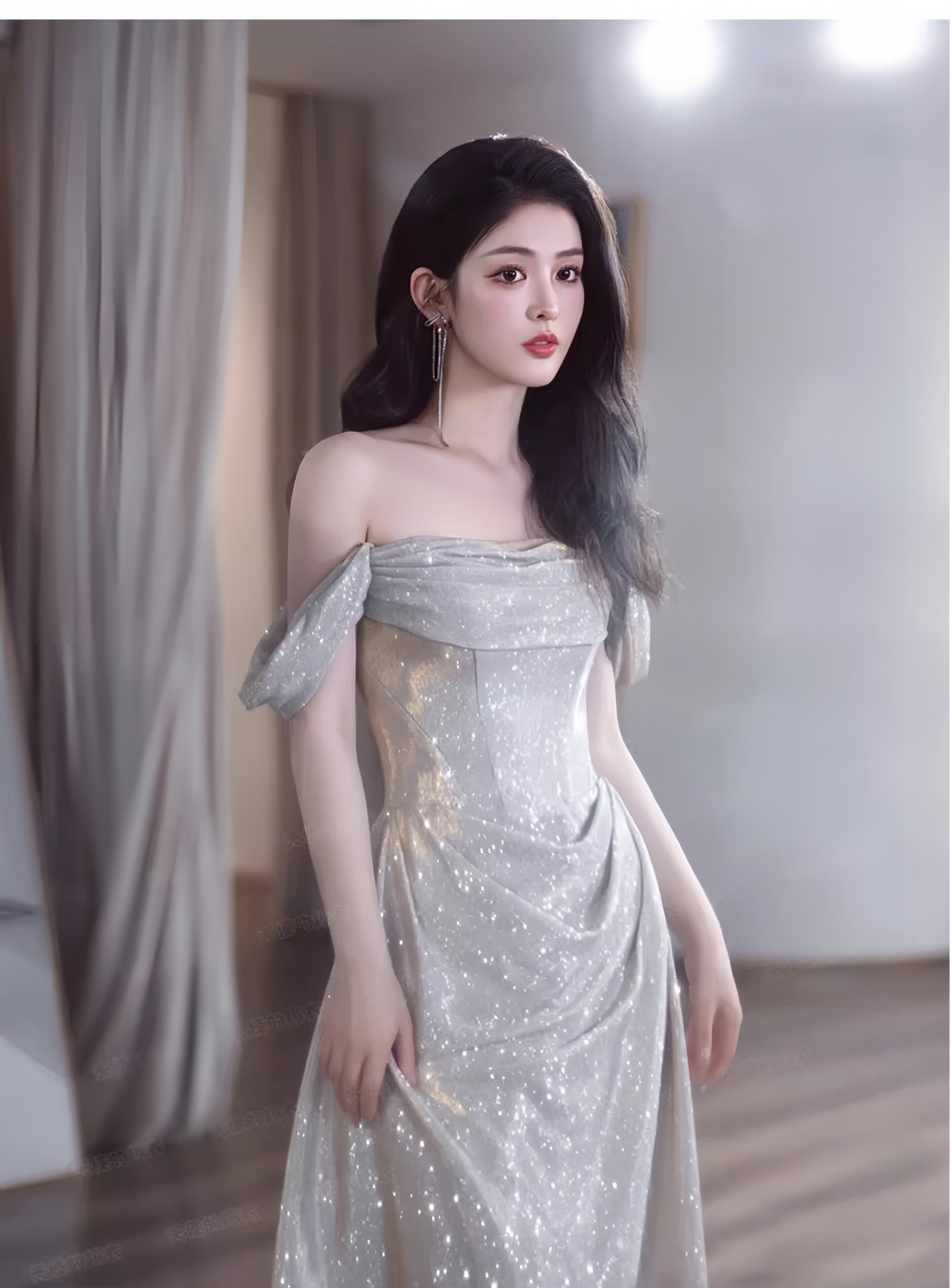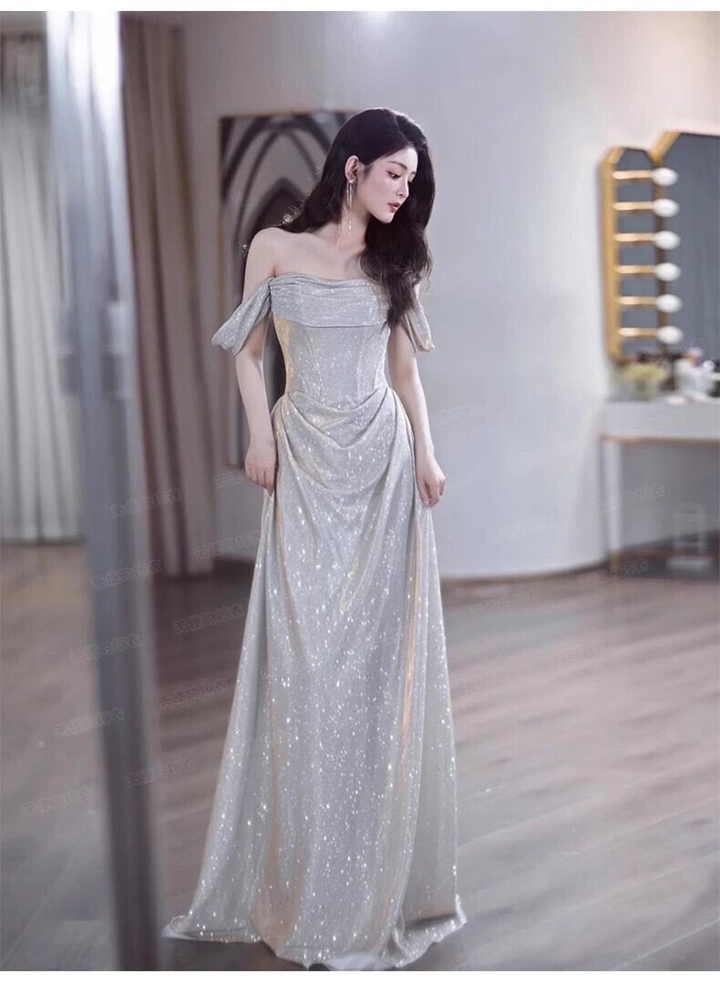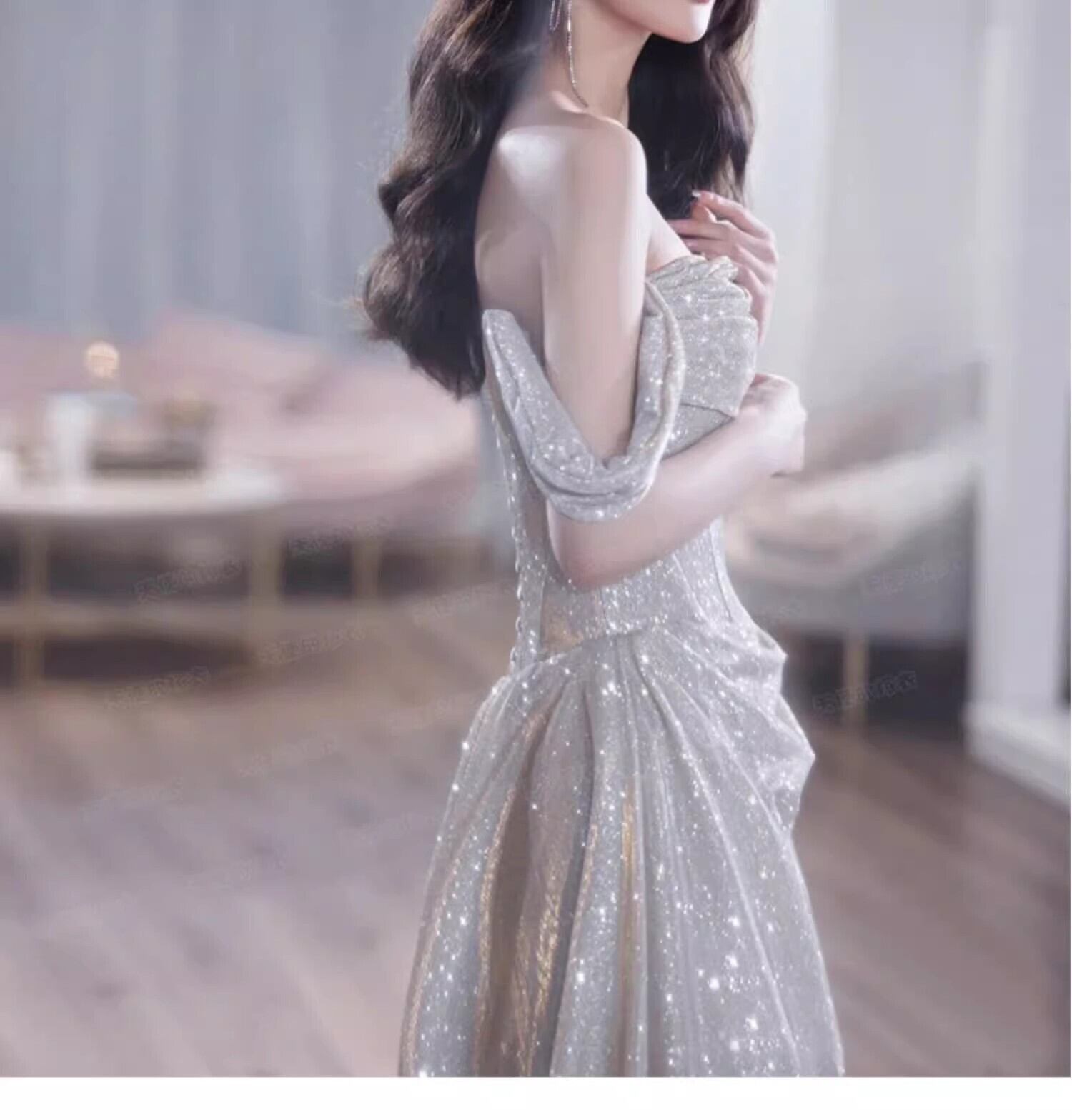 送料無料!パーティードレス カラードレス オフショルダー シルバー キラキラ かわいい エレガント 優雅 ミディアムドレス セレモニー パーティードレス 演奏ドレス ステージ ピアノ 夜会服 イブニングドレス 合コン ブライズメイド 誕生日プレゼント | David1021k Dress(ダヴィドレス)