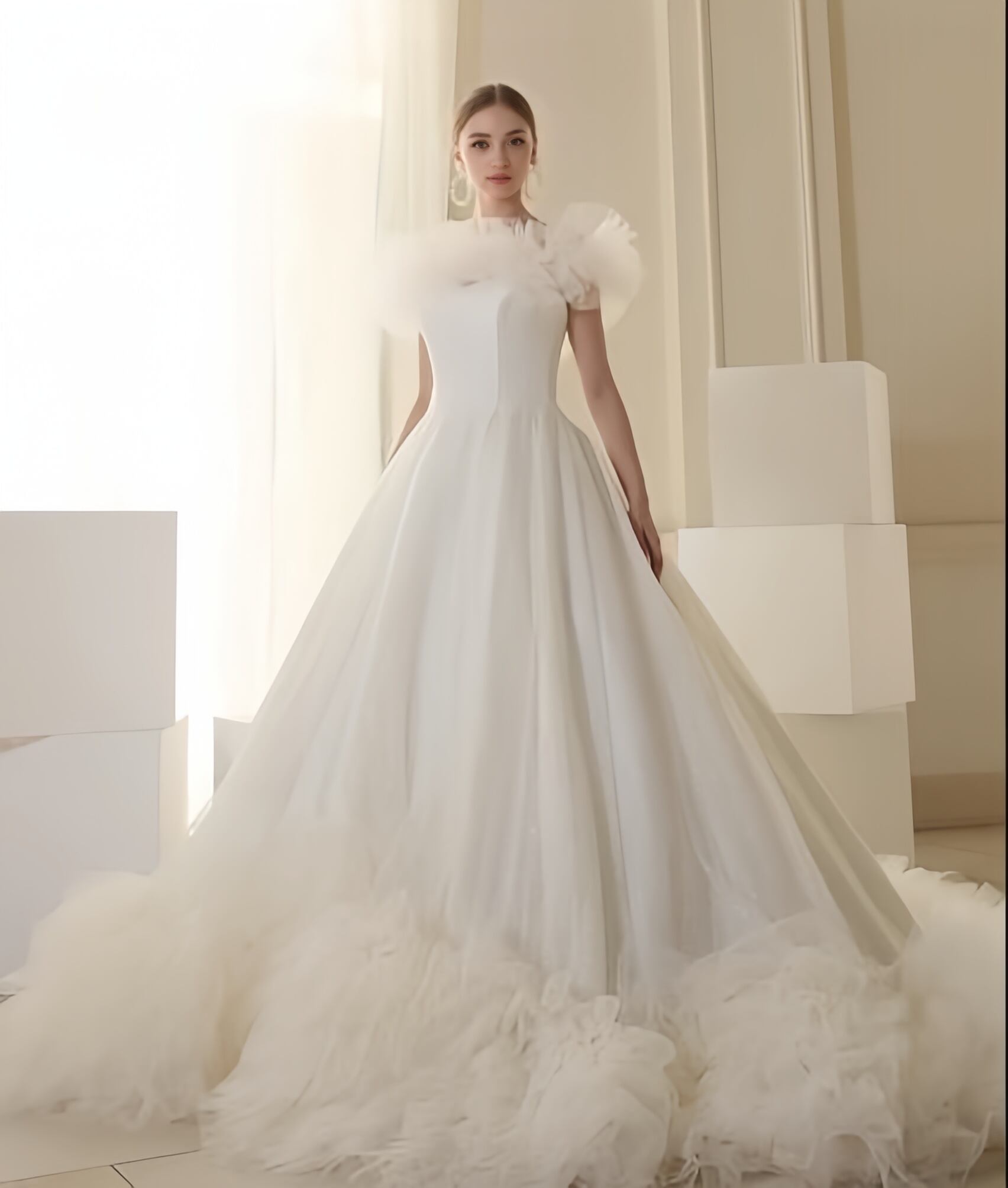 高品質!送料無料!ウエディングドレス オフショルダー フリル かわいい キラキラチュール ラメ エレガント 優雅 ハンドメイド トレーン ソフトチュール オーダードレス ガーデンウェディング プリンセスライン 花嫁 豪華 結婚式/前撮り | David1021k Dress(ダヴィドレス)