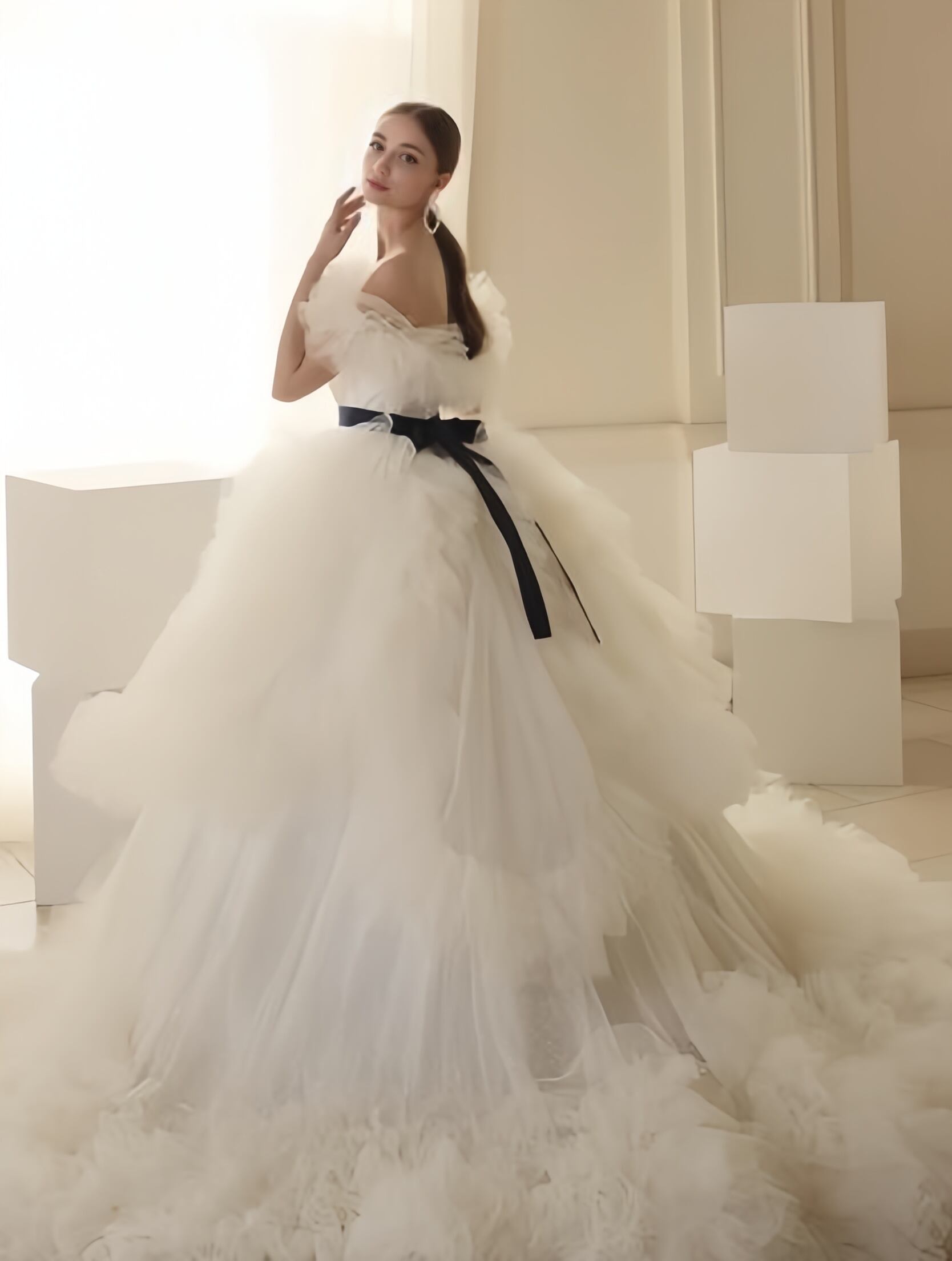 高品質!送料無料!ウエディングドレス オフショルダー フリル かわいい キラキラチュール ラメ エレガント 優雅 ハンドメイド トレーン ソフトチュール オーダードレス ガーデンウェディング プリンセスライン 花嫁 豪華 結婚式/前撮り