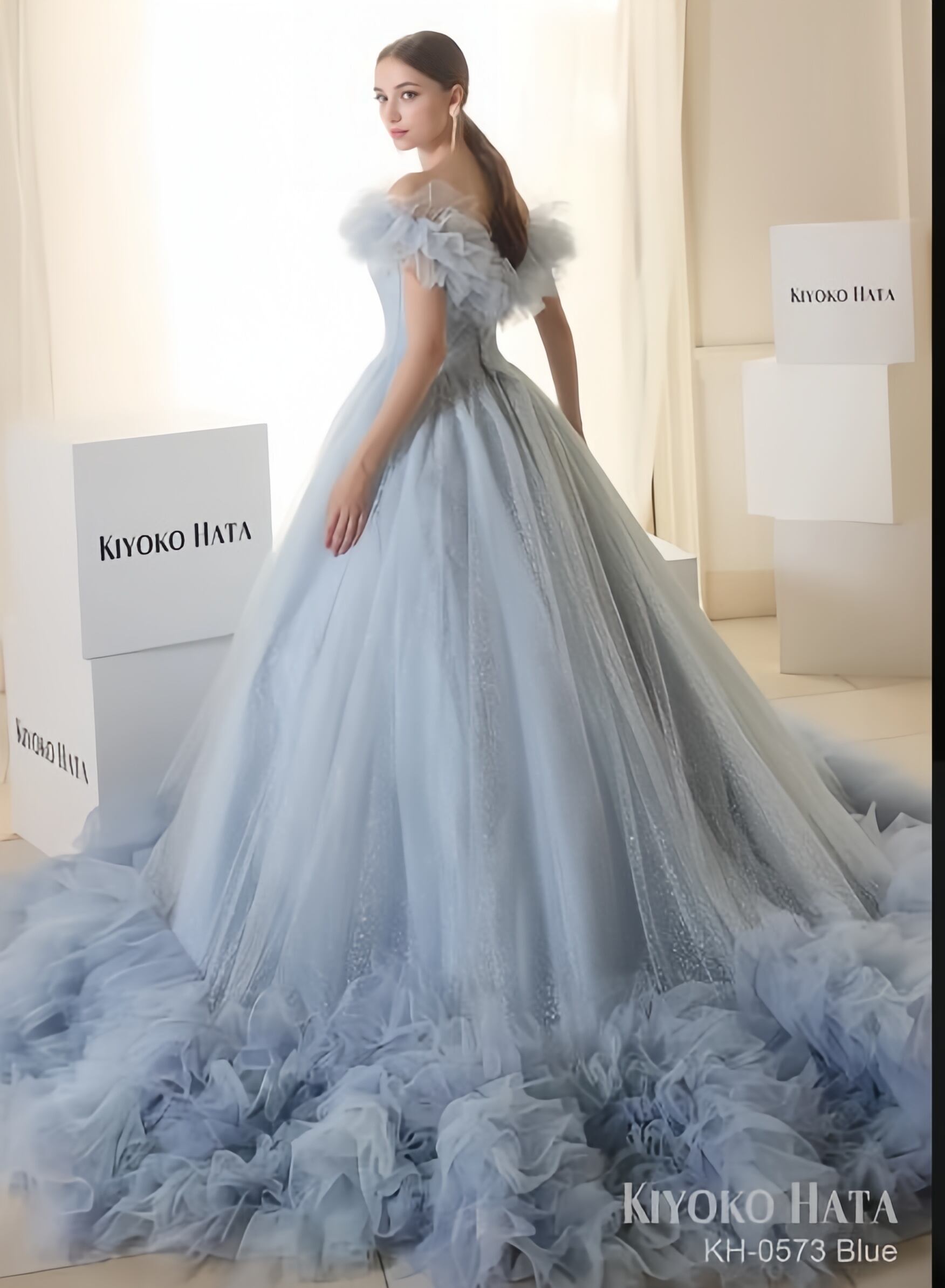 高品質!送料無料!カラードレス オフショルダー 爽やかで優しいブルー フリル かわいい キラキラチュール ラメ エレガント 優雅 ハンドメイド トレーン ソフトチュール オーダードレス ガーデンウェディング プリンセスライン 花嫁 豪華 結婚式/前撮り | David1021k Dress(ダヴィドレス)