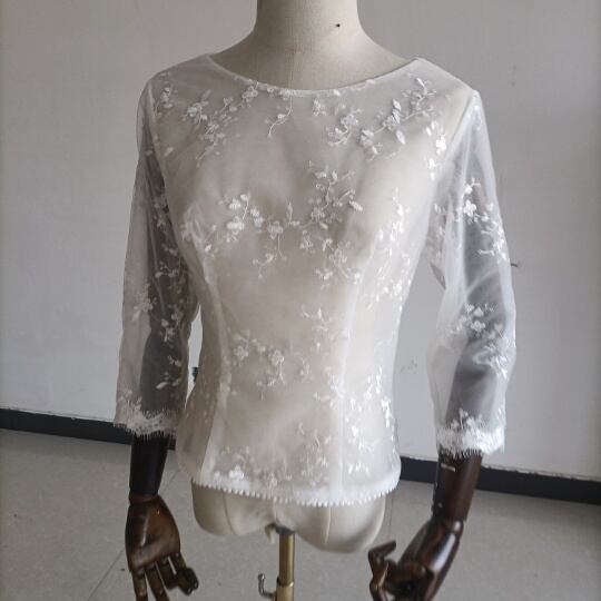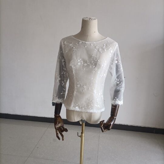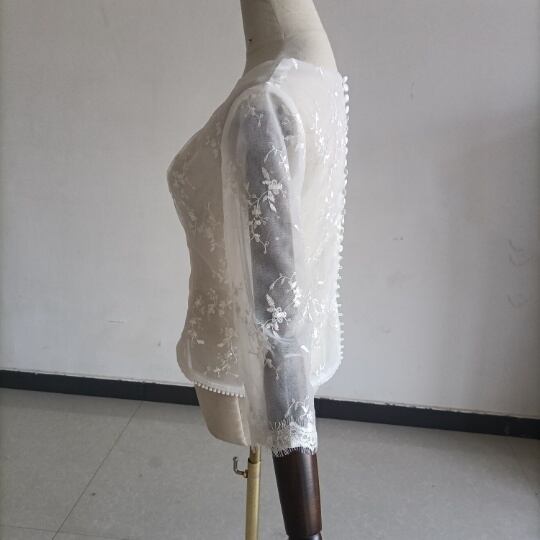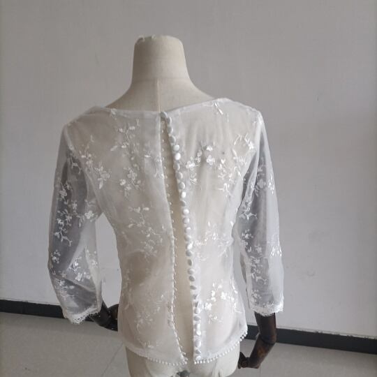 クルーネックボレロ トップス インナーブラウス 魅惑の花レース くるみボタン 七分袖丈