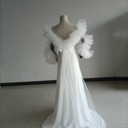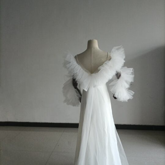 抜群のおしゃれ見えパーティードレス ホワイト トレーン ウエディングドレス シアーな美しさ ポンチョ + ソフトチュール ポンチョ演奏会 ハンドメイド オーダードレス 結婚式/前撮り | David1021k Dress(ダヴィドレス)