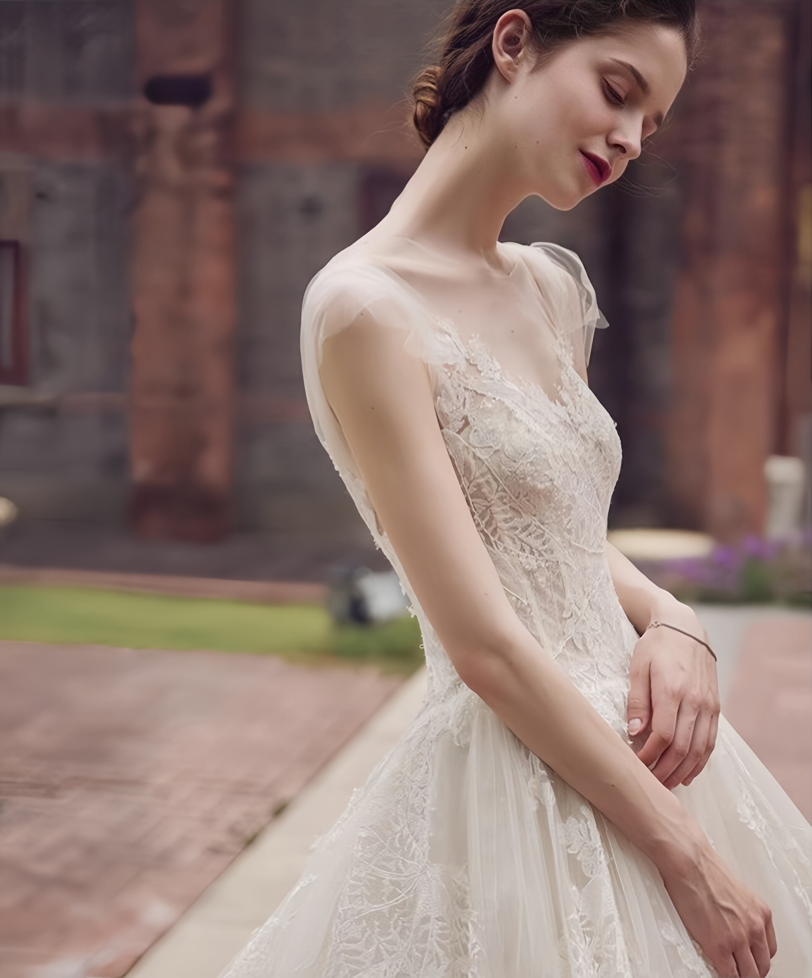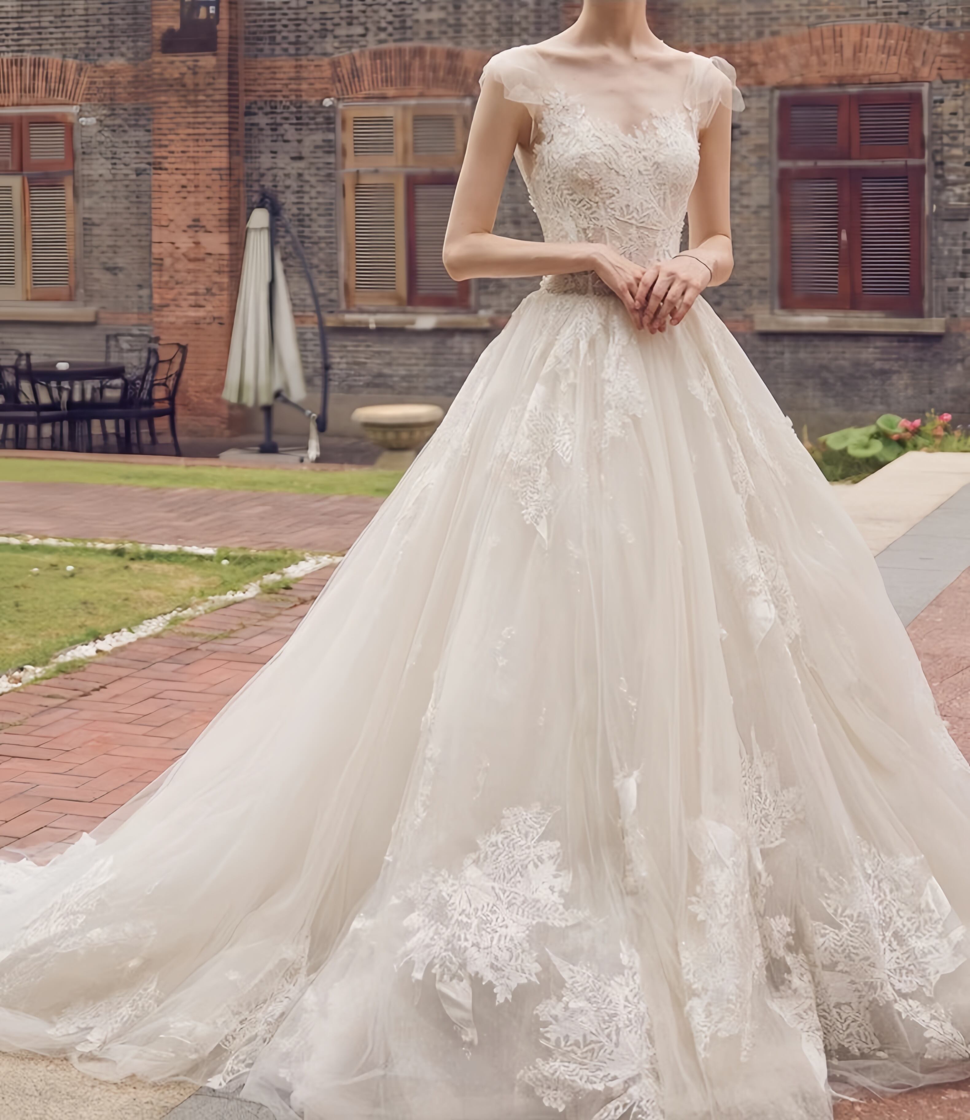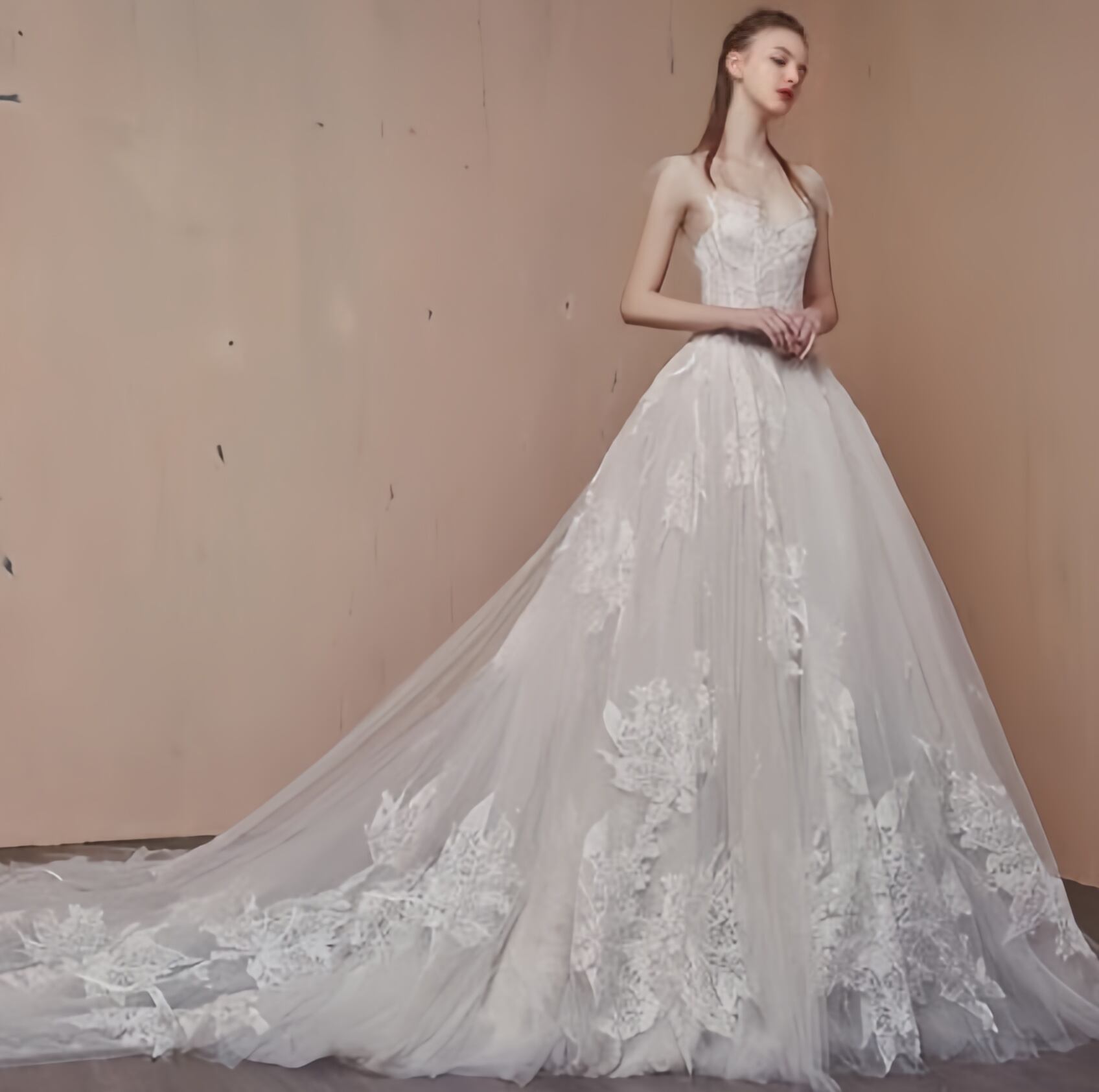 送料無料!美品! ウエディングドレス 上品レース ソフトチュール 華やかなトレーン 憧れのドレス 【お買得パニエ+ベール+グローブ無料】
