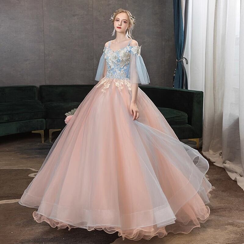 美品!パーティードレス カラードレス ピンク 水色 ソフトチュール キャミソール フレアスカート エレガント 華やか シアーな美しさ