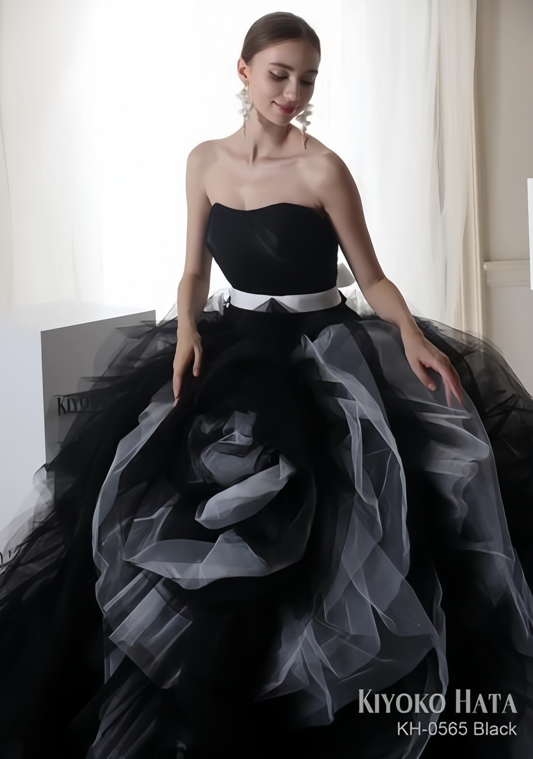 高品質!送料無料!カラードレス ベアトップ 黒/ブラック グラデーション 柔らかく重ねたチュールスカート かわいい エレガント 優雅 オーダードレス ハンドメイド 合コン パーティードレス 花嫁 トレーン 結婚式/前撮り/二次会/2次会/披露宴/演奏会/音楽会