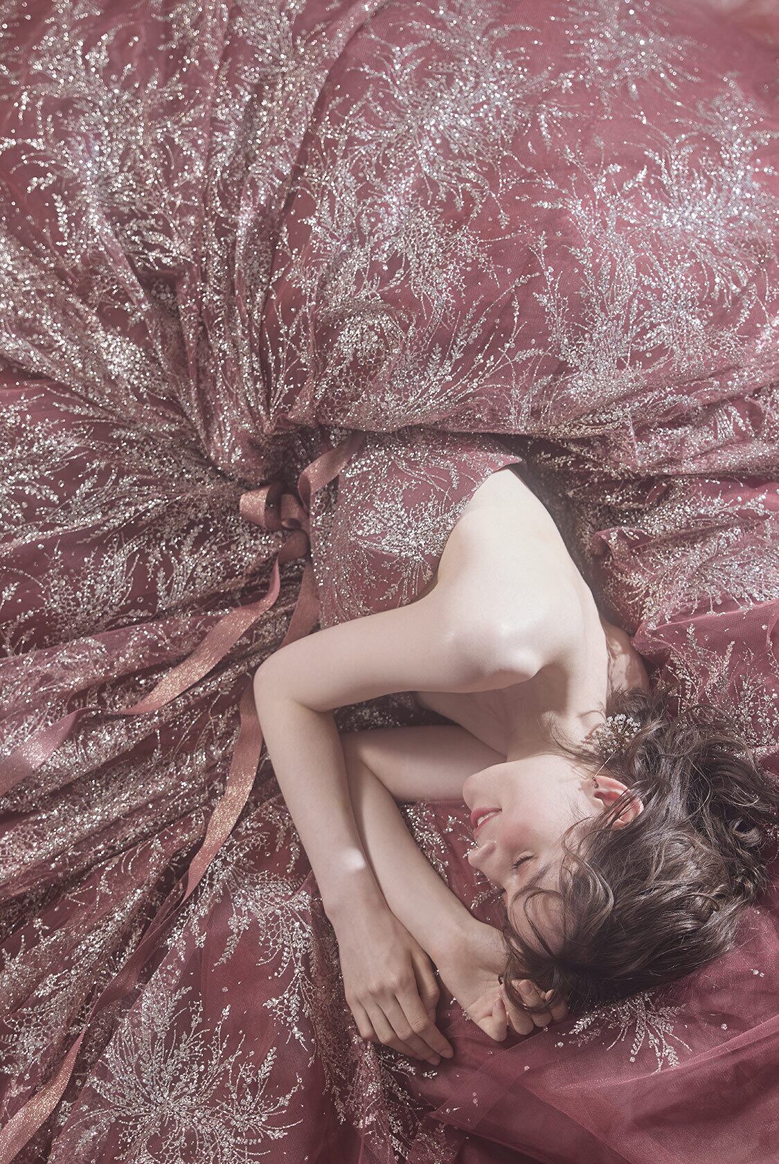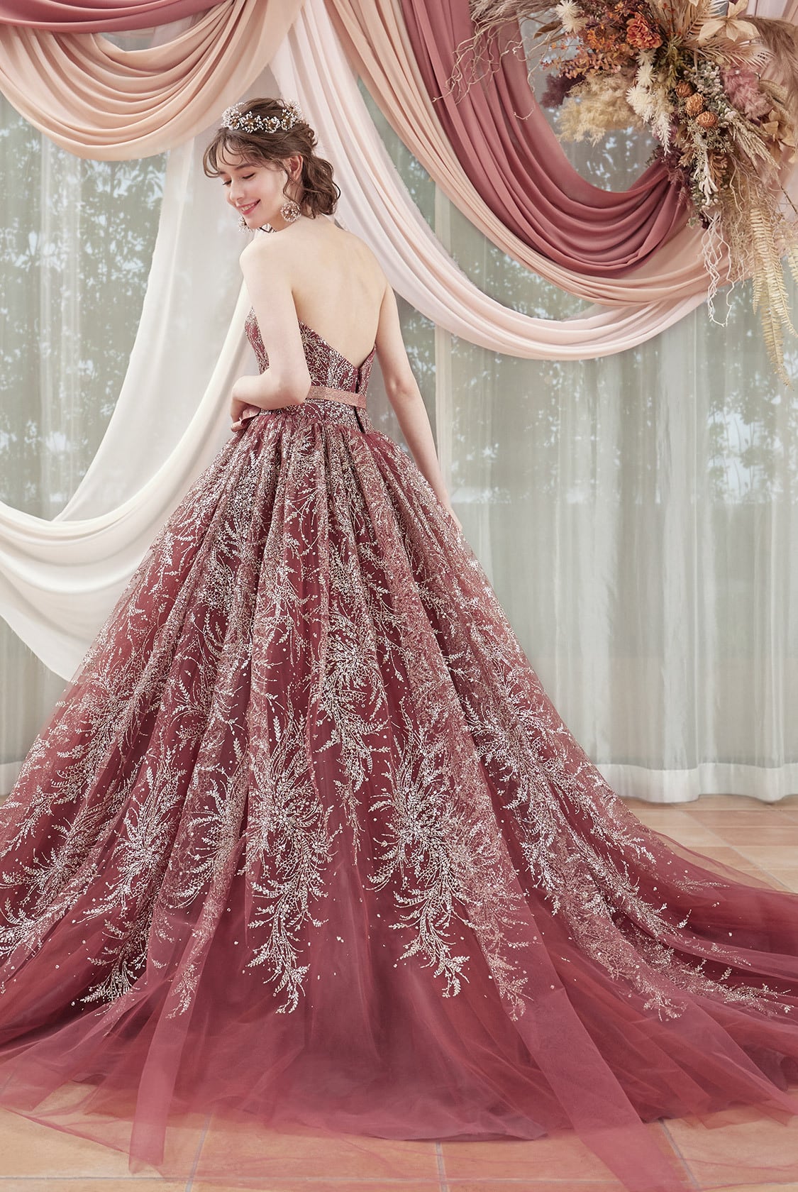 高品質!送料無料!カラードレス ワインレッド 臙脂色 ベルト ベアトップ かわいい 豪華 花柄のモチーフ刺繍が美しく 贅沢 エレガント 優雅 ハンドメイド トレーン ソフトチュール オーダードレス ガーデンウェディング プリンセスライン パーティードレス 花嫁 豪華 結婚式/前撮り | David1021k Dress(ダヴィドレス)