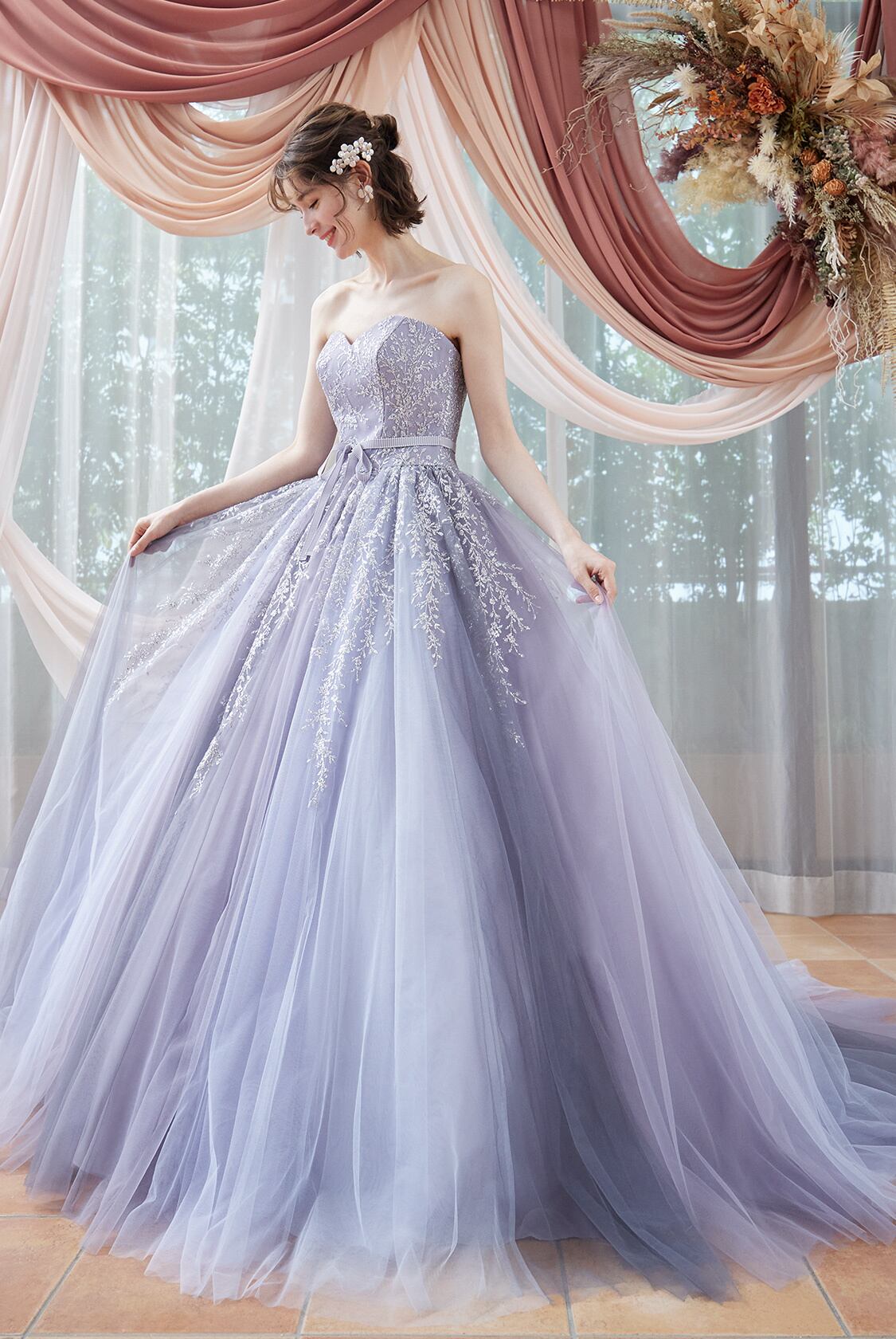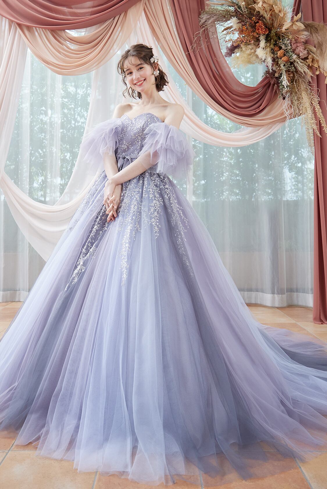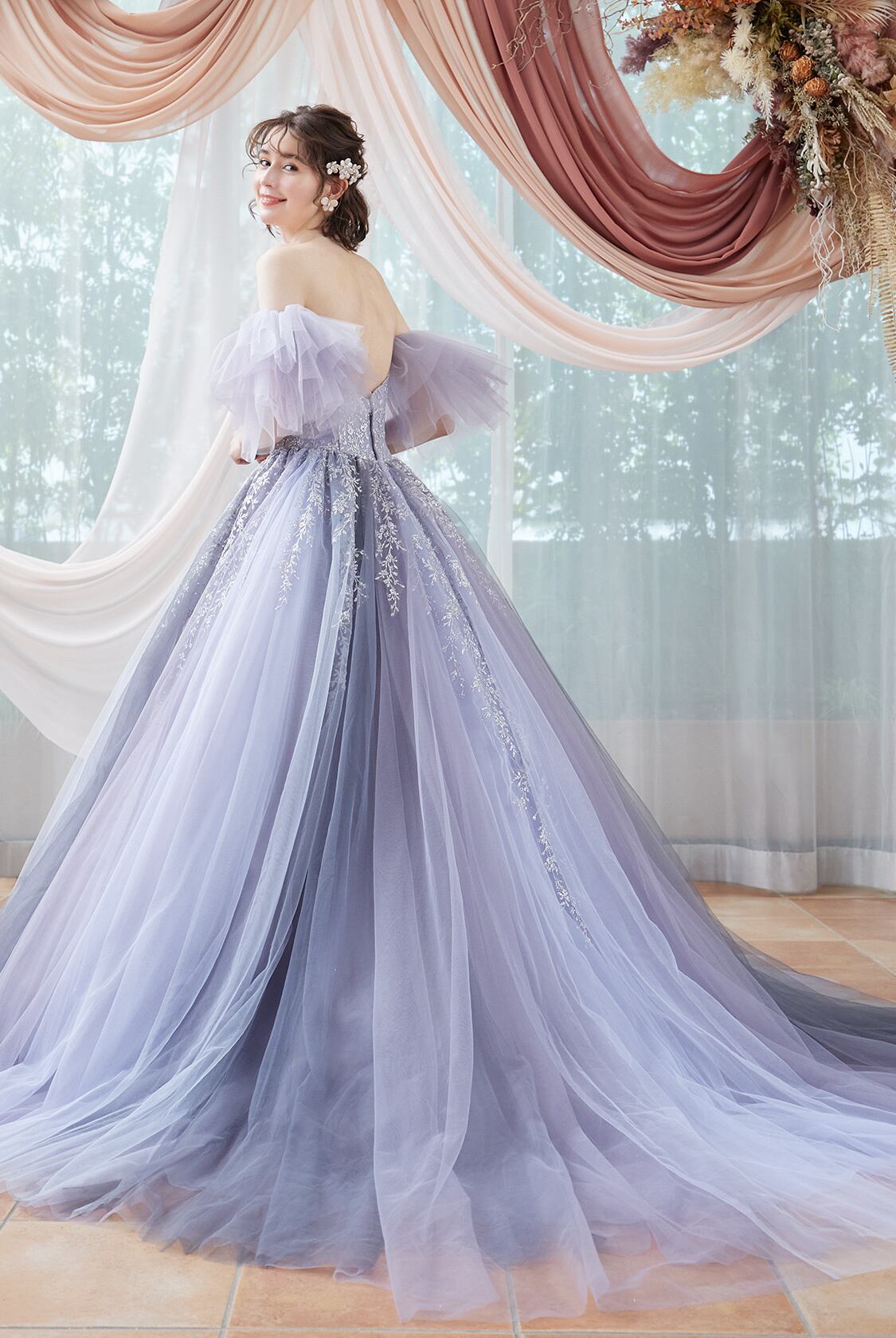 高品質!送料無料!カラードレス チュール袖 ラベンダー色 グラデーション かわいい 花柄のモチーフ刺繍が美しく エレガント 優雅 パープル/紫 ブルー ハンドメイド トレーン ソフトチュール オーダードレス ガーデンウェディング プリンセスライン パーティードレス 花嫁 豪華 結婚式/前撮り | David1021k Dress(ダヴィドレス)