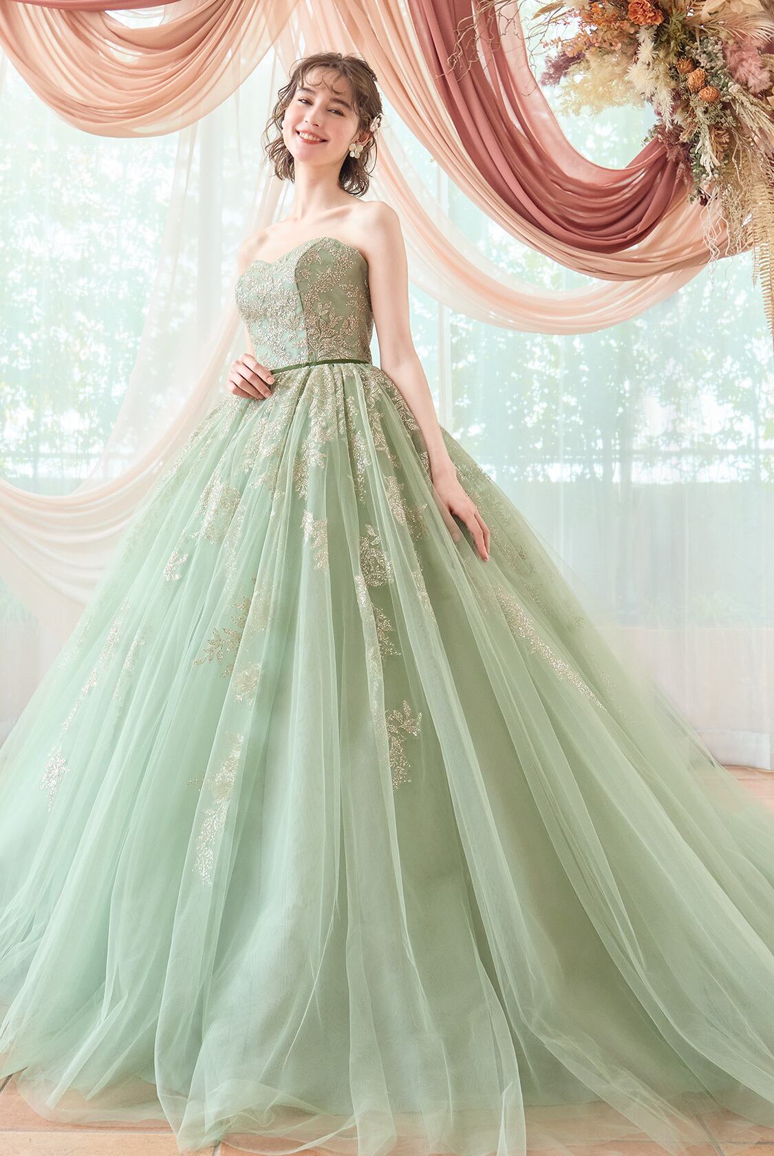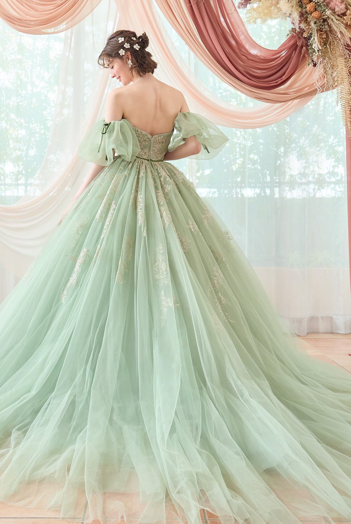 高品質!送料無料!カラードレス チュール袖 爽やかで優しいグリーン かわいい 花柄のモチーフ刺繍が美しく エレガント ベアトップ 優雅 ハンドメイド トレーン ソフトチュール オーダードレス ガーデンウェディング プリンセスライン パーティードレス 花嫁 豪華 結婚式/前撮り | David1021k Dress(ダヴィドレス)