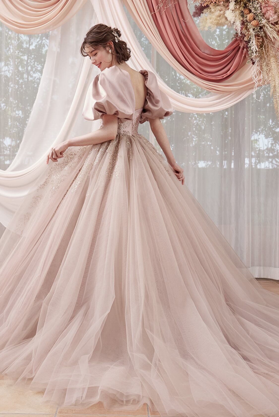 高品質!カラードレス ピンク パフスリーブ かわいいモチーフ エレガント 優雅 ハンドメイド トレーン ソフトチュール オーダードレス プリンセスライン パーティードレス 花嫁 豪華 結婚式/前撮り | David1021k Dress(ダヴィドレス)