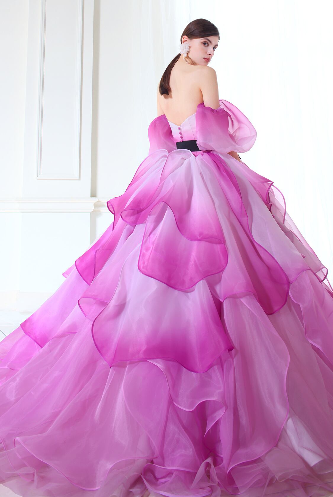 高品質!送料無料!カラードレス ベアトップ パープル/紫 パフスリーブ フリル うねり かわいい エレガント 優雅 合コン パーティードレス オーダードレス ハンドメイド 花嫁 トレーン 結婚式/前撮り/演奏会/音楽会 | David1021k Dress(ダヴィドレス)