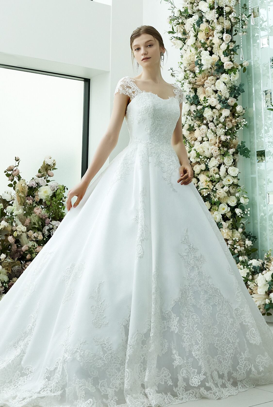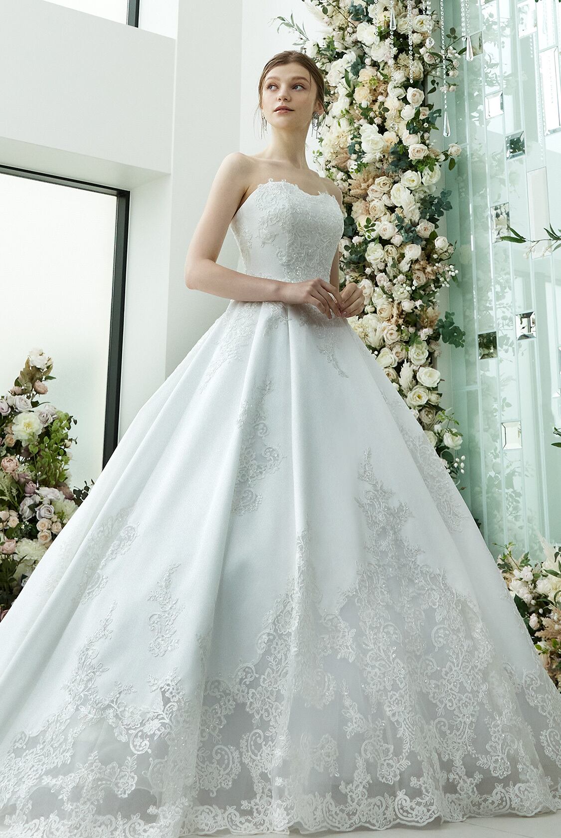 高品質!送料無料!ウエディングドレス ベアトップ キャミソール かわいい 上品レース エレガント ハンドメイド プリンセスライン 抜群のおしゃれ見え 贅沢なレーストレーン 華やかなトレーン オーダードレス オーダーメイド 花柄のモチーフ刺繍が美しく 花嫁 豪華 結婚式/前撮り | David1021k Dress(ダヴィドレス)