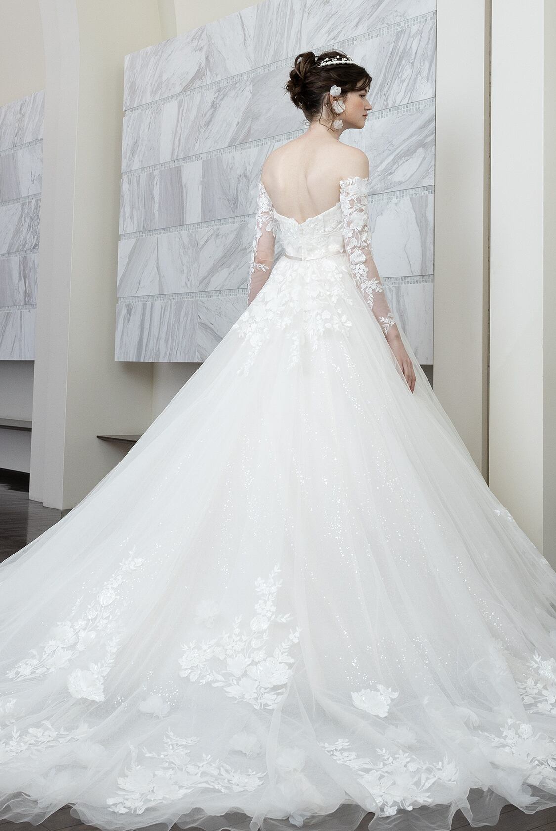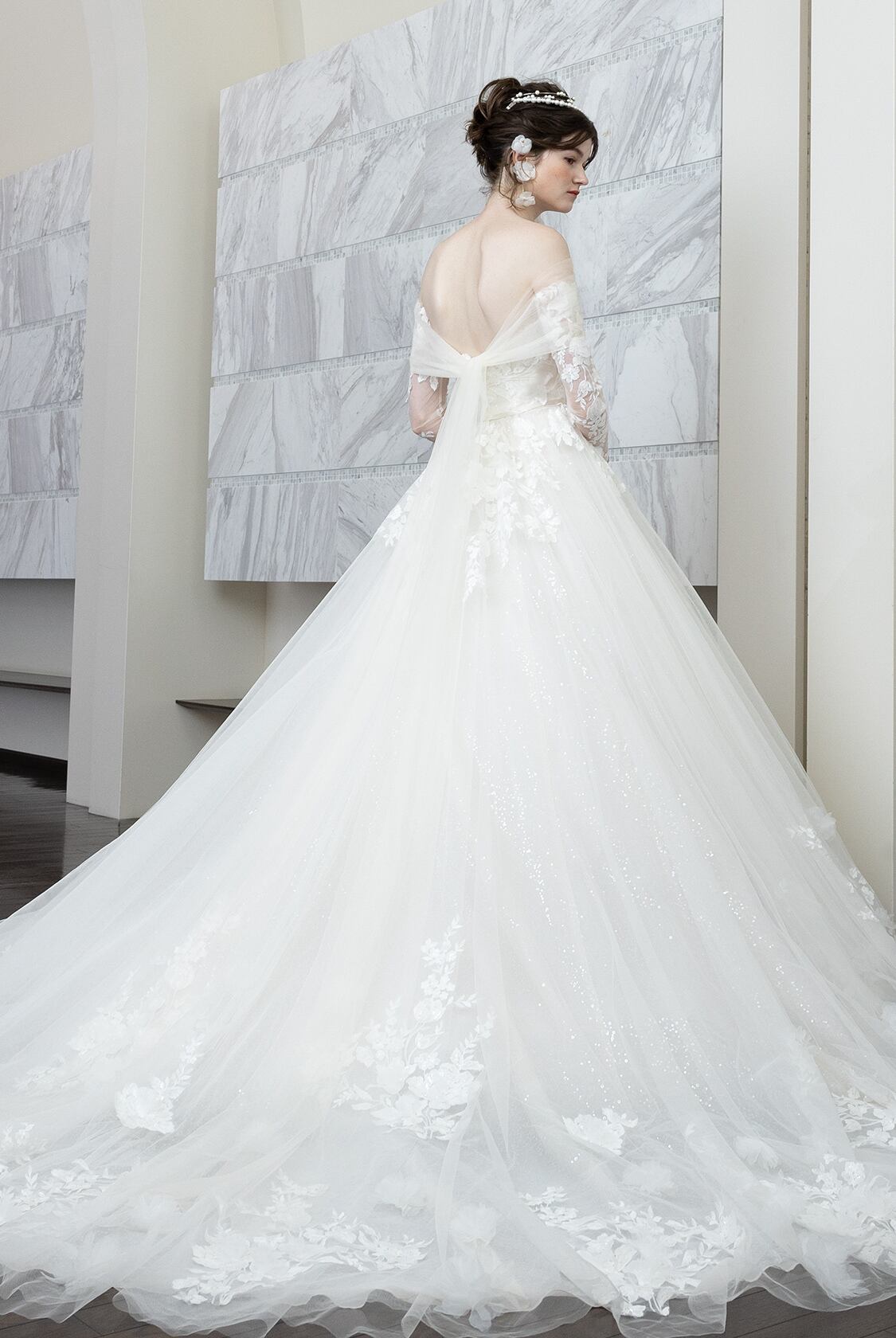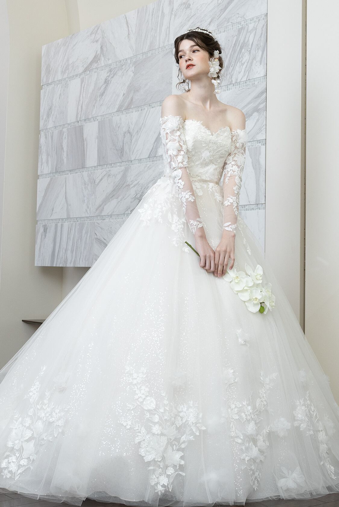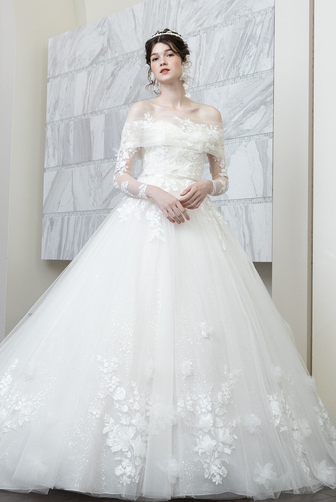 高品質!送料無料!ウエディングドレス ベアトップ 付け袖 かわいい オフショルダー 上品レース 花柄のモチーフ刺繍が美しく エレガント ハンドメイド ロールカラー プリンセスライン 抜群のおしゃれ見え トレーン オーダードレス オーダーメイド 花嫁 豪華 結婚式/前撮り