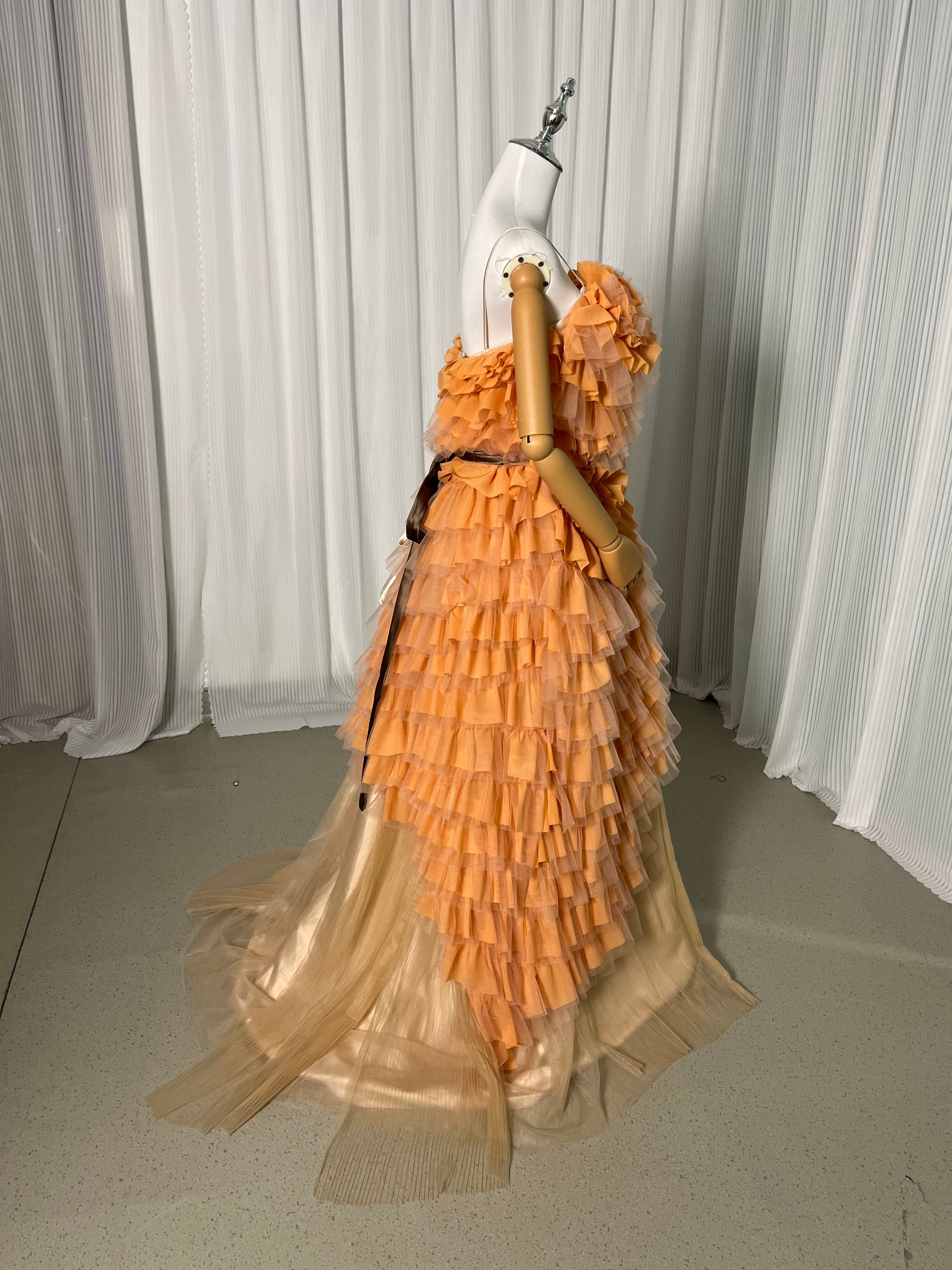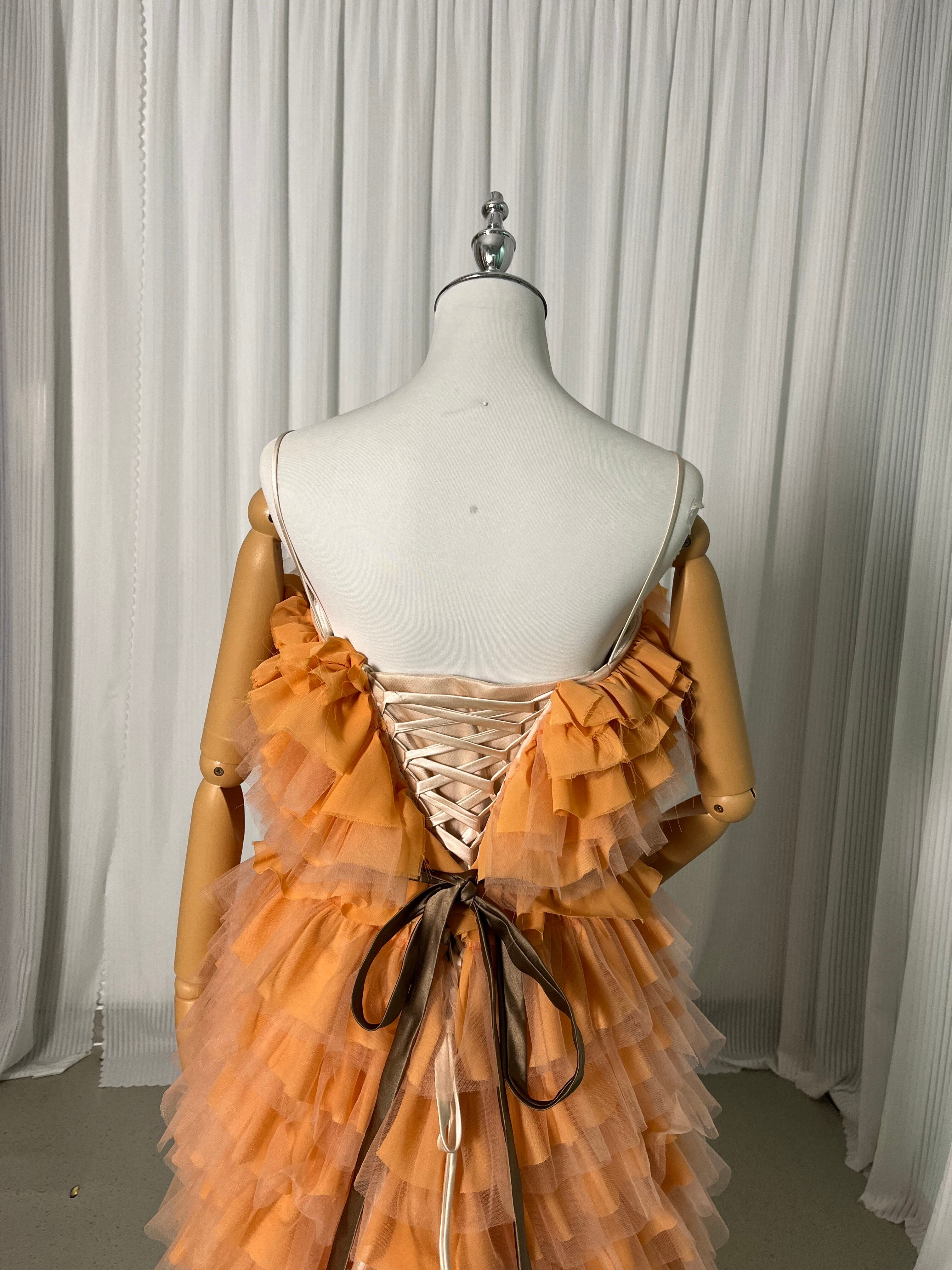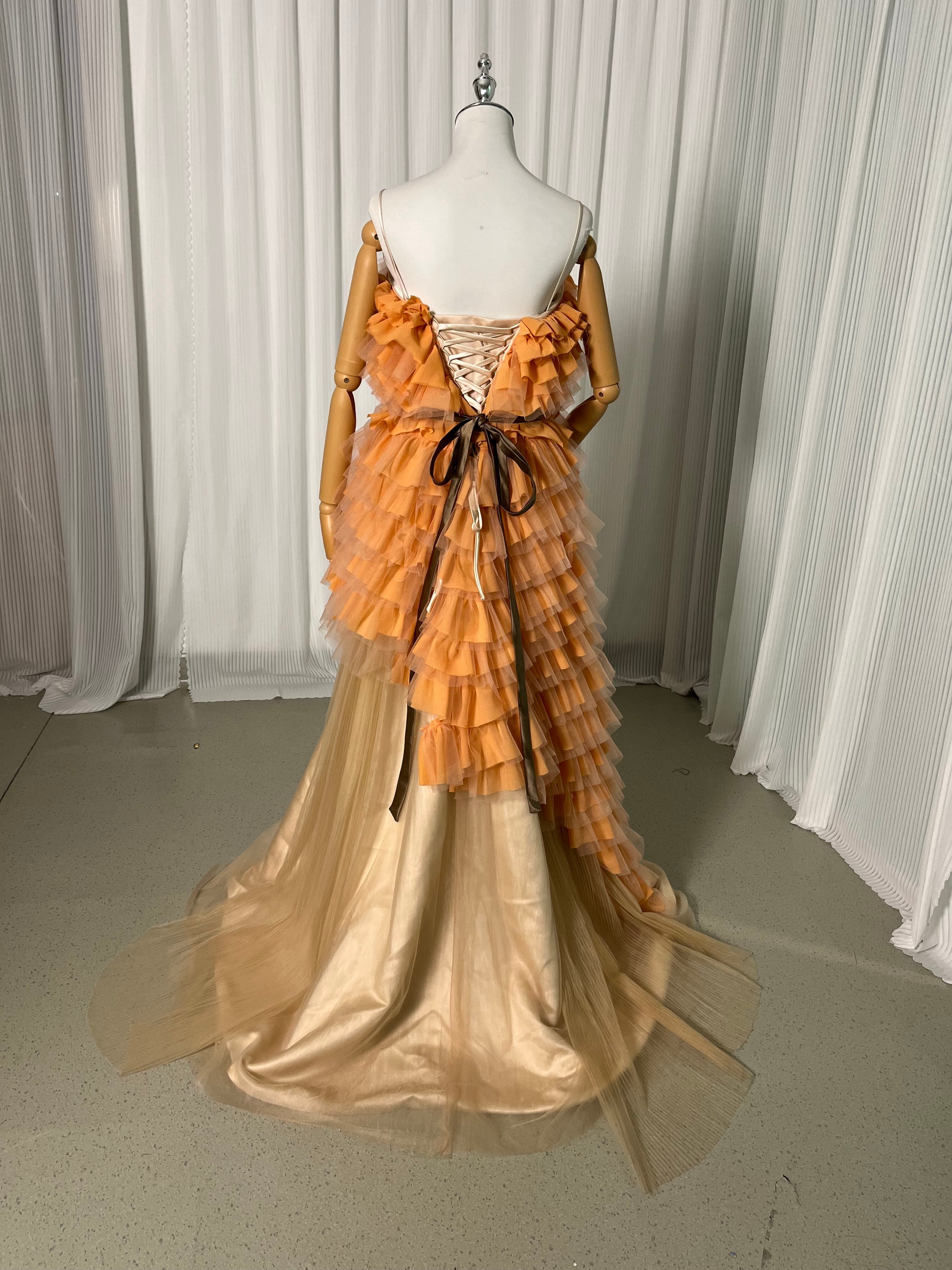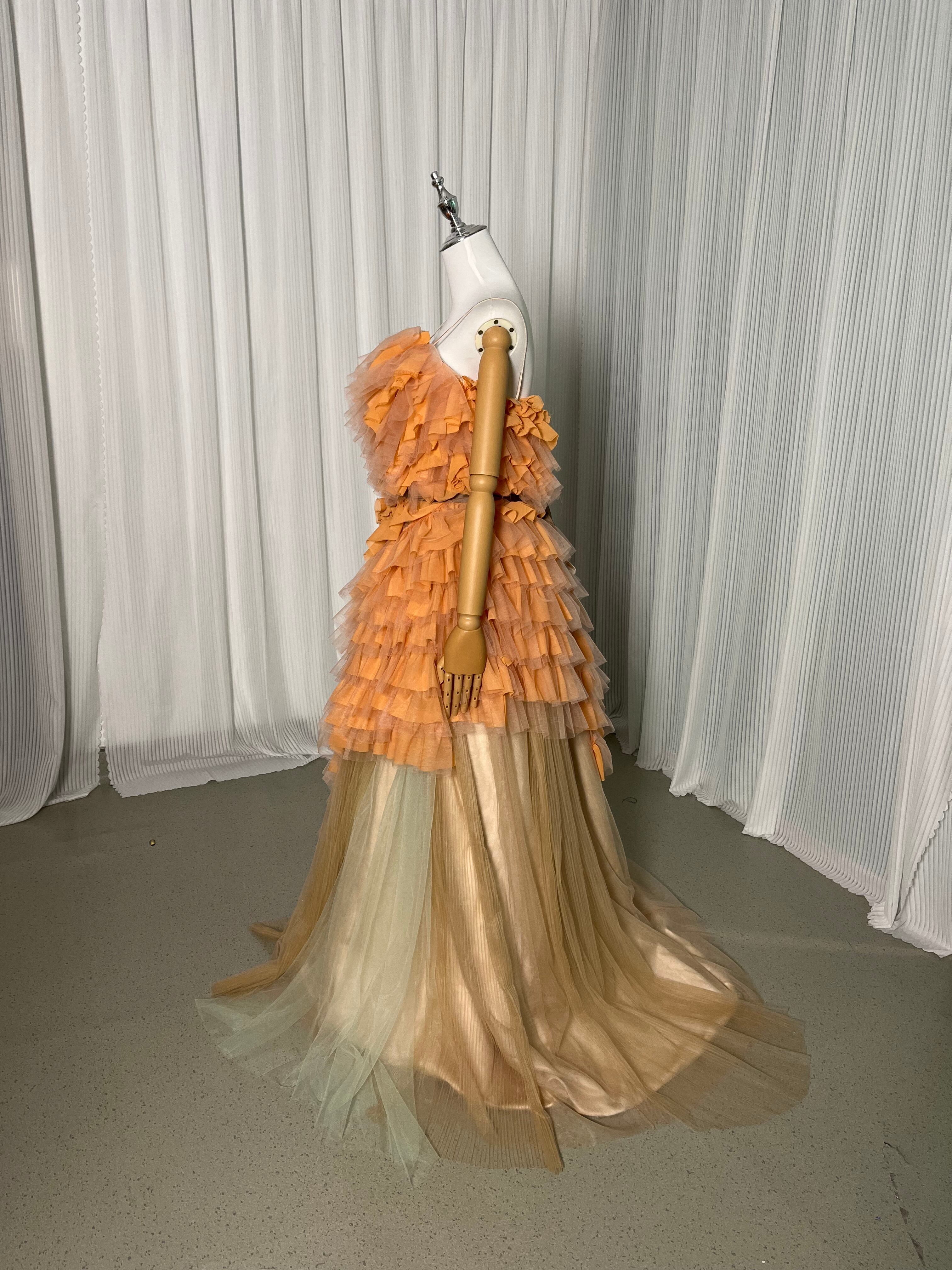 人気上昇! オレンジ カラードレス ソフトチュール アシメドレス 柔らかく重ねたチュールスカート結婚式/披露宴/前撮り