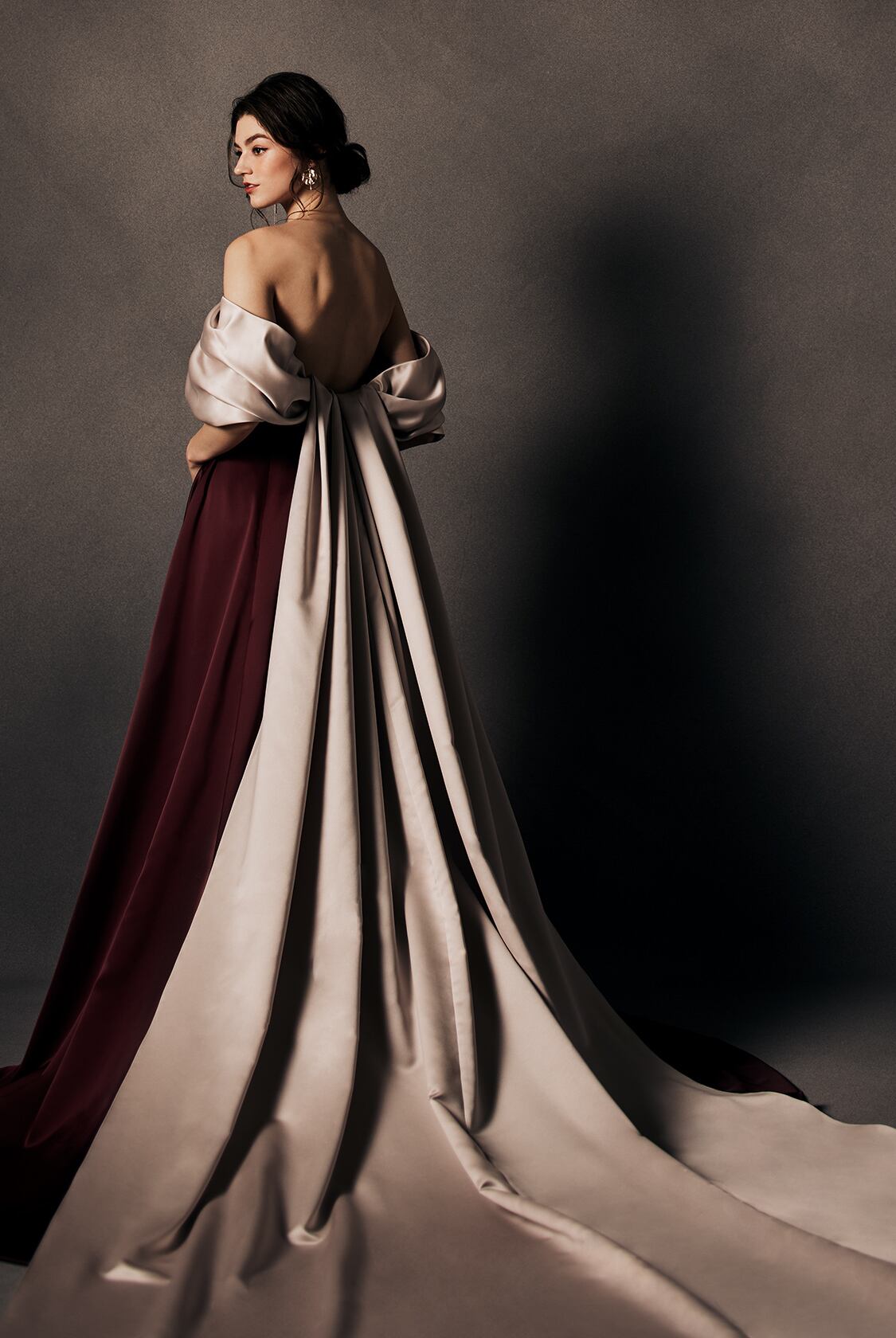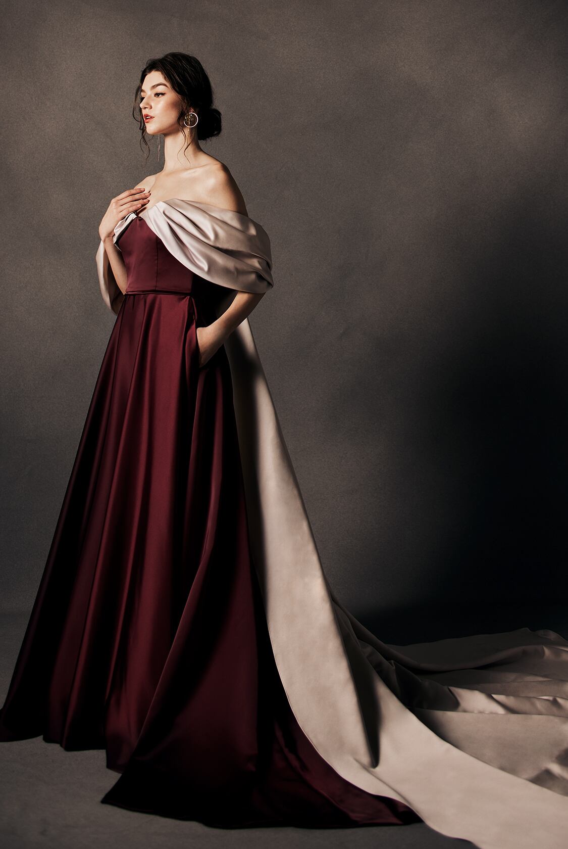 高品質!送料無料!カラードレス ワインレッド オフショルダー ベアトップ リボン かわいい 豪華 高級サテン エレガント ハンドメイド 華やかなトレーン オーダードレス パーティードレス 花嫁 豪華 結婚式/前撮り | David1021k Dress(ダヴィドレス)