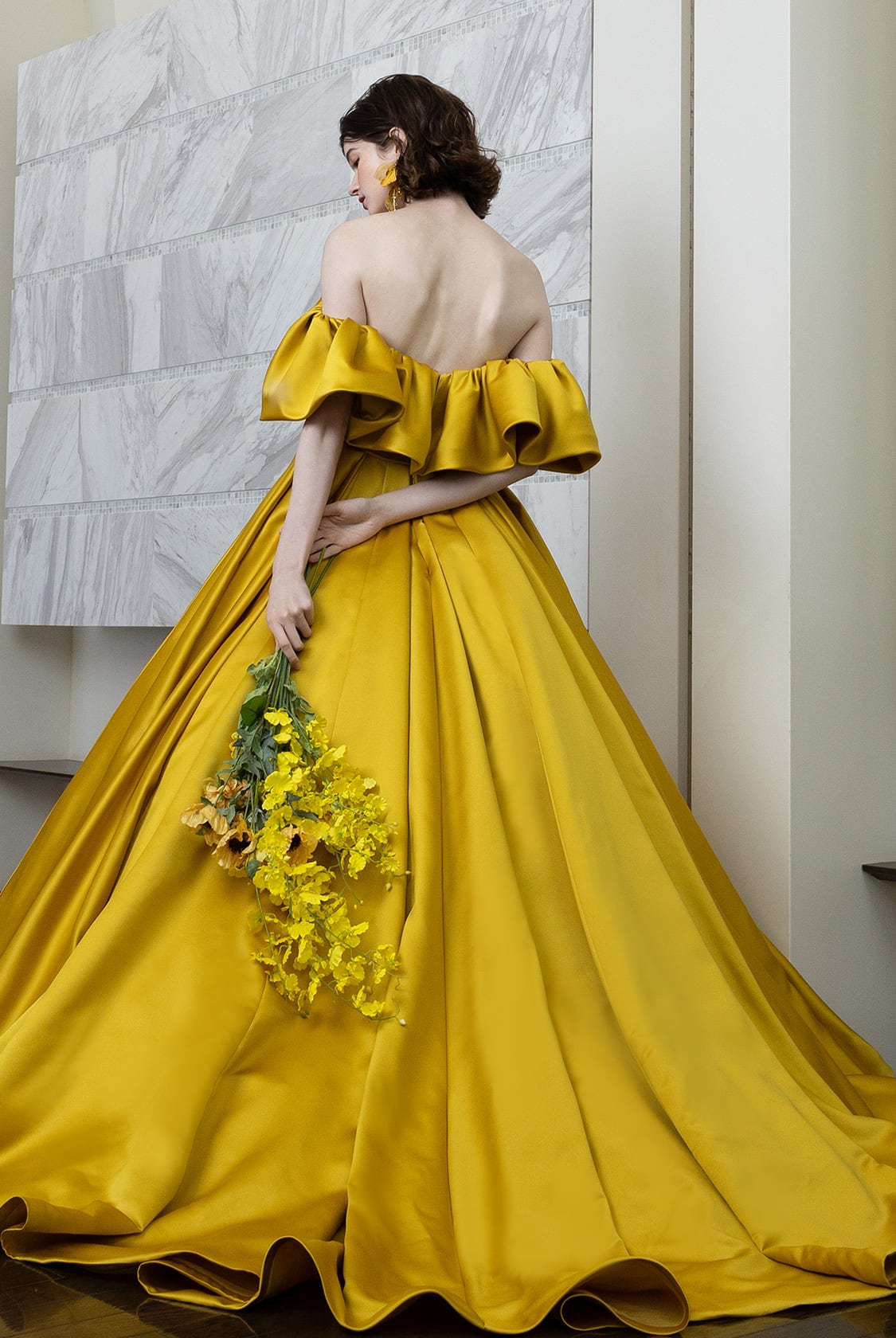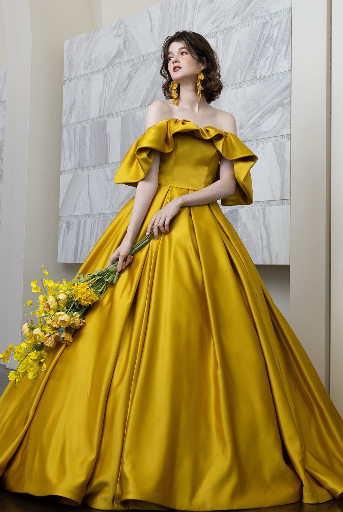 高品質!送料無料!カラードレス マスタード色 イエロー/黄色い オフショルダー かわいい 豪華 エレガント ハンドメイド トレーン オーダードレス 花嫁 ピアノ ステージ パーティードレス 演奏ドレス 豪華 結婚式/前撮り | David1021k Dress(ダヴィドレス)