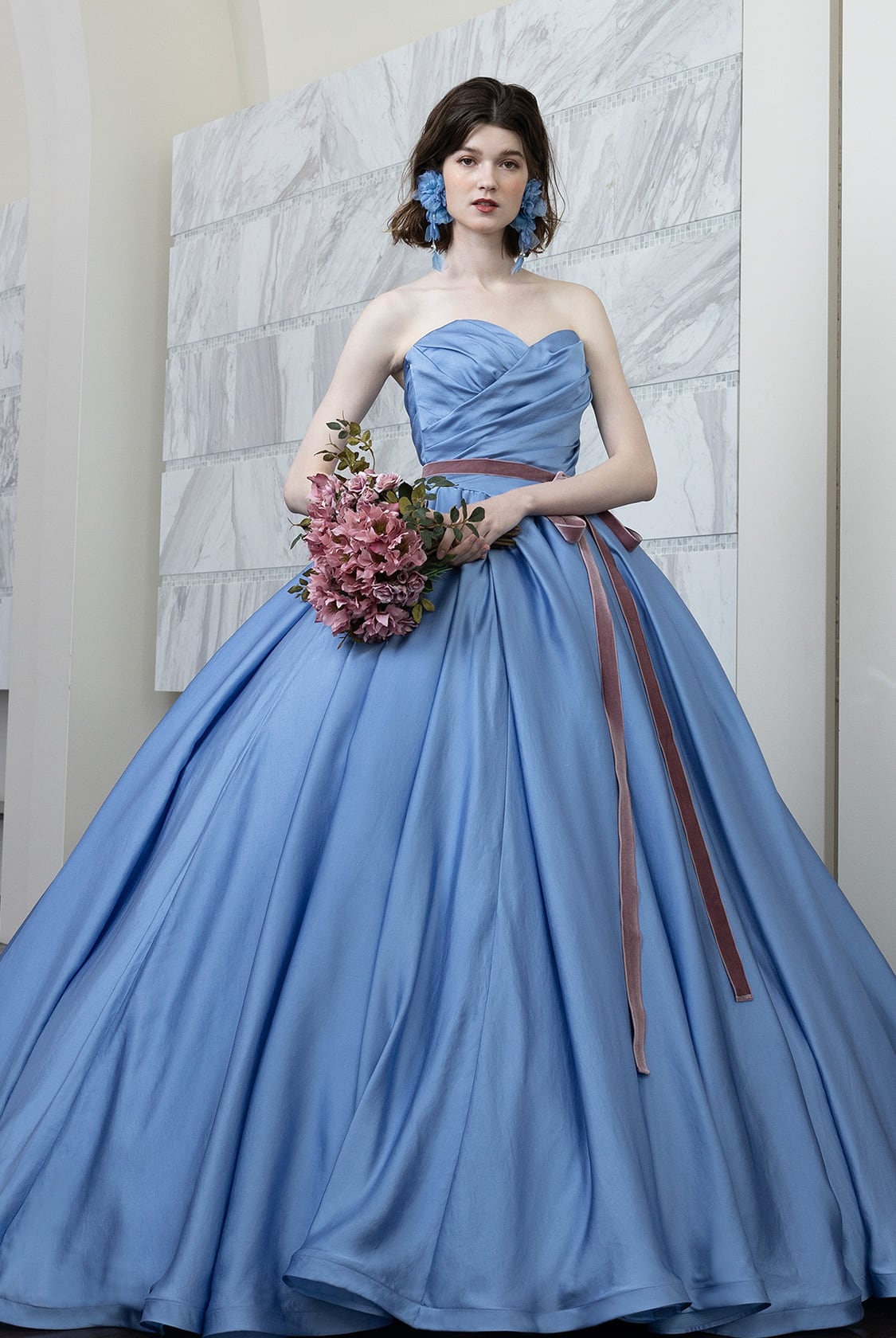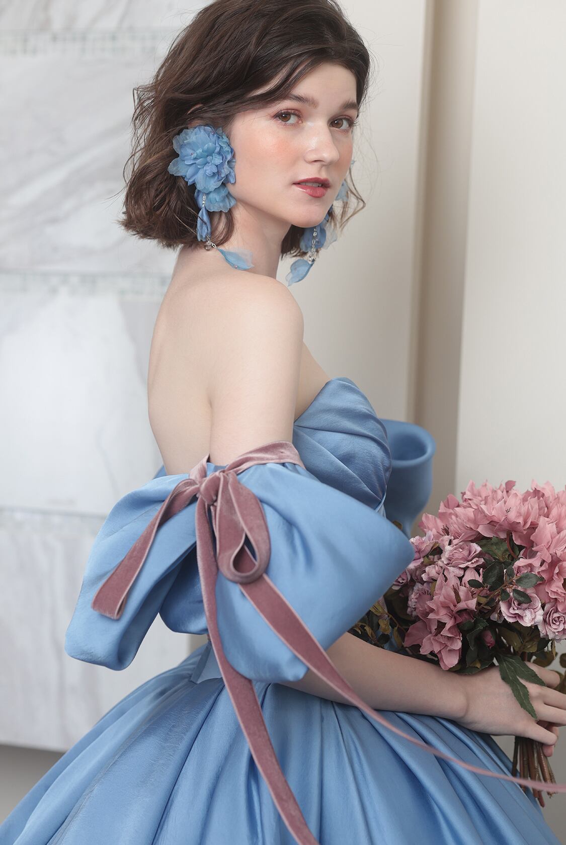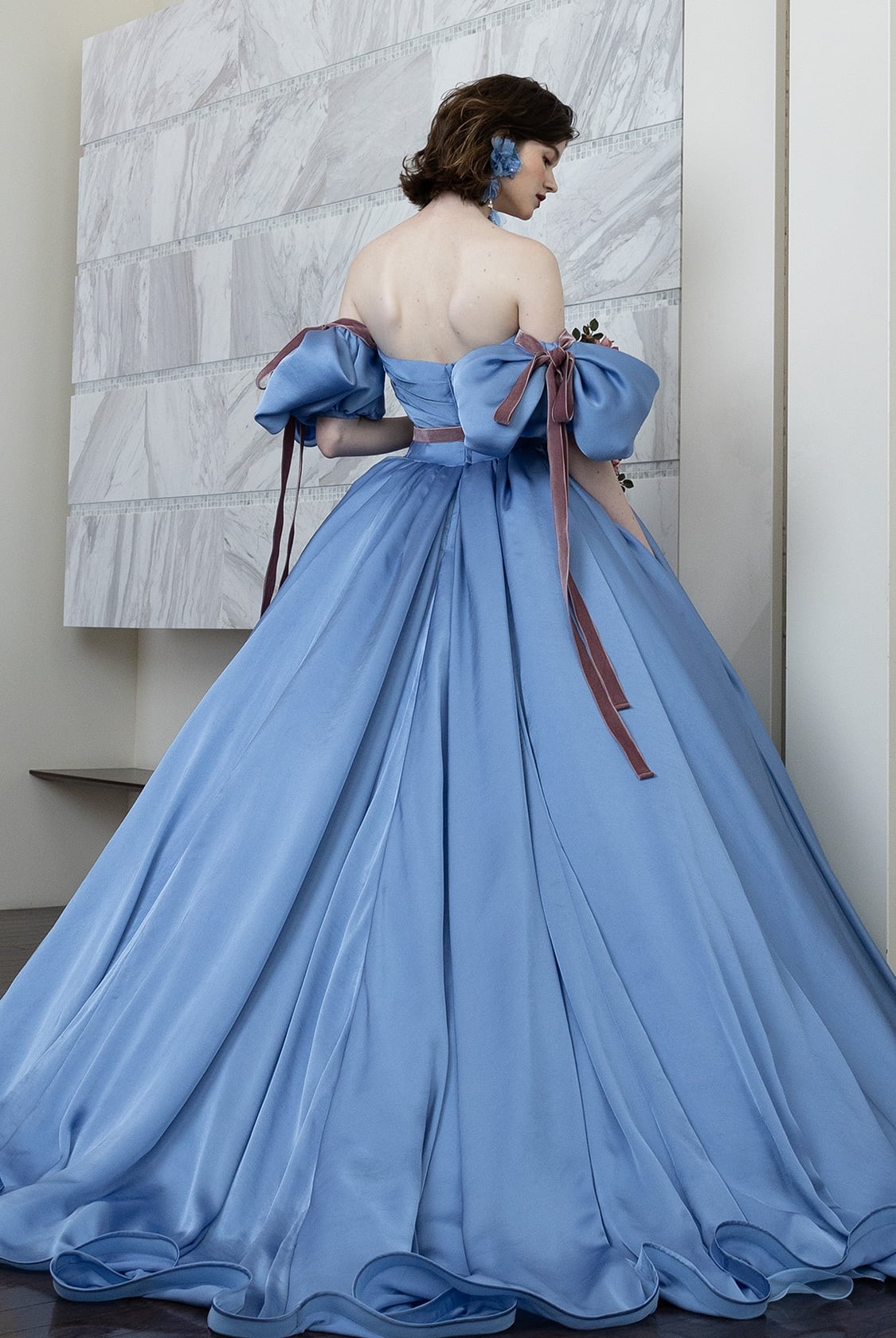 高品質!送料無料!カラードレス ブルー/青 パフスリーブ ベアトップ かわいい 豪華 エレガント ハンドメイド トレーン 優雅 オーダードレス パーティードレス 花嫁 結婚式/前撮り | David1021k Dress(ダヴィドレス)