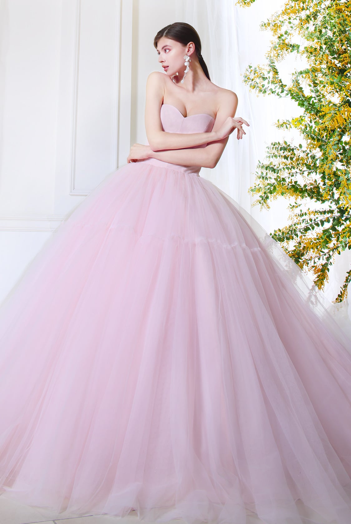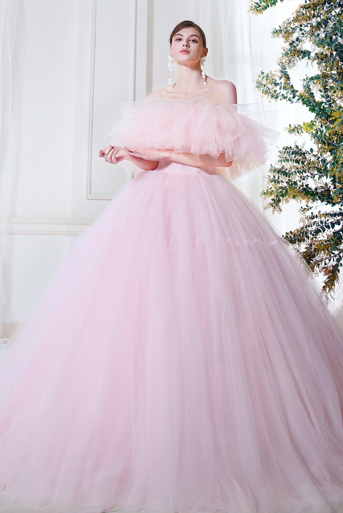 高品質!送料無料!カラードレス 薄ピンク オフショルダー ソフトチュール ベアトップ かわいい 豪華 エレガント ハンドメイド トレーン 優雅 オーダードレス パーティードレス 花嫁 結婚式/前撮り | David1021k Dress(ダヴィドレス)