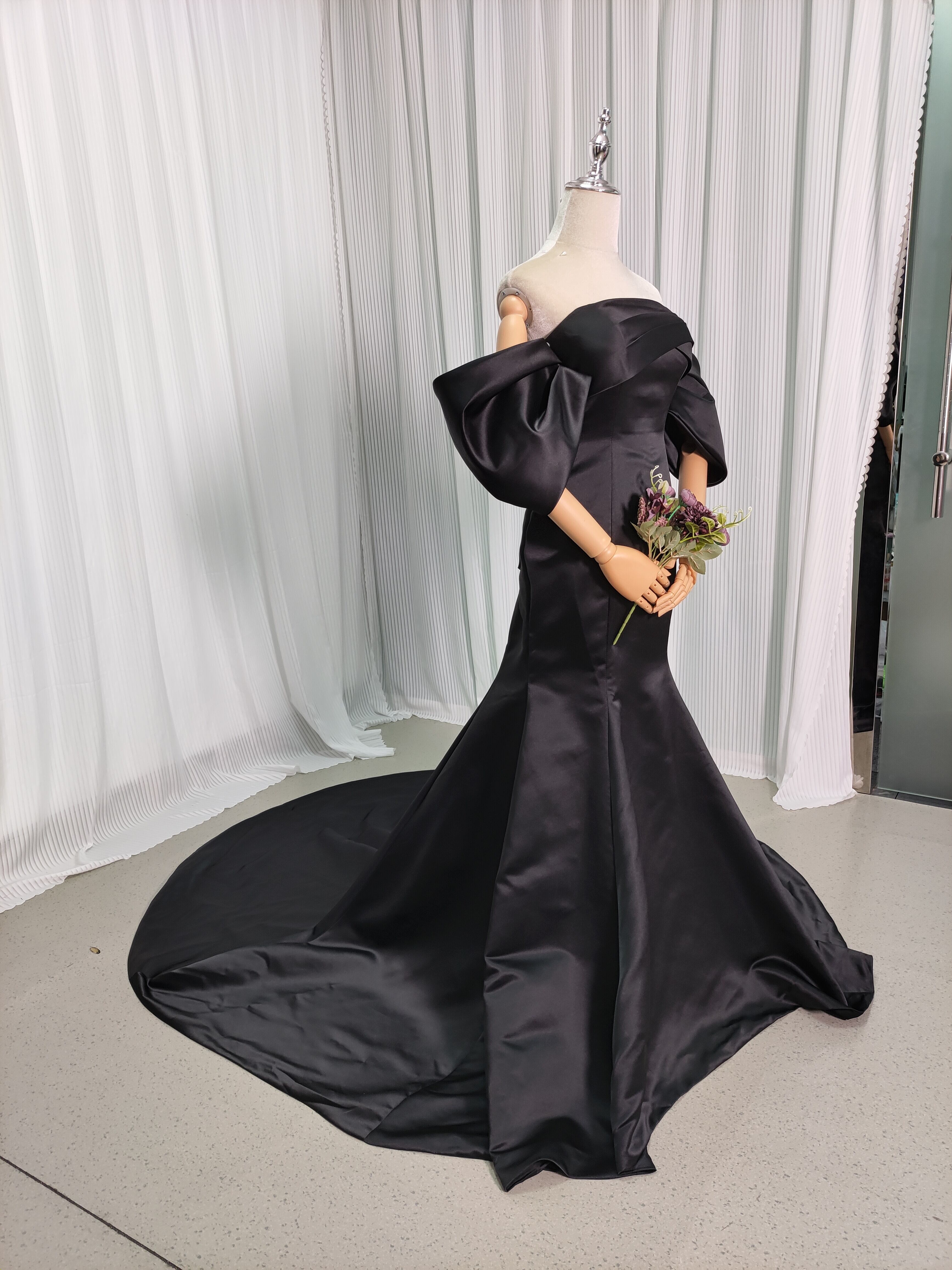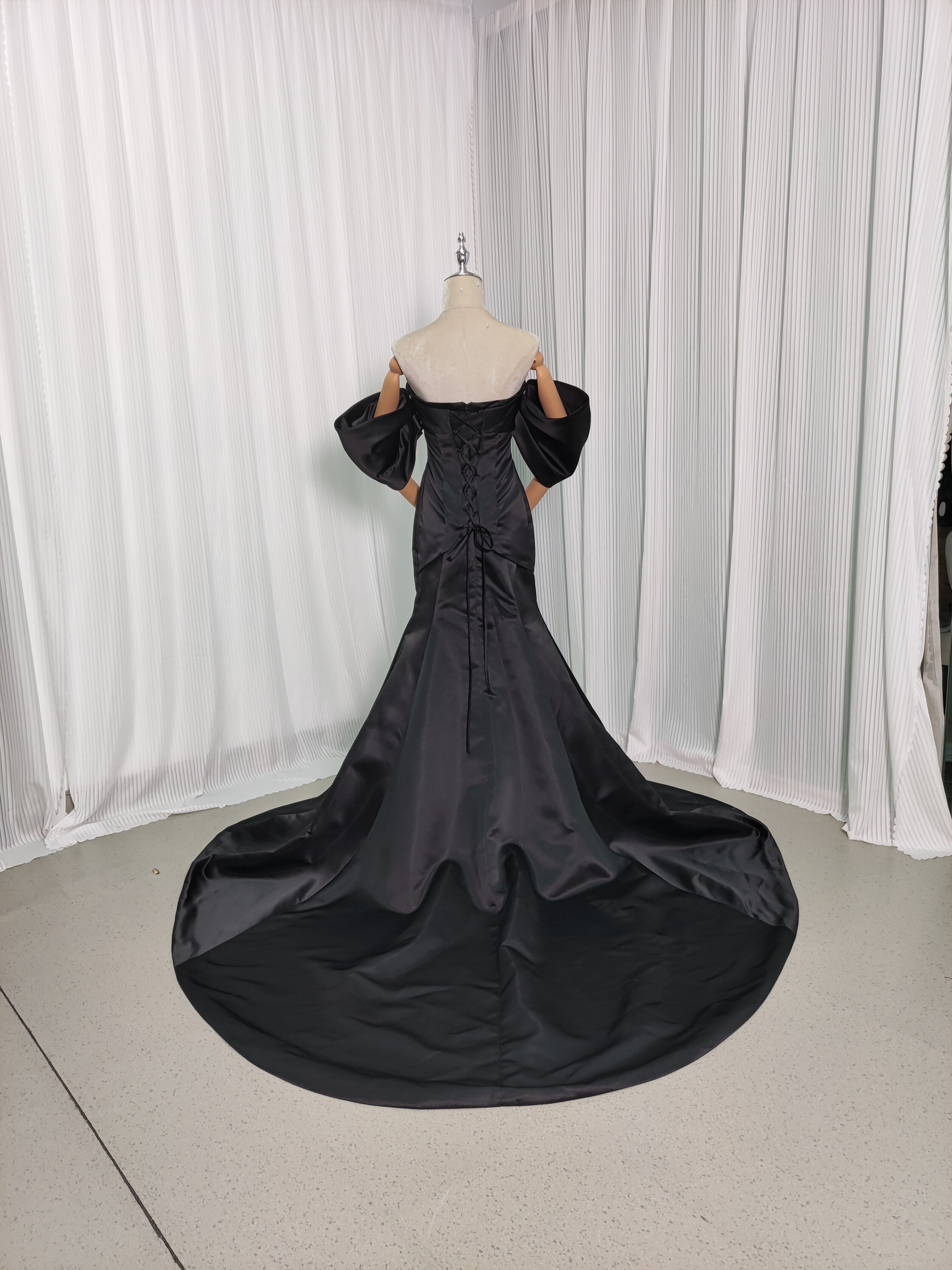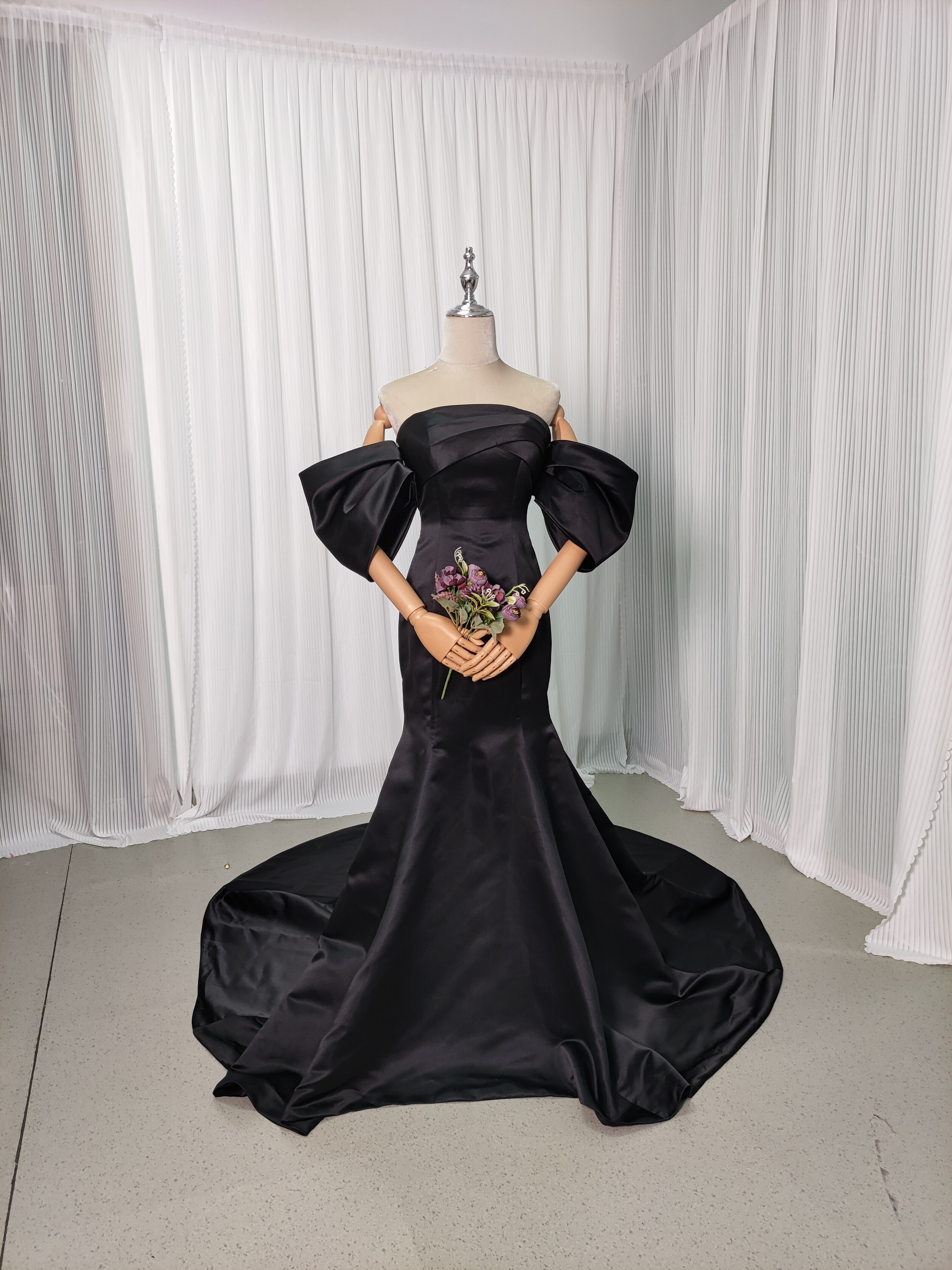 送料無料!パフスリーブのオフショルダー カラードレス /黒 ド マーメイドライ 花嫁 結婚式/前撮り