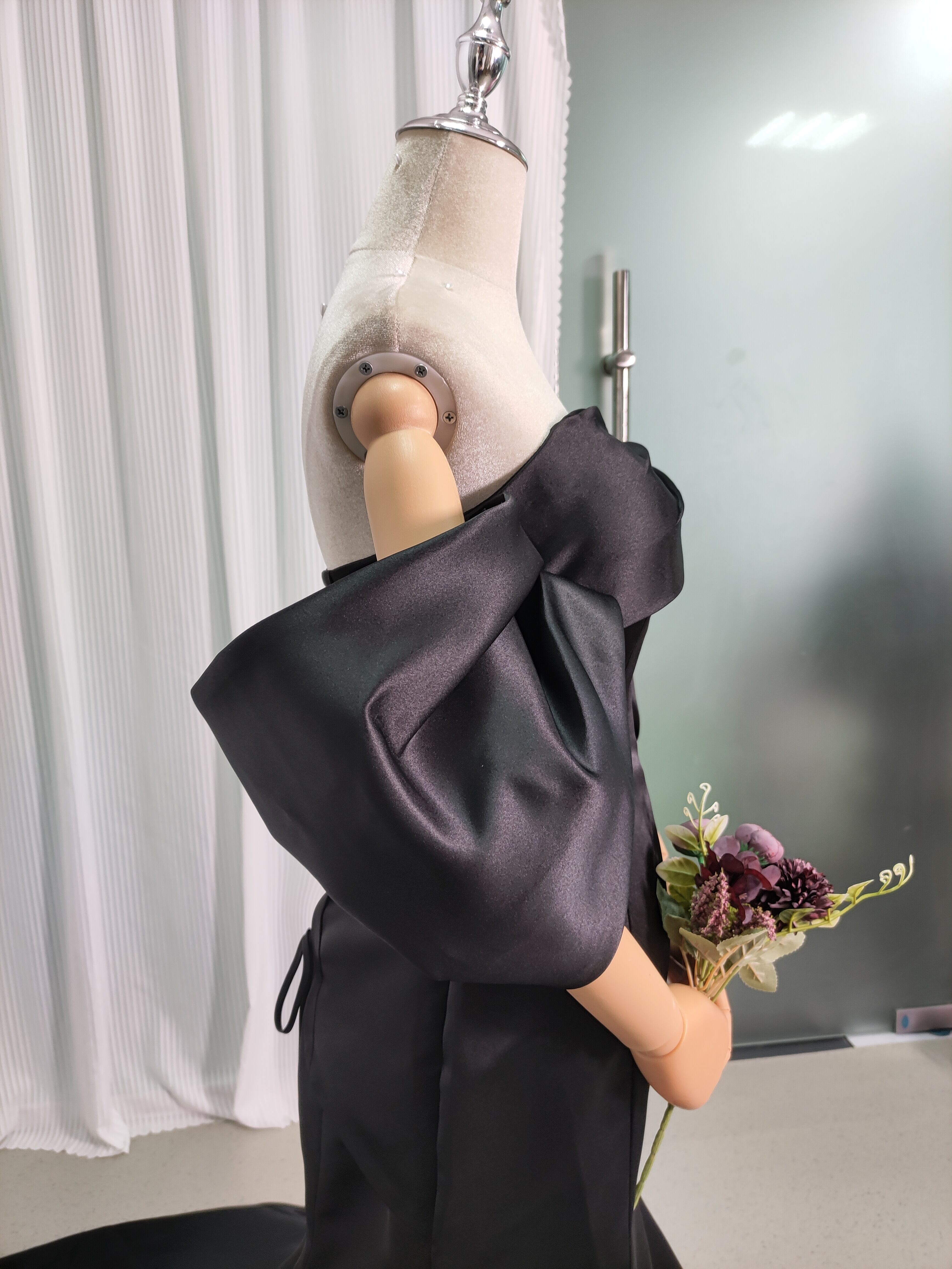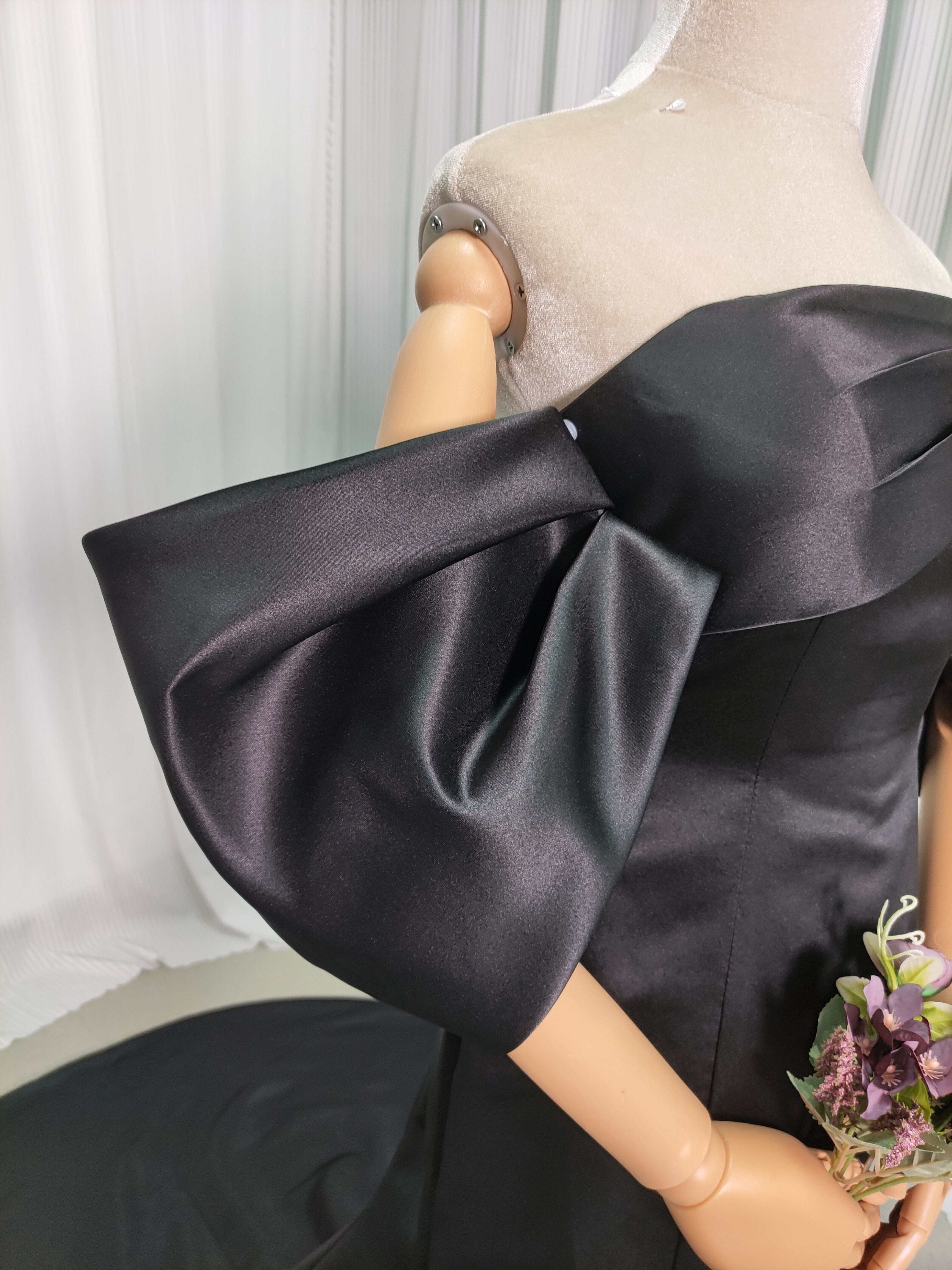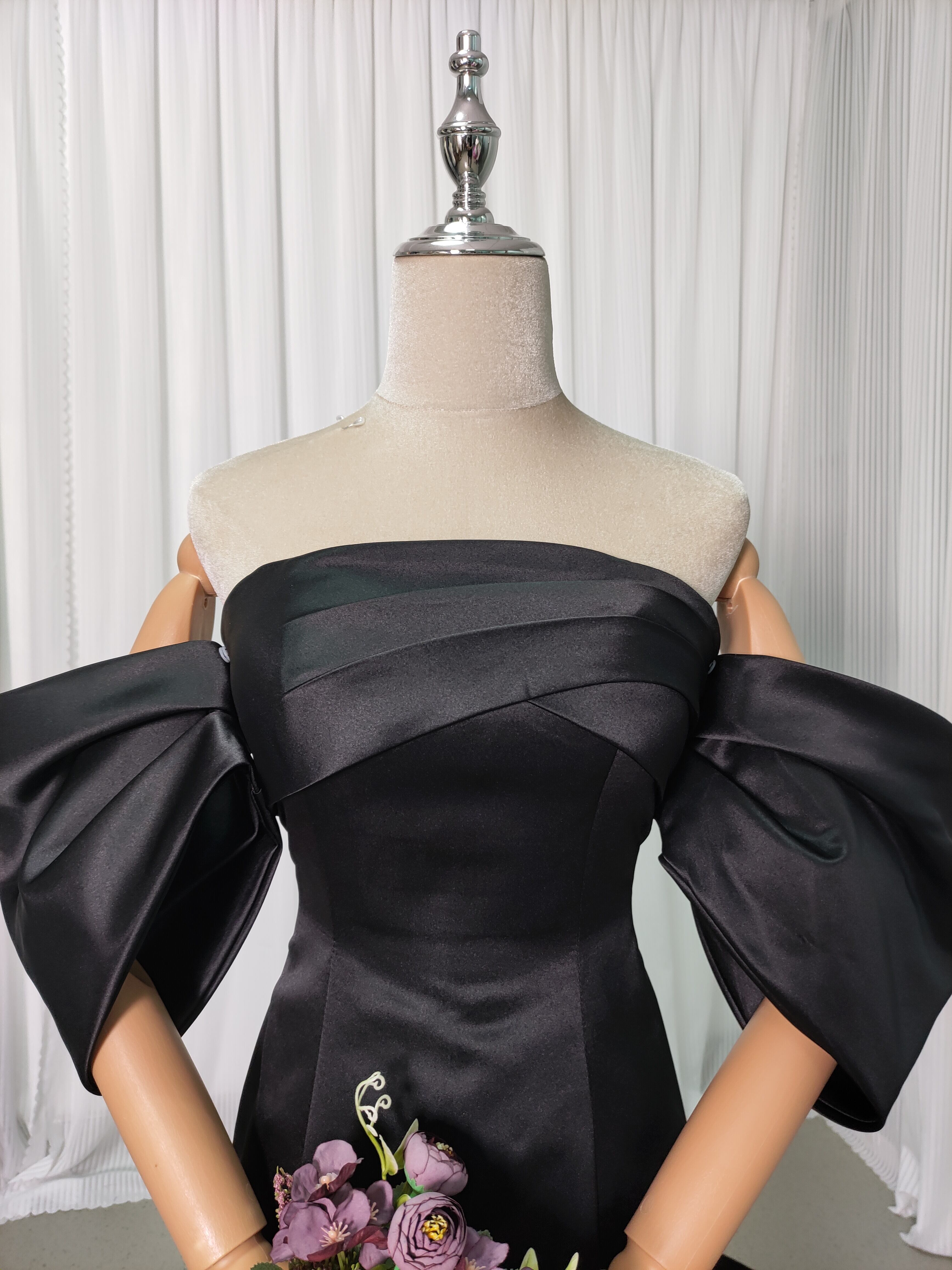 送料無料!パフスリーブのオフショルダー カラードレス /黒 ド マーメイドライ 花嫁 結婚式/前撮り